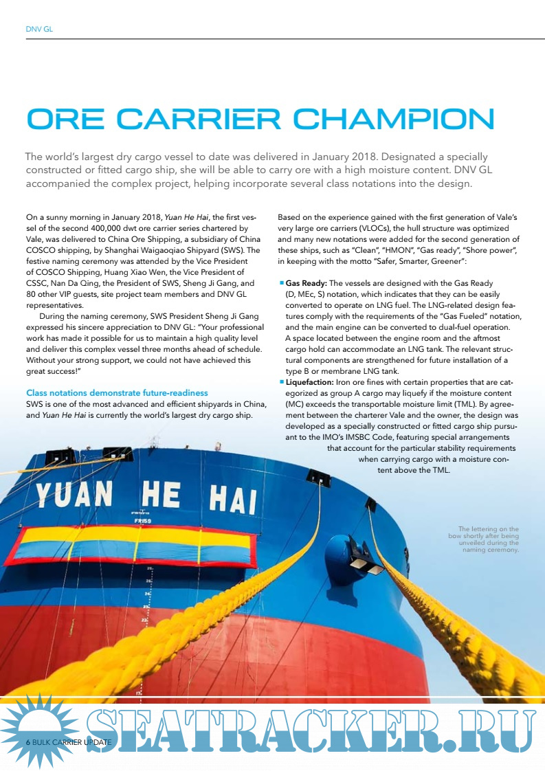 - the recent delivery of the world’s largest dry cargo vessel – Yuan He Hai, a 400,000 dwt ore carrier with innovative design features such as gas-ready. Also, as a specially constructed or fitted cargo ship she will be able to safely carry ore with a high moisture content