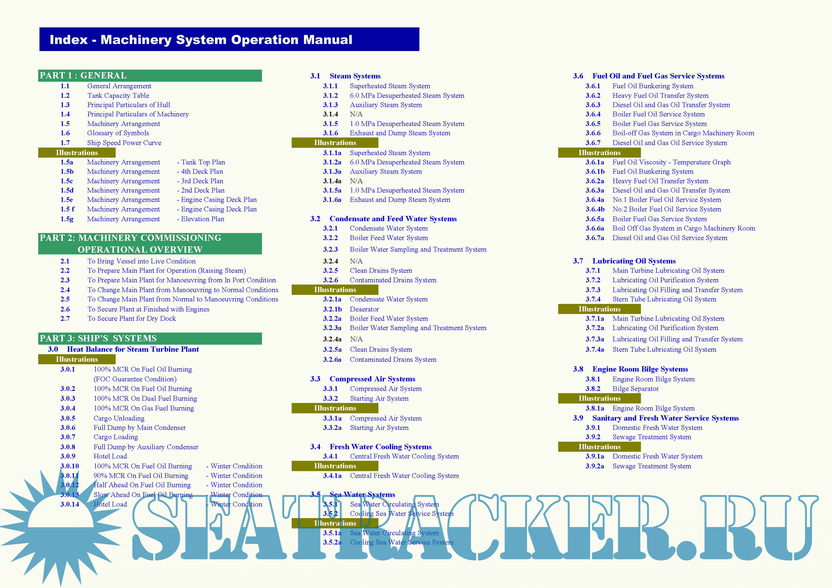 The purpose of this manual about MACHINERY OPERATING MANUAL is to fill some of the gaps about this item and to provide the ship’s officers with additional information not otherwise available on board. It is intended to be used in conjunction with the other plans and instruction books already on board and in no way replaces or supersedes them.