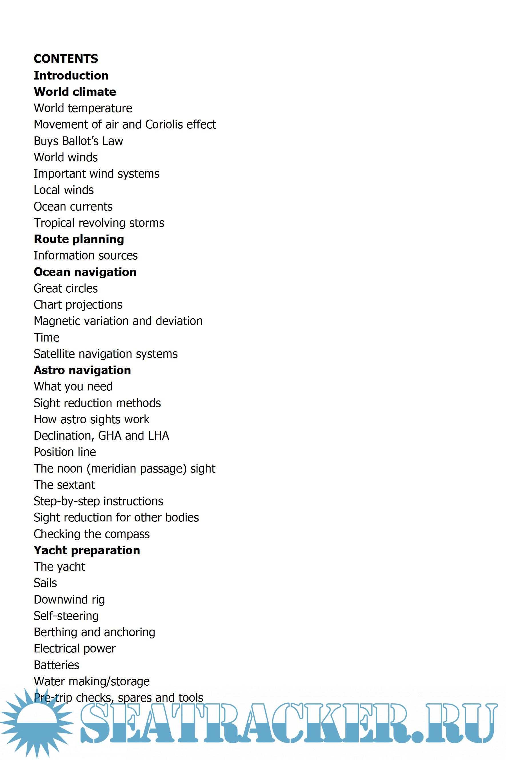 - Navigation (charts, great circle vs. Mercator routes, time zones, satellite navigation systems, advice on on-passage navigation routines)