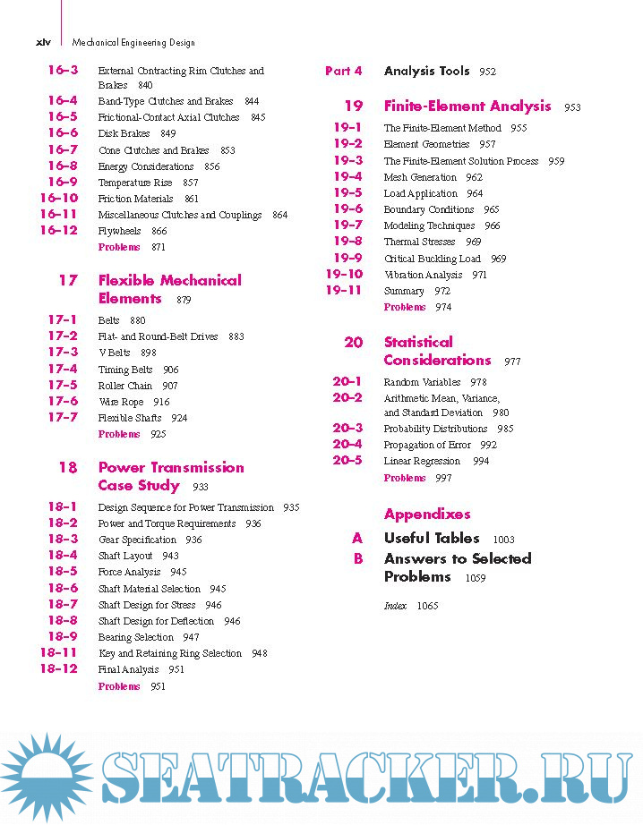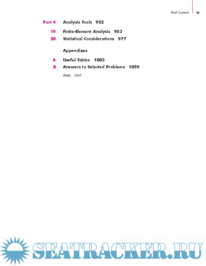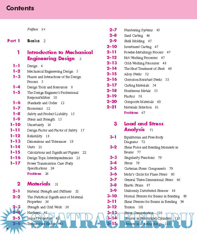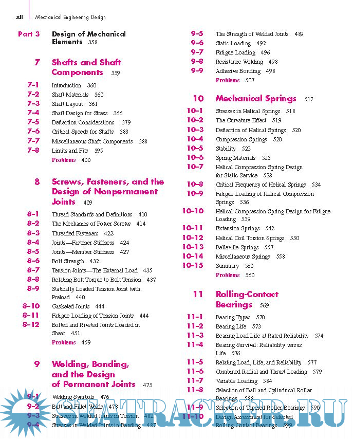 Year: 2011 Language: english Author: Richard G. Budynas & J. Keith Nisbett Genre: Textbook Publisher: McGraw-Hill Edition: 9th ISBN: 978–0–07–352928–8 Format: PDF Quality: eBook Pages count: 1109 Description: This text is intended for students beginning the study of mechanical engineering design. The focus is on blending fundamental development of concepts with practical specification of components. Students of this text should find that it inherently directs them into familiarity with both the basis for decisions and the standards of industrial components. For this reason, as students transition to practicing engineers, they will find that this text is indispensable as a reference text. The objectives of the text are to: • Cover the basics of machine design, including the design process, engineering mechanics and materials, failure prevention under static and variable loading, and characteristics of the principal types of mechanical elements • Offer a practical approach to the subject through a wide range of real-world applications and examples • Encourage readers to link design and analysis • Encourage readers to link fundamental concepts with practical component specification
