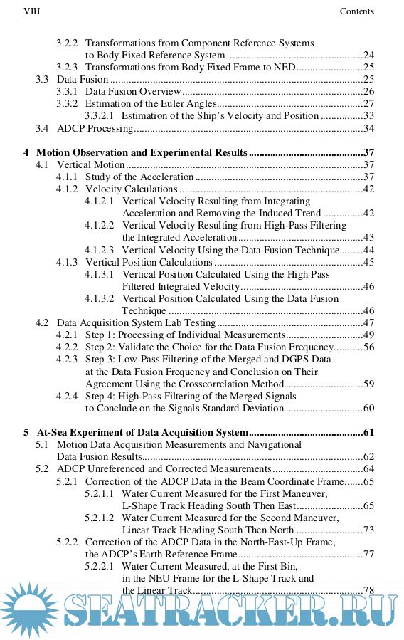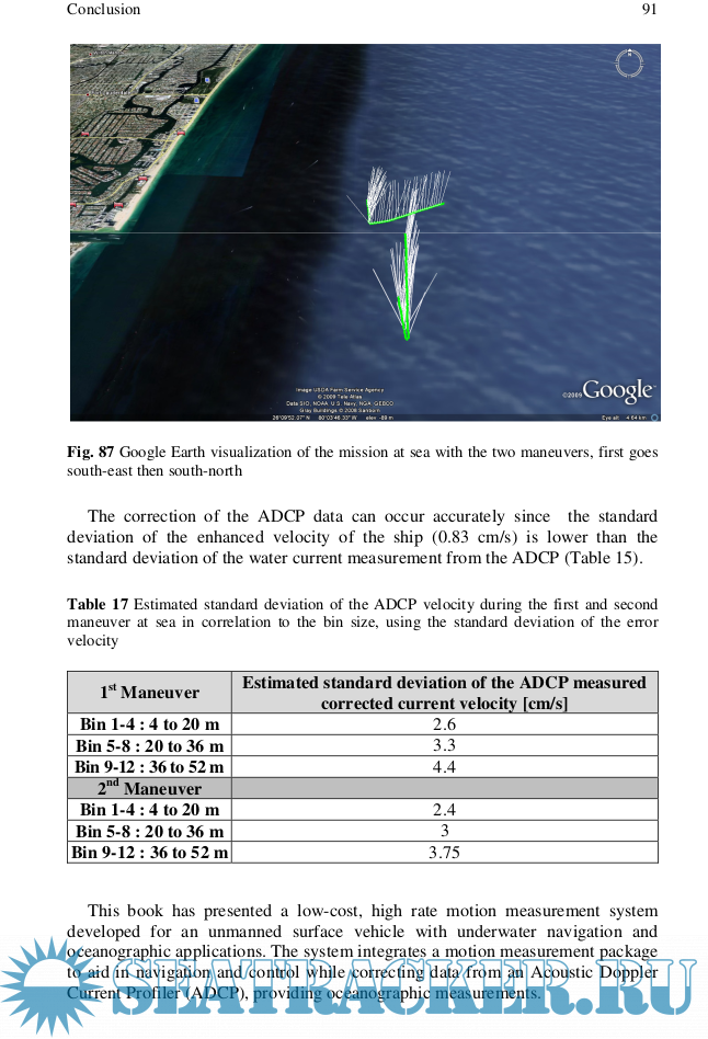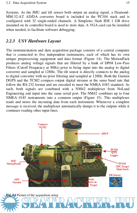 Description: Dead-Reckoning aided with Doppler velocity measurement has been the most common method for underwater navigation for small vehicles. Unfortunately DR requires frequent position recalibrations and underwater vehicle navigation systems are limited to periodic position update when they surface. Finally standard Global Positioning System (GPS) receivers are unable to provide the rate or precision required when used on a small vessel. To overcome this, a low cost high rate motion measurement system for an Unmanned Surface Vehicle (USV) with underwater and oceanographic purposes is proposed. The proposed onboard system for the USV consists of an Inertial Measurement Unit (IMU) with accelerometers and rate gyros, a GPS receiver, a flux-gate compass, a roll and tilt sensor and an ADCP. Interfacing all the sensors proved rather challenging because of their different characteristics. The proposed data fusion technique integrates the sensors and develops an embeddable software package, using real time data fusion methods, for a USV to aid in navigation and control as well as controlling an onboard Acoustic Doppler Current Profiler (ADCP). While ADCPs non-intrusively measure water flow, the vessel motion needs to be removed to analyze the data and the system developed provides the motion measurements and processing to accomplish this task.
