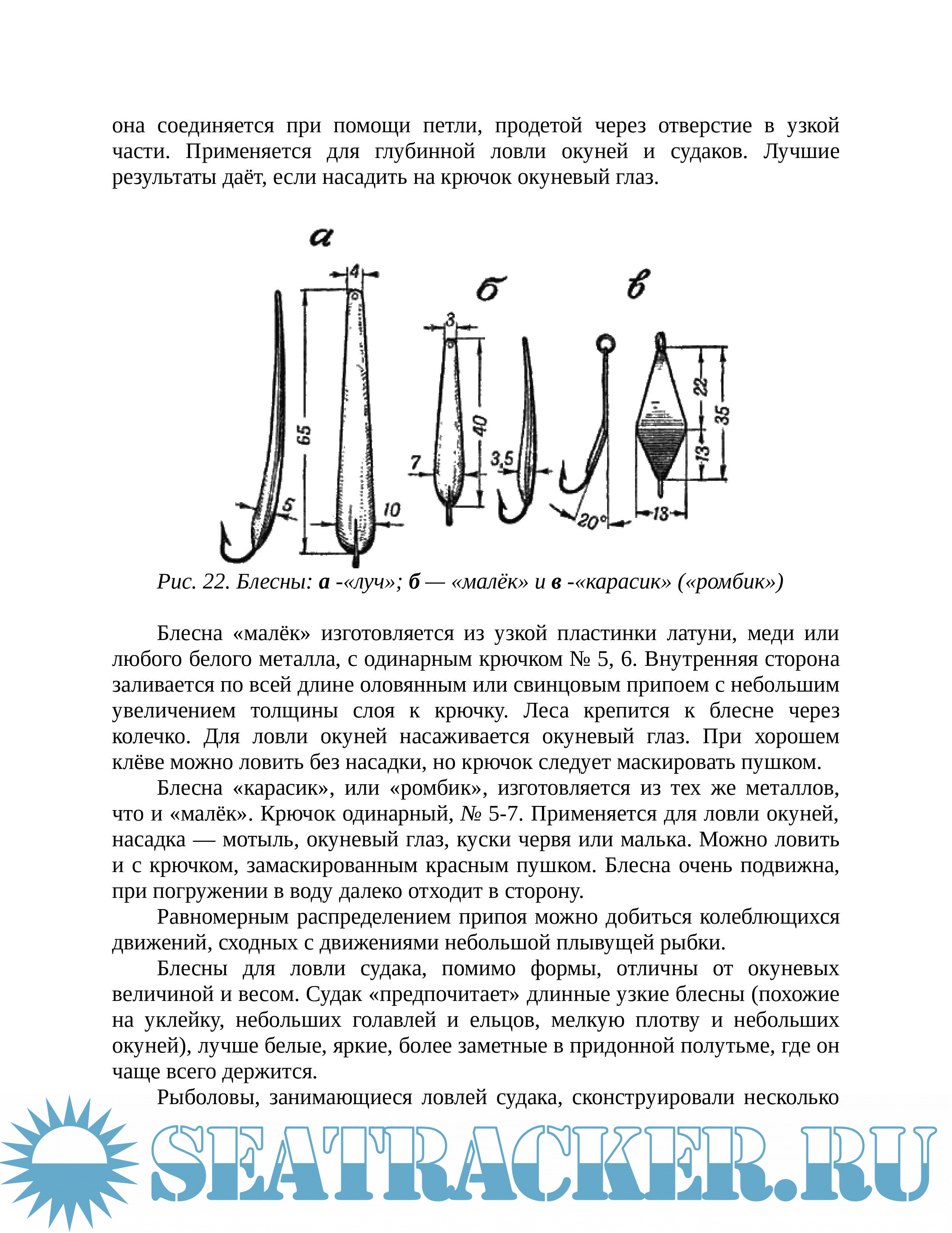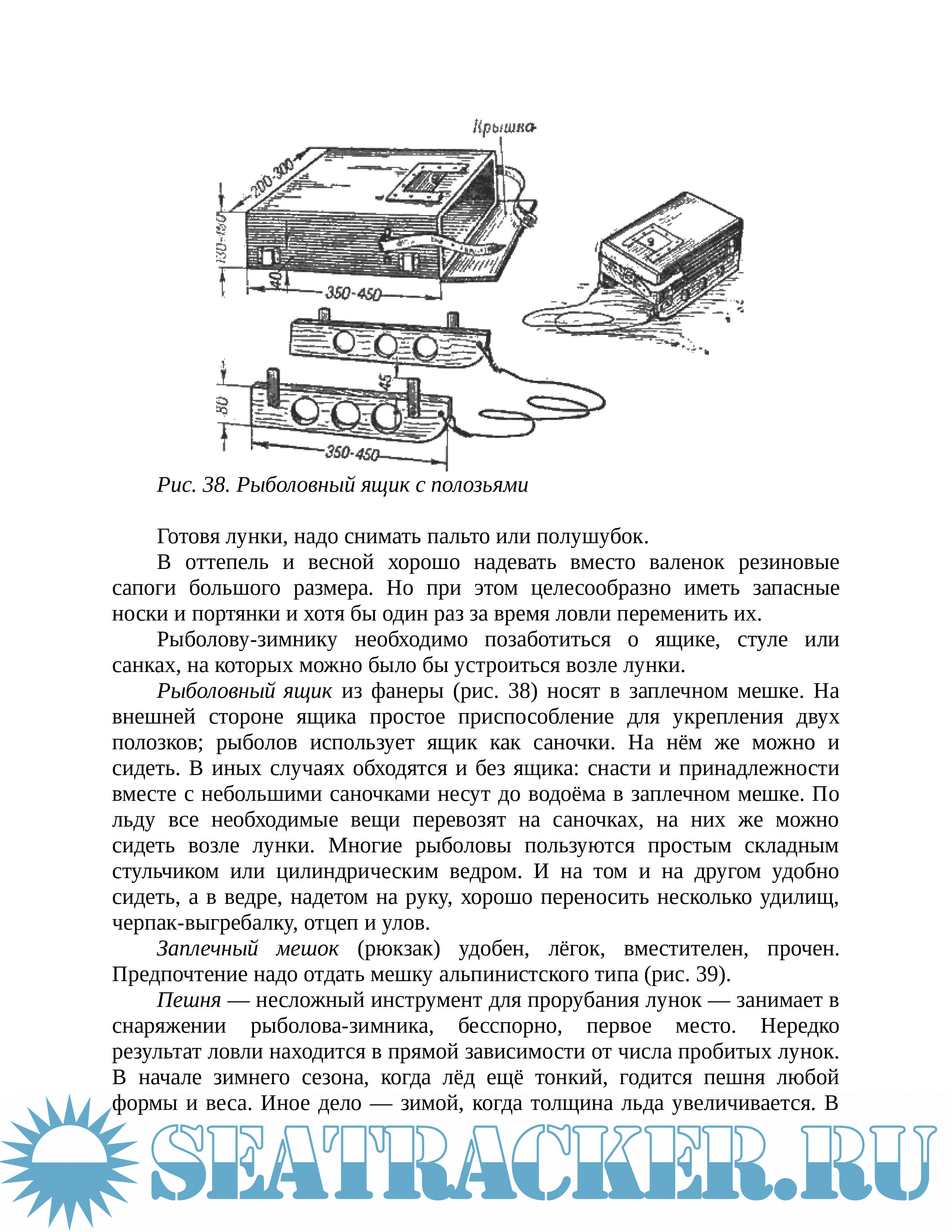 Описание: Много морей омывает просторы нашей Родины. Ещё больше у нас рек и озёр. А творческим трудом советских людей создаются новые каналы, водохранилища и целые пресноводные моря. Безымянные речушки превращаются в судоходные реки, новые каналы связывают в непрерывную сеть водные пути от крайнего севера до южных морей. Рост площади водоёмов предоставляет большие возможности для увеличения наших рыбных богатств. Новые кормовые места, возникающие на месте затопленных лугов, кустарников и вырубленных лесов, быстро осваиваются рыбой. Изобилие водоёмов обеспечивает благоприятные условия для развития спортивного рыболовства во все сезоны года, в том числе и зимой. С каждым годом становится все больше рыболовов-зимников, охотно отдающих свой досуг здоровому отдыху. Постоянная тренировка в ходьбе, работа пешней на чистом морозном воздухе, своеобразные условия зимней рыбалки закаляют организм. Кроме того, каждый выезд на рыбную ловлю зимой оставляет много новых, интересных впечатлений. Снасть и снаряжение для зимней рыбалки недороги, могут быть изготовлены своими силами и без особых затрат. Техника ловли несложна, осваивается легко и быстро. Зимнему рыболовству, технике ужения рыбы, наконец, снаряжению рыболова-зимника в средней полосе СССР и посвящена эта книга.