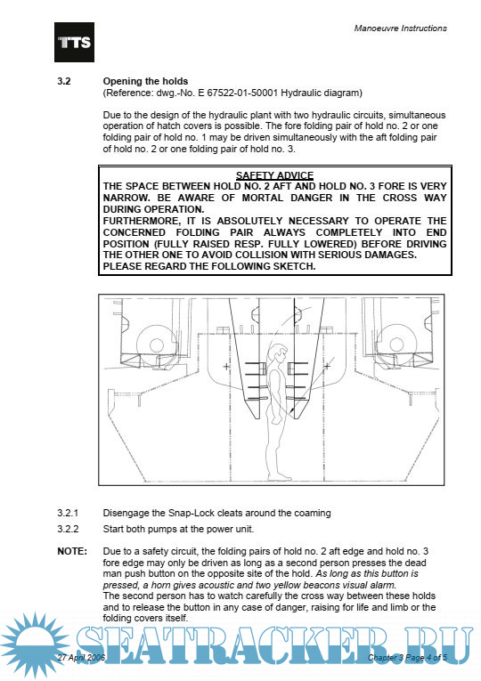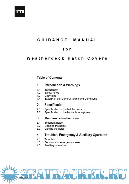 Year: 2006 Language: english Author: TTS Ships Equipment GmbH Genre: Guide Publisher: TTS Edition: TTS_752_2R1_3e Format: PDF Quality: eBook Pages count: 187 Description: This manual for TTS Ships Equipment hatch covers contains information especially for this equipment on technical data, installation, start-up, care and maintenance as well as spare parts ordering. The advanced design and the size of this plant requires experience, skill andspecial attention for safe operation and careful maintenance. Make sure that the guidance manual instructions, especially the safety instructions in this documentation are carefully observed ! General notes on safety are listed in first chapter. Special instructions are given at the beginning of the individual chapter. Safety instructions referring to actions are given before the action itself is described.