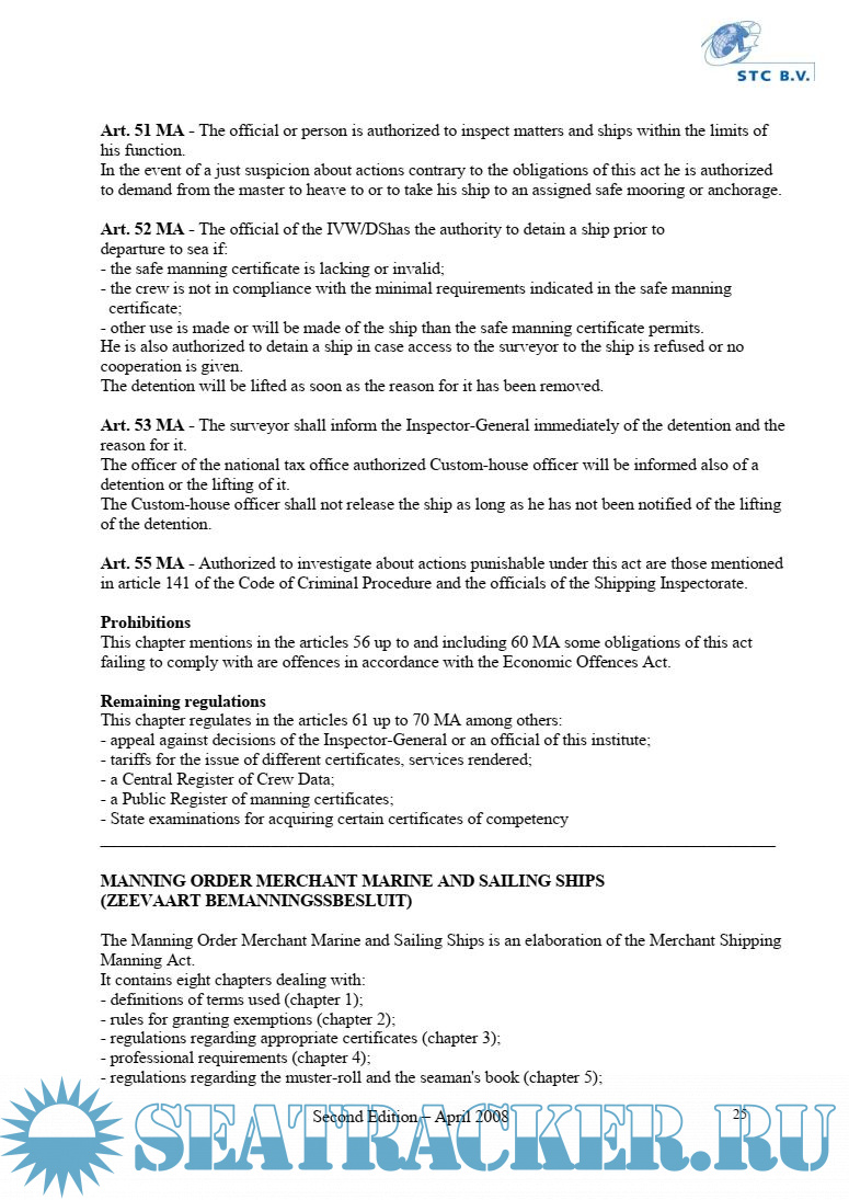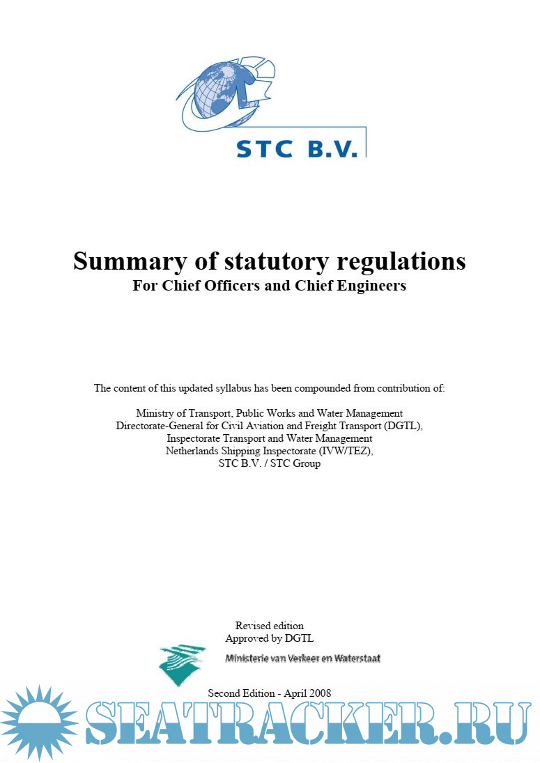 Year: 2008 Language: english Author: DGTL + IVW/TEZ Genre: Convention (rules) Publisher: Ministerie van Verkeer en Waterstaat Edition: Second Format: PDF Quality: eBook Pages count: 66 Description: Netherlands’ legislation layson the Master, the Chief Officer and the Chief Engineer many important responsibilities in regard to the ship, matters on board, the crew and the shipowner. It is therefore of great importance to gain an insight into the major Netherlands’ Acts and Decrees in which these responsibilities have been laid down. As it is an impossible task to deal with all this in detail, only outlines have been stated in this book. This will provide the Master, the Chief Officer and the Chief Engineer, which intend to work on board of any of Duch fleet vessel, with minimal requsted knowlege of Duch legislations.