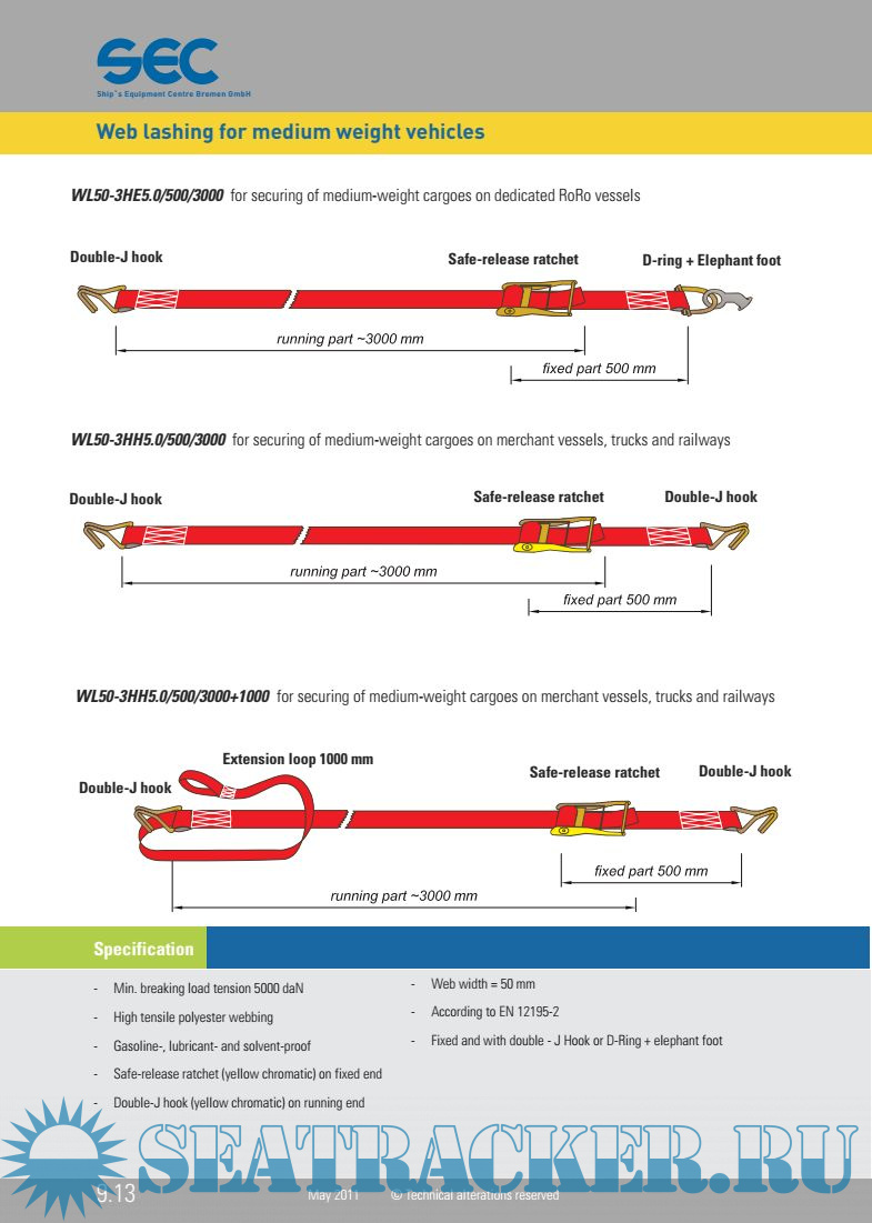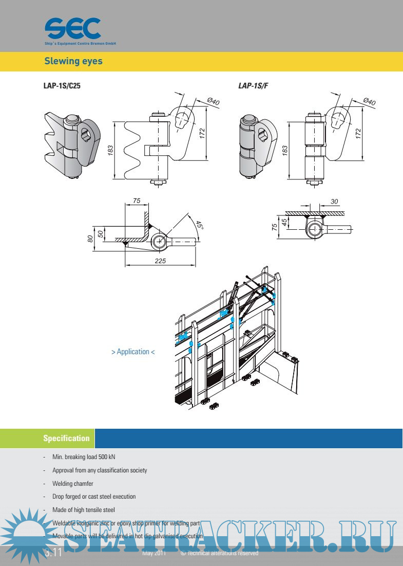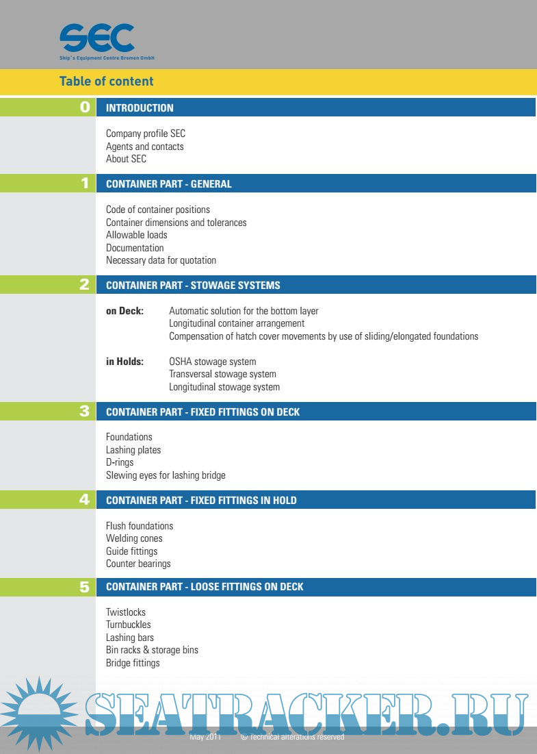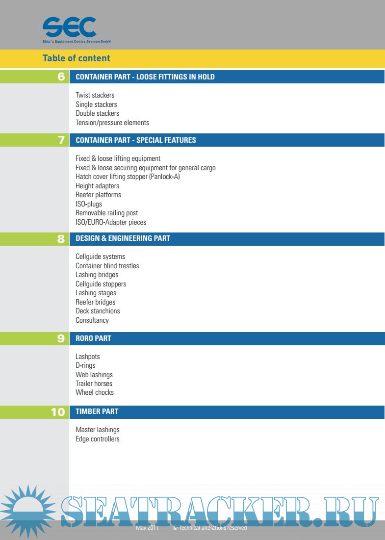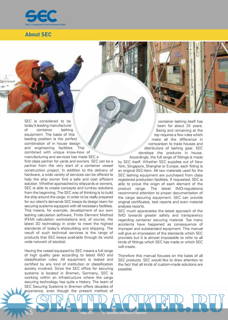 Year: 2011 Language: english Author: SEC Genre: Catalogue Publisher: SEC Edition: May 2011 Format: PDF Quality: eBook Pages count: 145 Description: Ship's Equipment Centre Bremen (SEC) is considered to be today's worldwide leading manufacturer of container lashing equipment. The basis of this leading position is the perfect combination of in house design and engineering facilities. This combined with unique know how of manufacturing and services has made Ship's Equipment Centre Bremen as a first class partner for yards and owners. As essential support towards an all around service is provided by the international network of agencies and logistics partners. Ship's Equipment Centre Bremen products are being distributed through world wide stocks kept at the main centres of international shipping activities. This network is essential to make sure that only exclusive Ship's Equipment Centre products are being supplied.