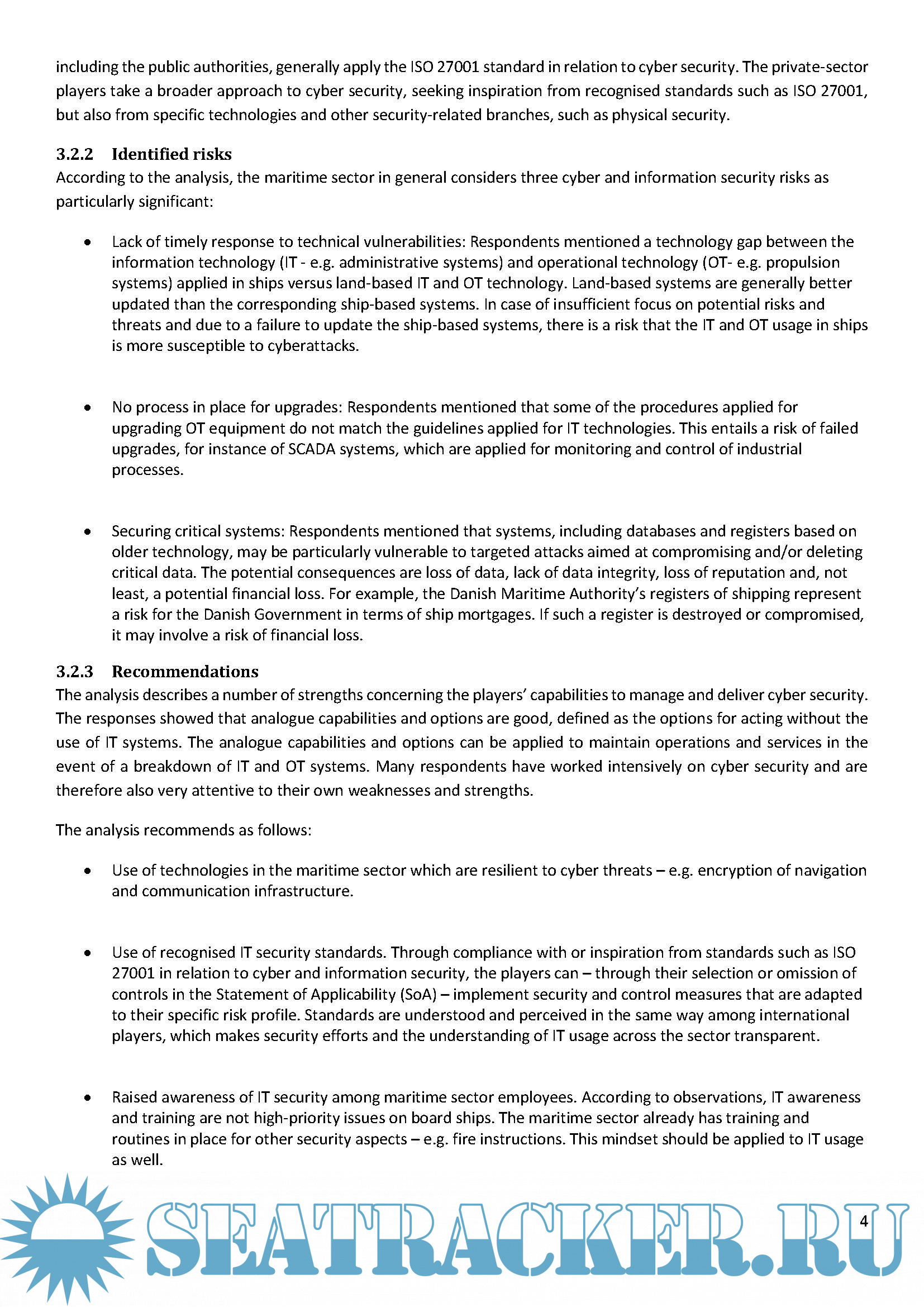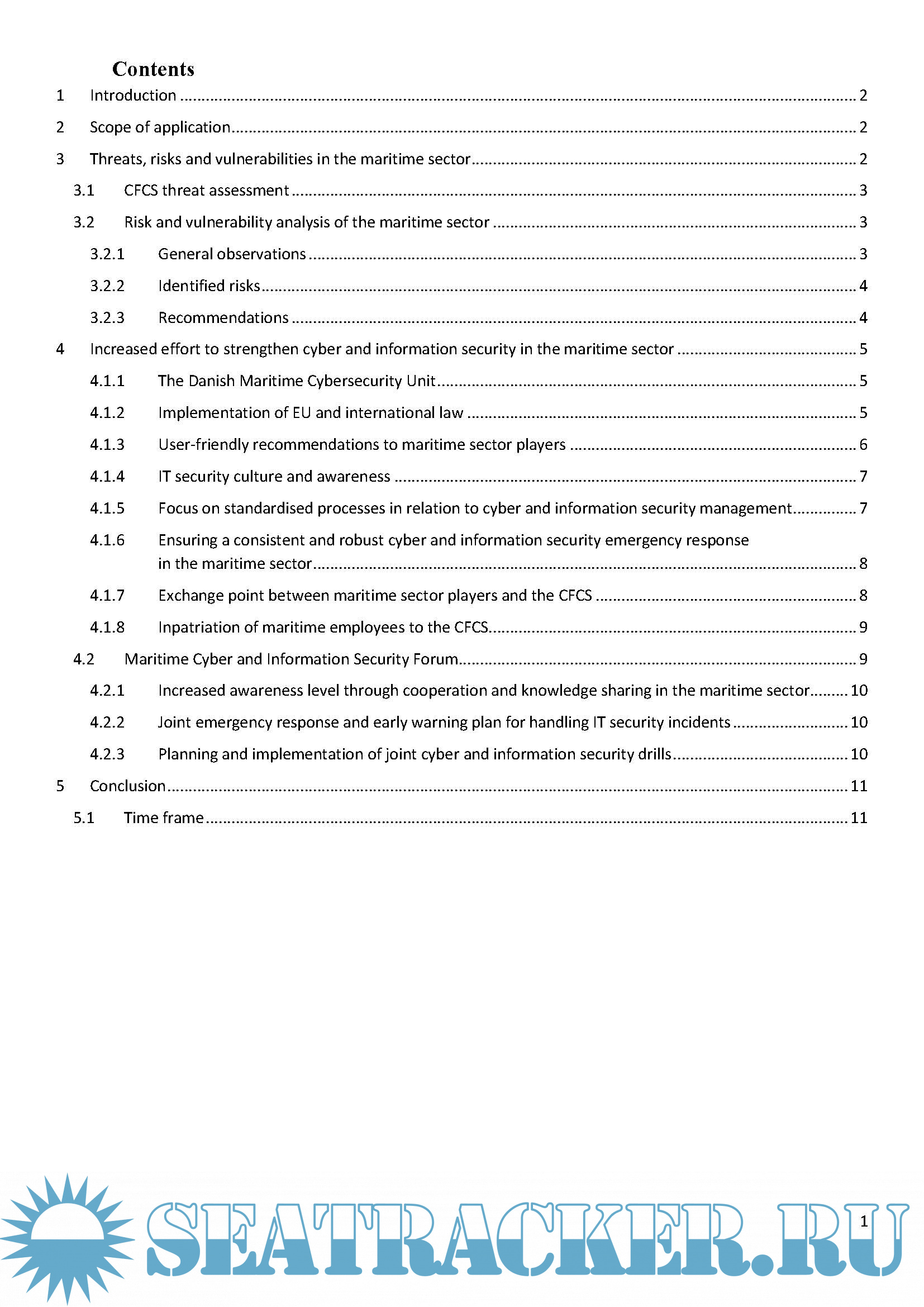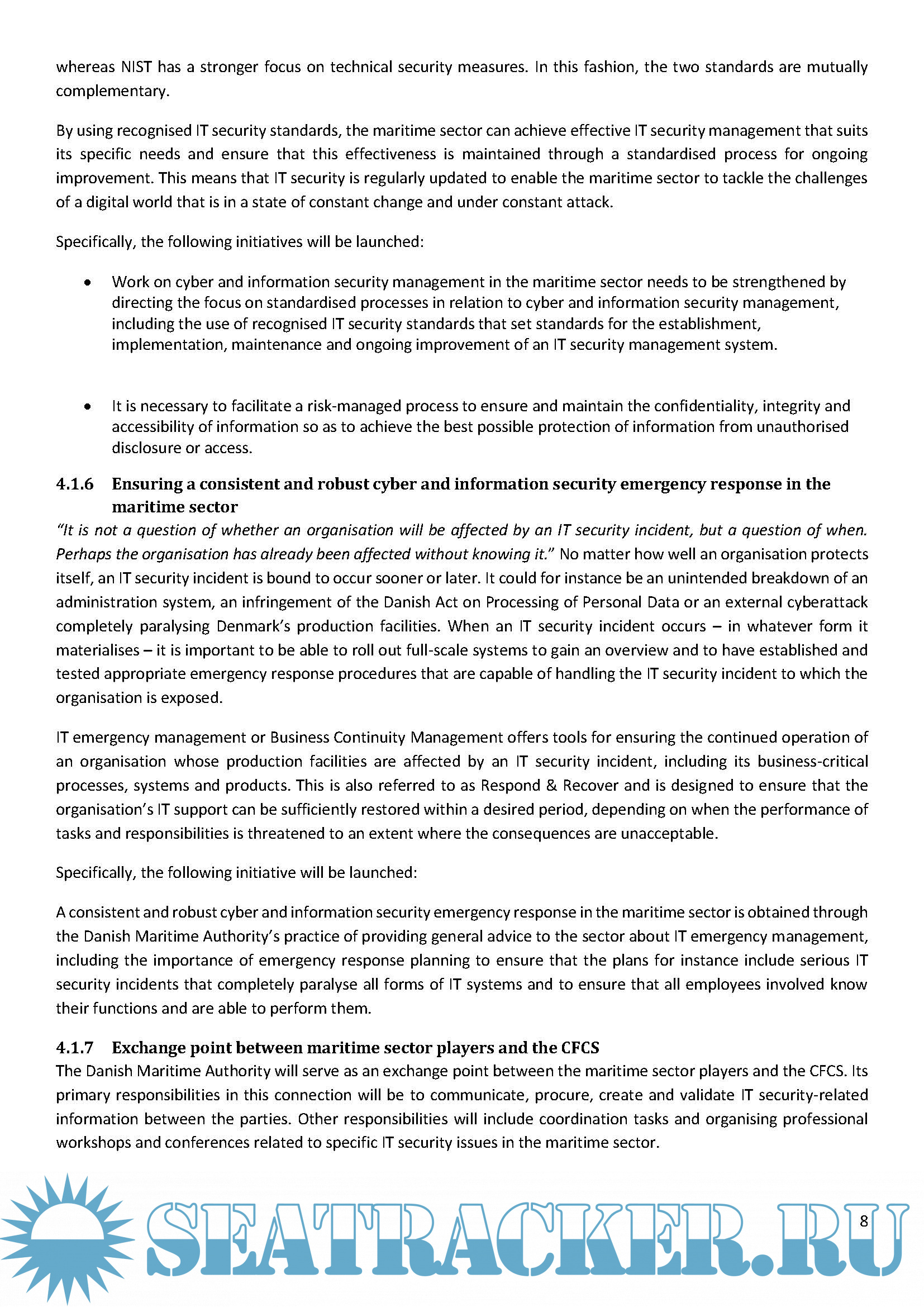 Description: In the Danish Cyber and Information Security Strategy, the Government has emphasised that the responsibility for cyber and information security activities in Denmark is based on the principle of sectoral responsibility: The authority responsible for a given function on a day-to-day basis is also the responsible authority when a cyber and information security incident occurs. Accordingly, the responsibility for cyber and information security in the maritime sectors lies with the Danish Maritime Authority and covers safety of navigation in Danish waters and security on board Danish ships, including systems used by ships and ship operation software, including software for propulsion and navigation, see the Danish Act on Safety at Sea. Cyber and information security in the maritime sector also covers services such as traffic monitoring, warnings and navigation information as well as other systems related to safe and secure navigation.