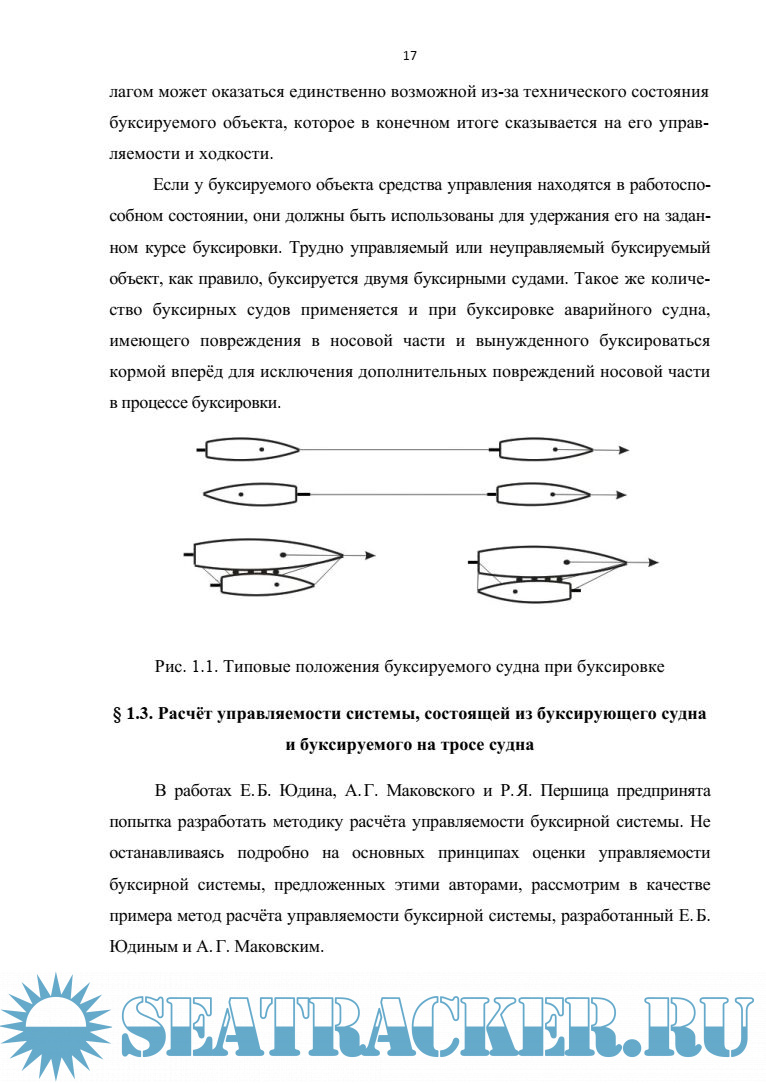 в расчётах, требующих предварительной оценки безопасности выполнения буксирной операции, управляемость буксирной системы не рассматривается вообще, в частности, из-за отсутствия научно обоснованной и практически апробированной методики её расчёта. В то же время большая часть аварий и аварийных случаев, происходящих в процессе выполнения буксирных операций, обусловлена потерей управляемости буксирной системы. В связи с этим возникла необходимость разработки методики расчёта управляемости буксирной системы, особенно в сложных условиях плавания, что является крайне актуальной задачей. Приэтомпредварительнаяоценкауправляемостибуксирнойсистемынеявляетсятрудноразрешимойзадачей, учитывая возможности существующих методов математического моделирования движения плавучих объектов в различных условиях плавания.