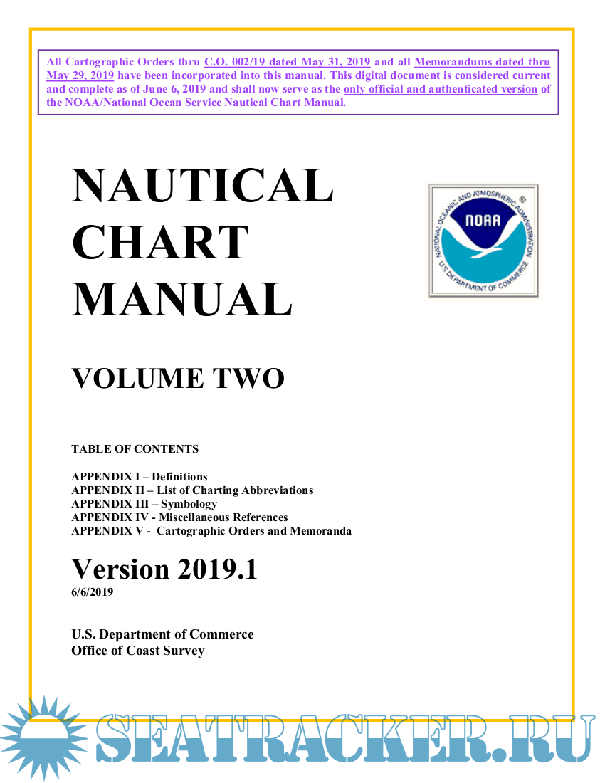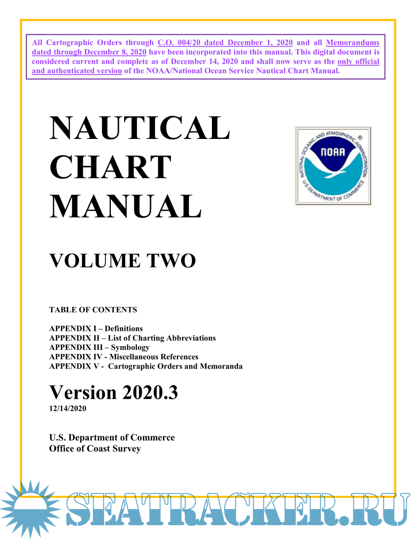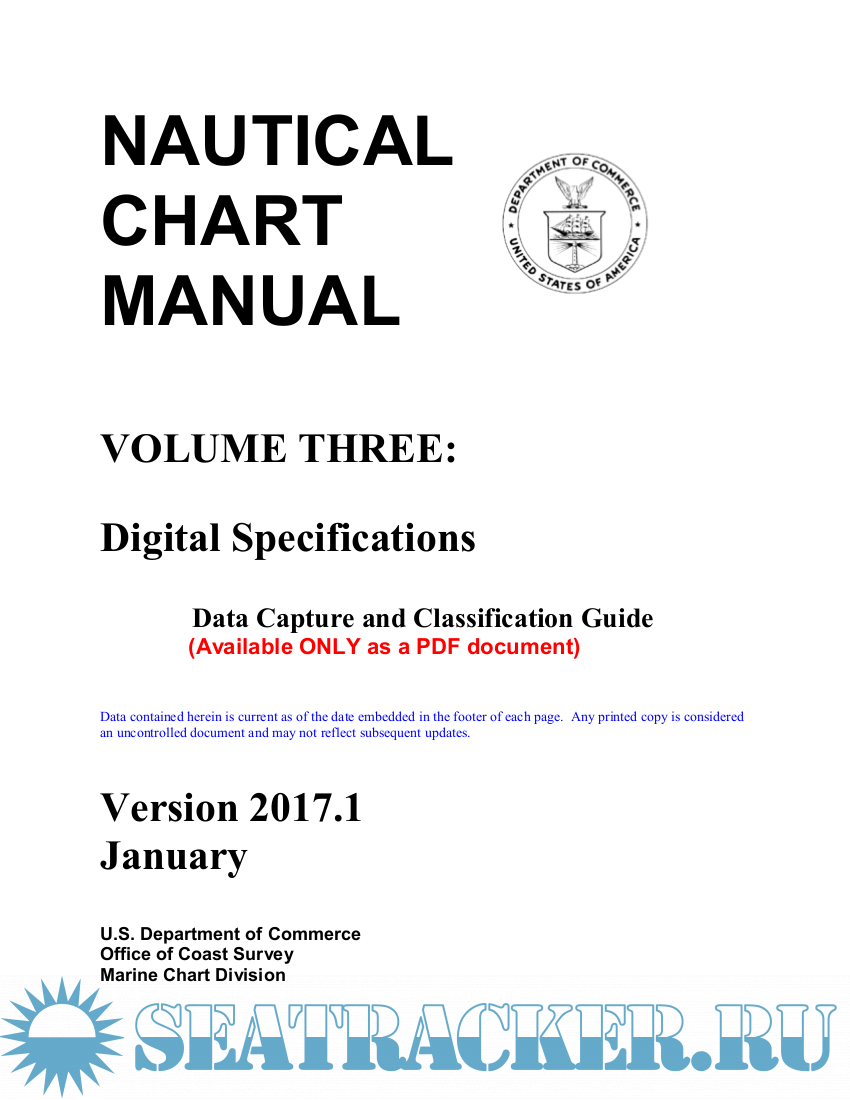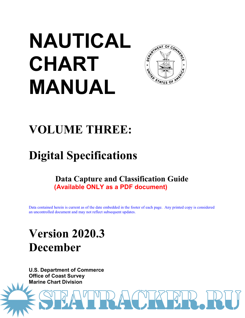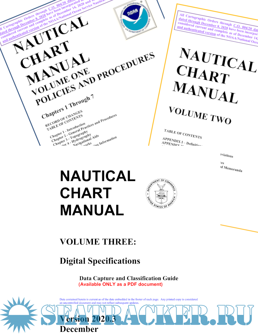 Year: 2020 Language: english Author: U.S. Department of Commerce, Office of Coast Survey Genre: Reference book Publisher: U.S. Department of Commerce, Office of Coast Survey Edition: 2020.3 - released on 14.12.2020, (Previous versions: 2019.1 2017.1) Format: PDF Quality: eBook Pages count: 890 (Volume 1); 1440 (Volume 2); 574 (Volume 3) Description: Volume 1: Policies and Procedures Chapters 1 Through 7 Table of contents Chapter 1 - Introduction Chapter 2 - General Practices and Procedures Chapter 3 - Topography Chapter 4 - Hydrography Chapter 5 - Navigational Aids Chapter 6 - Landmarks Chapter 7 - Other Charting Information Volume 2: Table of contents APPENDIX I – Definitions APPENDIX II – List of Charting Abbreviations APPENDIX III – Symbology APPENDIX IV - Miscellaneous References APPENDIX V - Cartographic Orders and Memoranda Volume 3: Digital Specifications Data Capture and Classification Guide