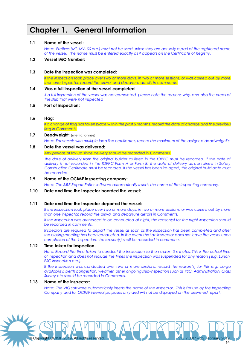 Description: Vessel Inspection Questionnaires for Oil Tankers,Combination Carriers, Shuttle Tankers, Chemical Tankers and Gas Tankers. (VIQ 7). In 1993, OCIMF established a Ship Inspection Report (SIRE) Programme, which enabled OCIMF members to submit their ship inspection reports to OCIMF for distribution to OCIMF members and certain qualifying non-OCIMF members.Participation in the original programme, as either an inspecting OCIMF Member or a programme recipient, was strictly voluntary and each programme recipient determined independently how to evaluate the information contained in the reports received from OCIMF.Under the SIRE Programme, the operator of any ship that is the subject of a report was given a copy of that report and the opportunity to submit written comments relating to the report, to both the inspecting OCIMF Member and to OCIMF.Report recipients accessed the SIRE System Index by computer and this permitted the index to be viewed or downloaded. Programme recipients could order reports and any matching operator comments from the SIRE system. Reports and comments were transmitted by facsimile to the programme recipients' pre-registered facsimile numbers on request.