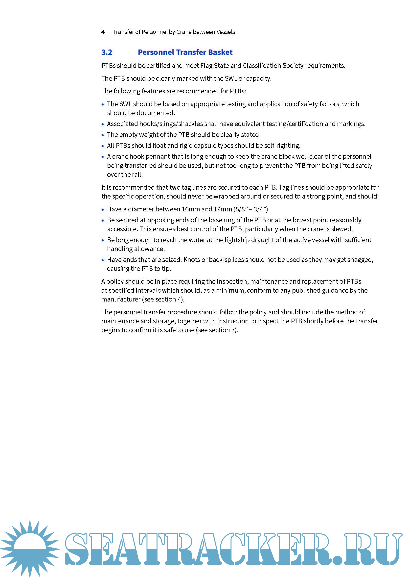 The use of an onboard crane for the transfer of personnel has inherent risks. This paper highlights those risks and provides guidance that should be used in the risk assessment process to determine the method of transfer. Cranes can be used to transfer personnel between two vessels of similar size, e.g. Ship to Ship (STS) transfers, but also between vessels of different sizes, e.g. between a large tanker and a smaller vessel. Crane transfers are typically completed using a Personnel Transfer Basket (PTB). In this paper, the term PTB is used to describe the piece of equipment in which personnel are transferred and includes collapsible basket and rigid capsule types.