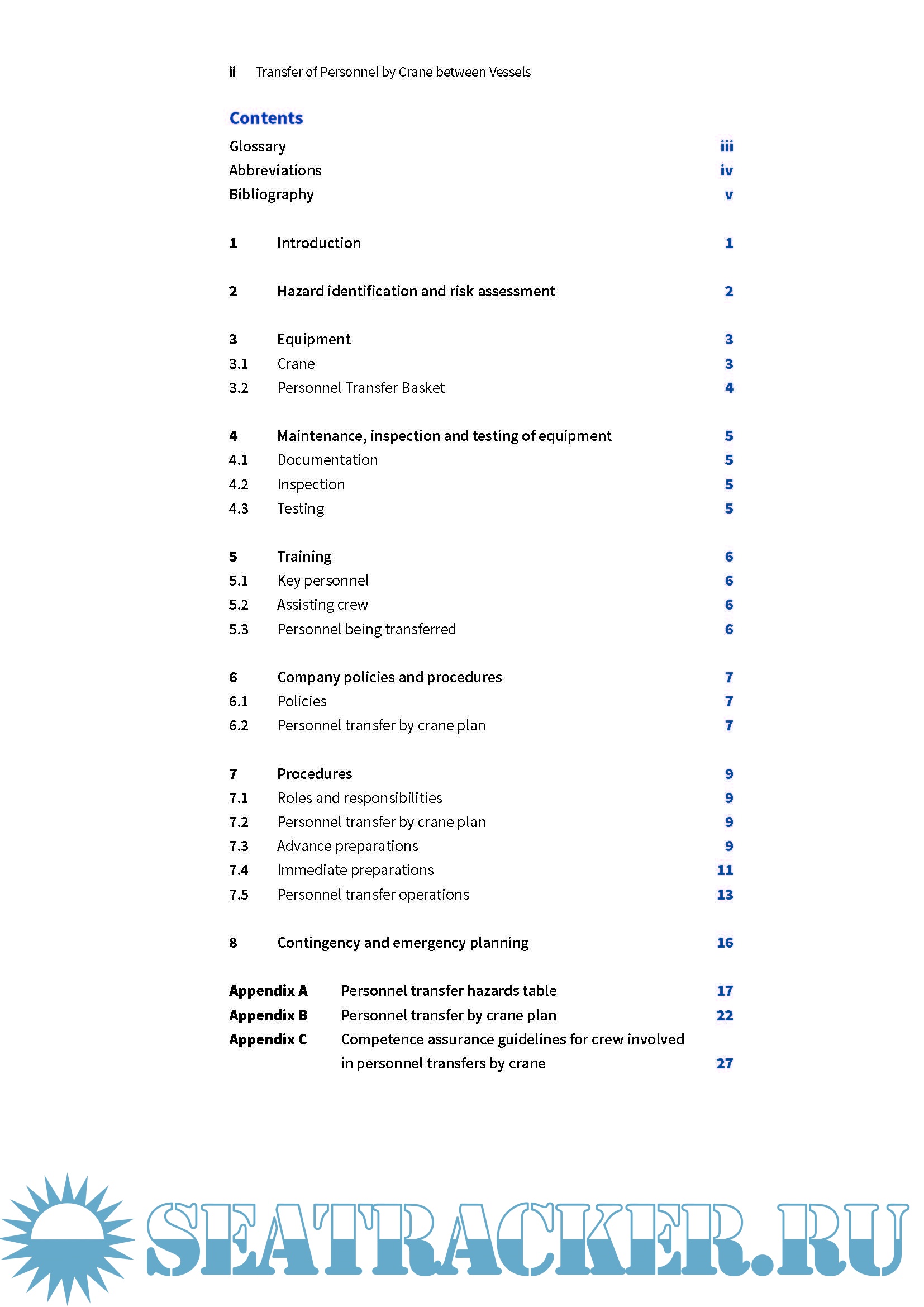 Year: 2018 Language: english Author: Oil Companies International Marine Forum Genre: Guide Publisher: OCIMF Edition: 1st Format: PDF Quality: eBook Pages count: 39 Description: This information paper is intended to help vessel operators and owners, Masters, officers, Marine Superintendents and Mooring Masters evaluate the risks associated with the transfer of personnel by a vessel’s onboard crane. The paper contains recommendations on equipment and good operating practices that will enhance the overall safety of personnel transfer operations. It is not a set of rules and if more stringent international, national or local regulations apply they must always take precedence. The use of an onboard crane for the transfer of personnel has inherent risks. This paper highlights those risks and provides guidance that should be used in the risk assessment process to determine the method of transfer. Cranes can be used to transfer personnel between two vessels of similar size, e.g. Ship to Ship (STS) transfers, but also between vessels of different sizes, e.g. between a large tanker and a smaller vessel. Crane transfers are typically completed using a Personnel Transfer Basket (PTB). In this paper, the term PTB is used to describe the piece of equipment in which personnel are transferred and includes collapsible basket and rigid capsule types.
