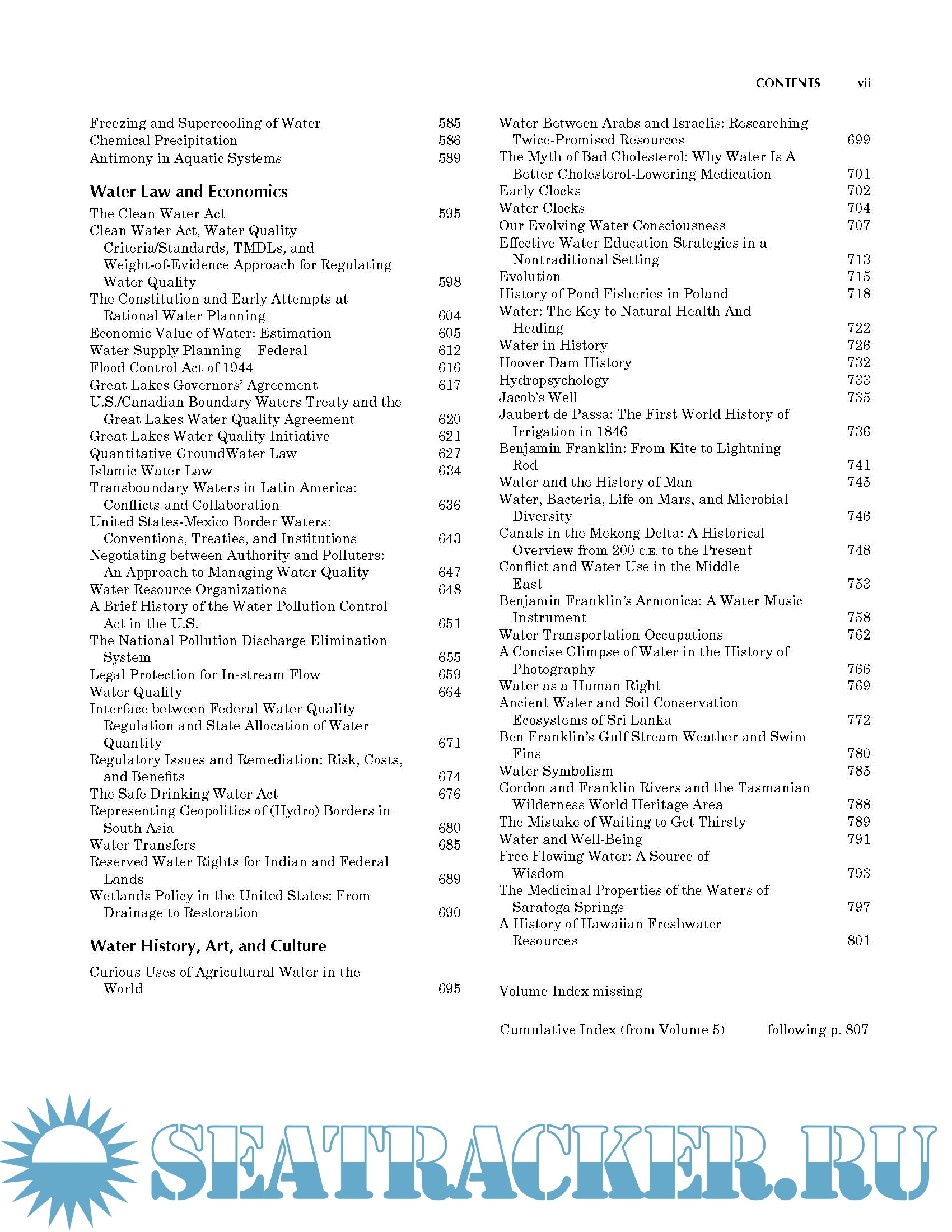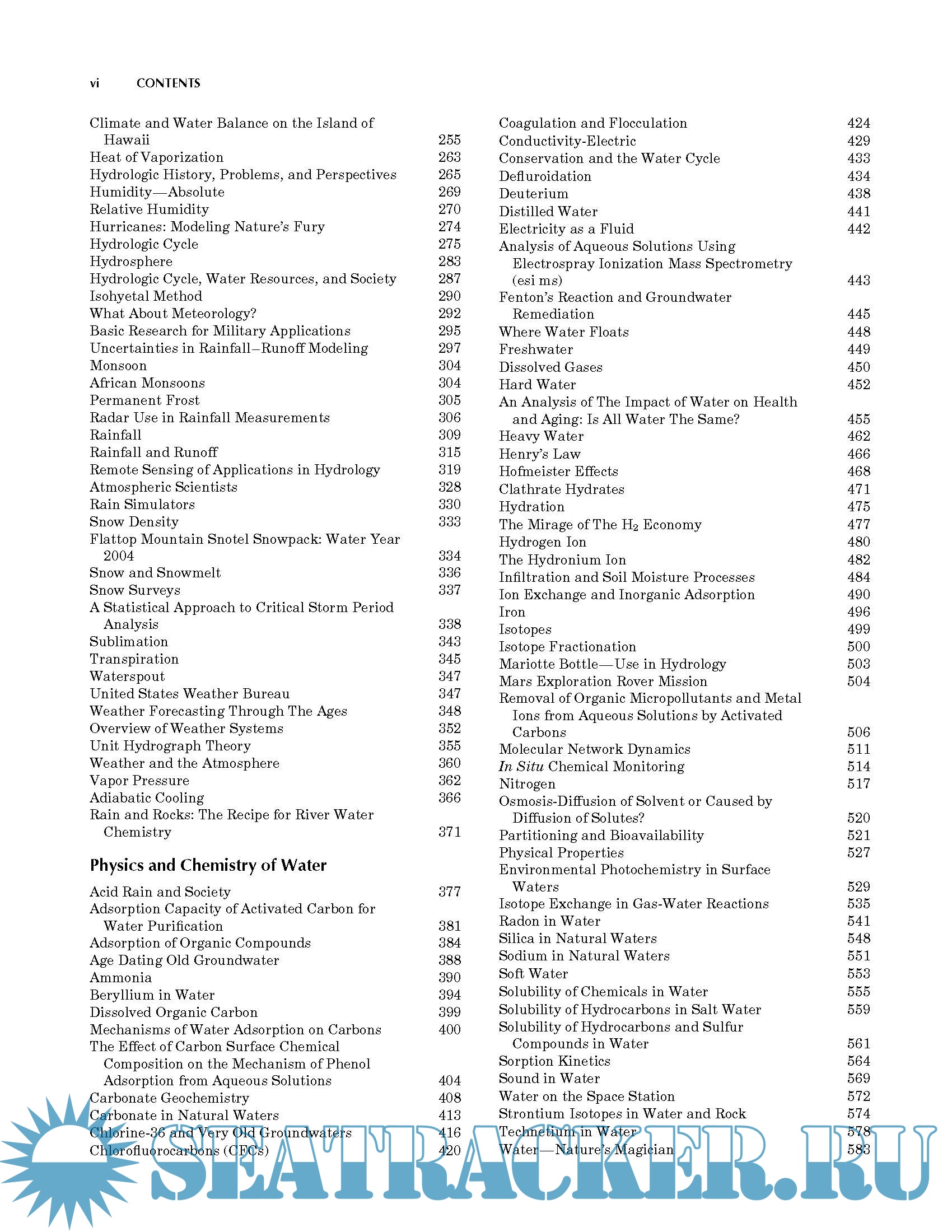 This encyclopedia has short, illustrated and referenced papers relating to water in each of the following sections: (1) Oceanography (47 papers); (2) Meteorology (71 papers); (3) Physics and chemistry of water (67 papers); (4) Water law and economics (26 papers); and (5) Water history, art, and Culture (33 papers).