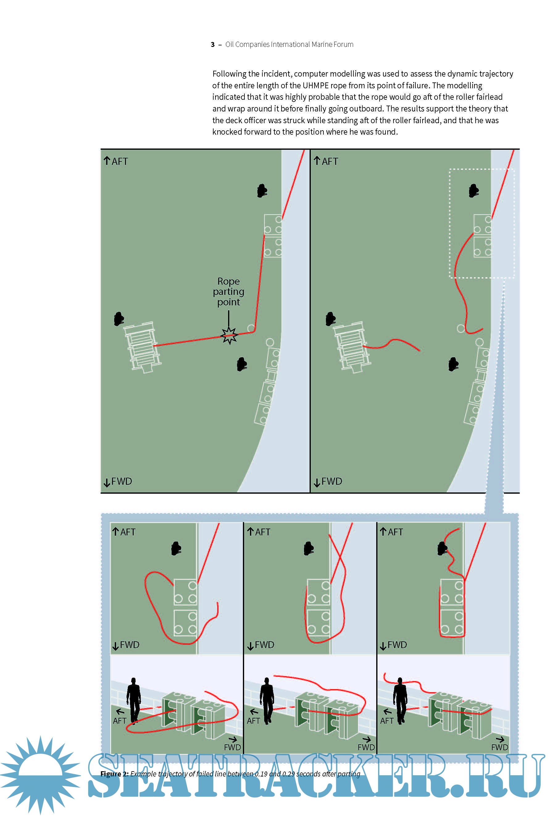 Description: A deck officer in charge of the forward mooring party on board a very large liquid natural gas (LNG) carrier was seriously injured when a tensioned mooring line parted. At the time of the incident, the deck officer was standing in a location that was not identified on board the vessel as being within a snap-back danger zone. This incident has highlighted the behaviour of High Modulus Synthetic Fibre (HMSF) mooring lines fitted with synthetic tails when they fail under load.