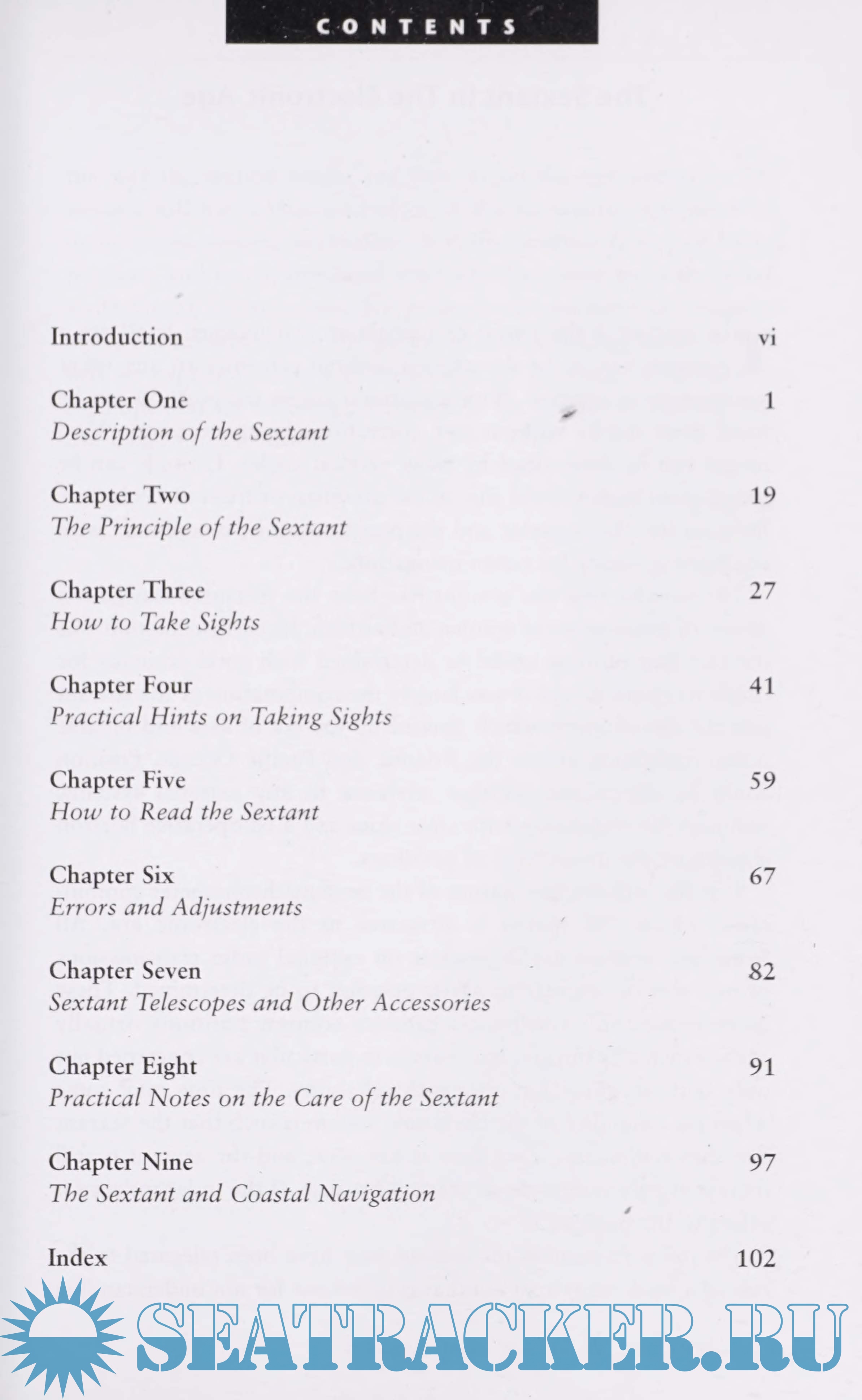 Description of the sextant The principle of the sextant How to take sights Practical hints on taking sights How to read the sextant Errors and adjustments Sextant telescopes and other accessories Practical notes on the care of the sextant The sextant and coastal navigation