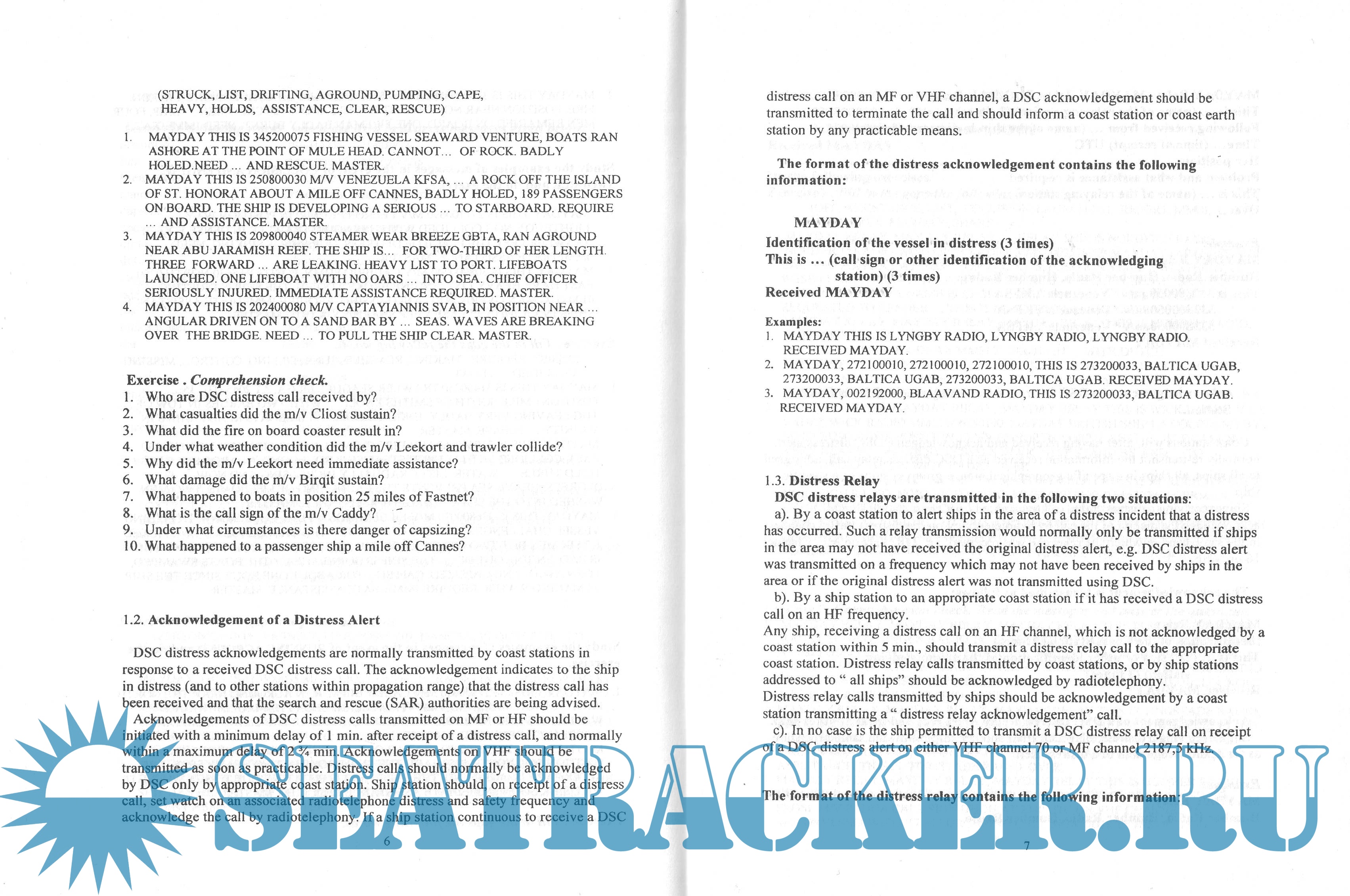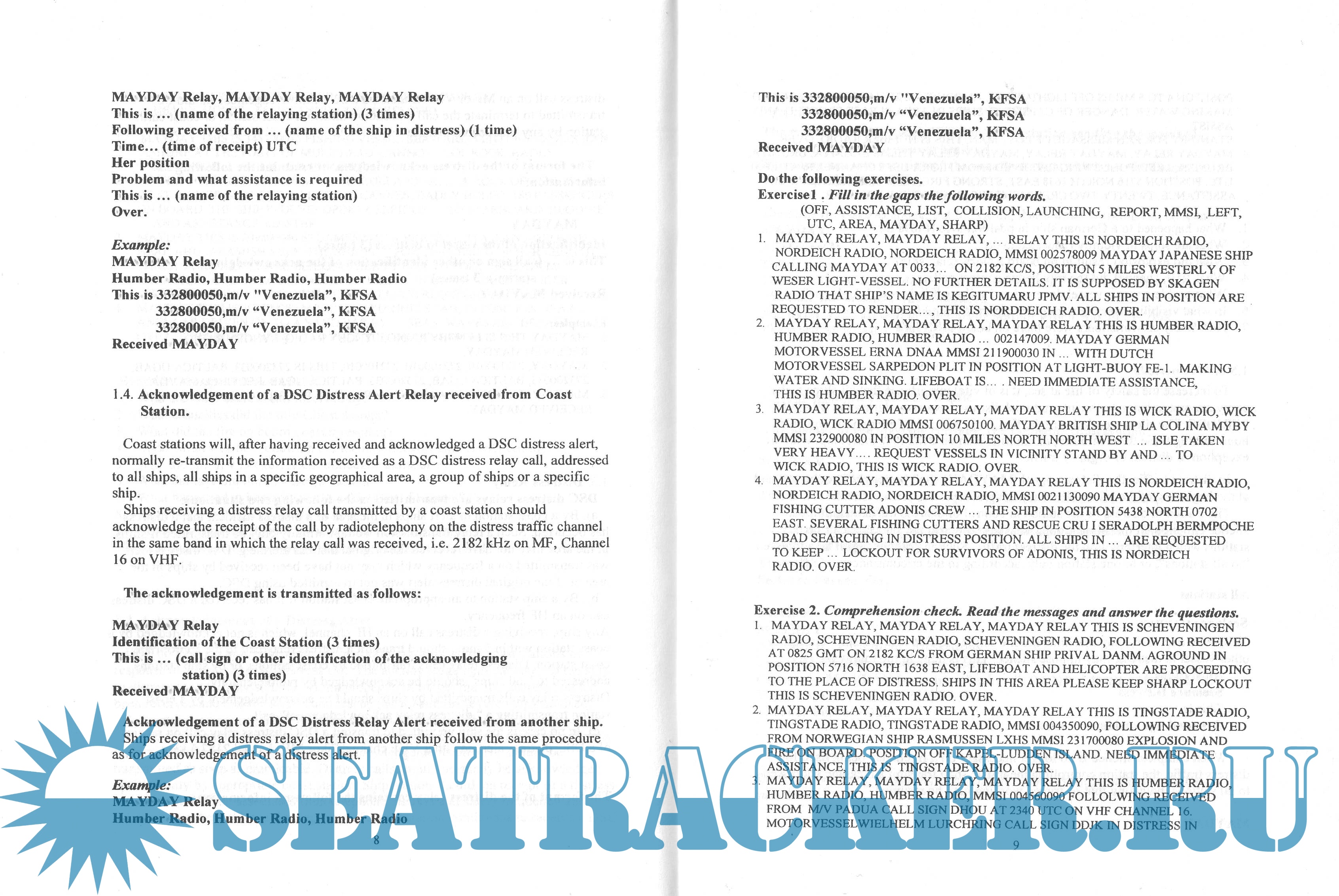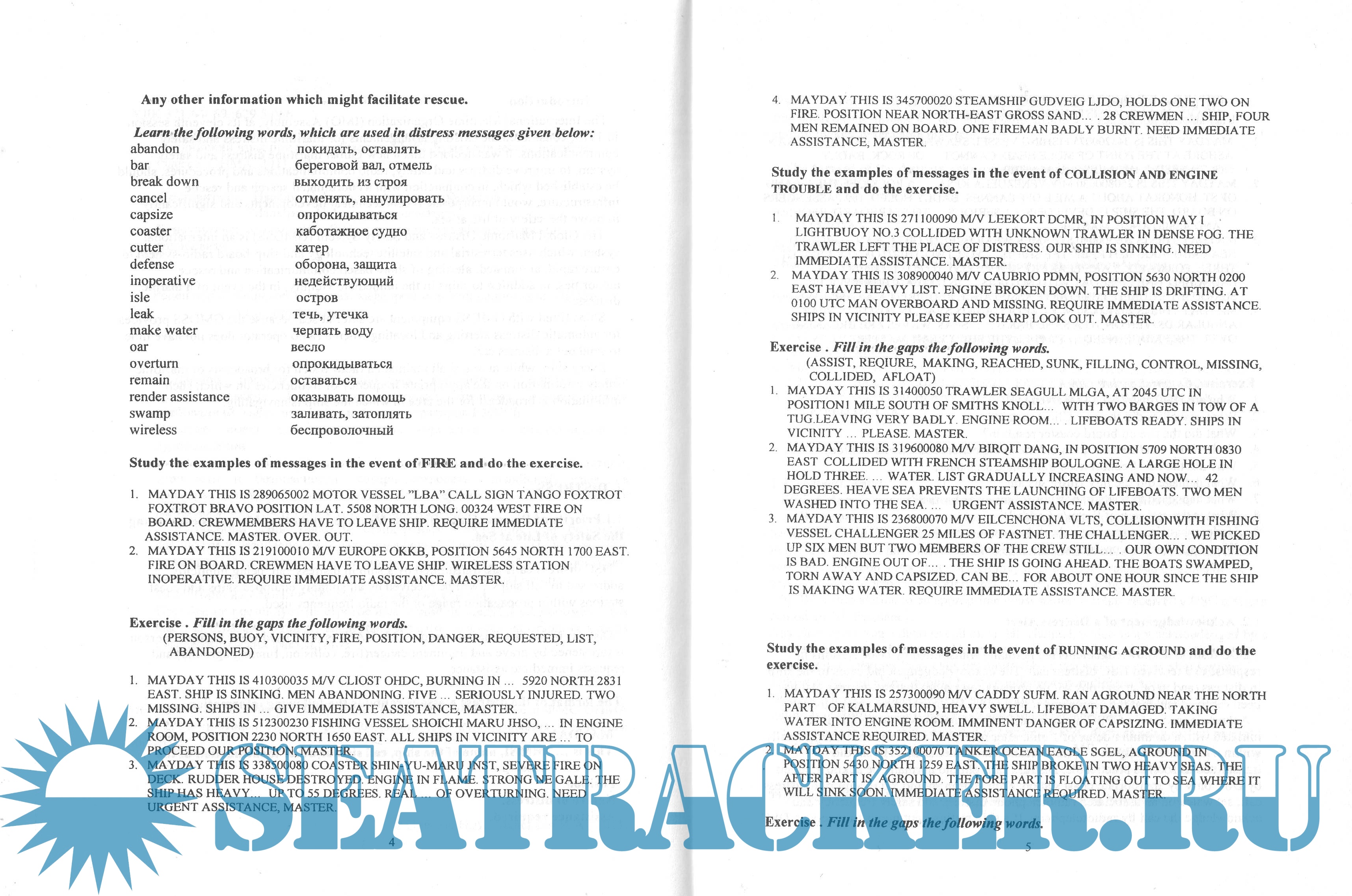 В пособии даны образцы стандартных сообщений при бедствии, срочности и безопасности в радиотелефонии. Тренировочные упражнения отражают лексические особенности радиосообщений, способствуют усвоению специальной лексики, необходимой для работы в море.