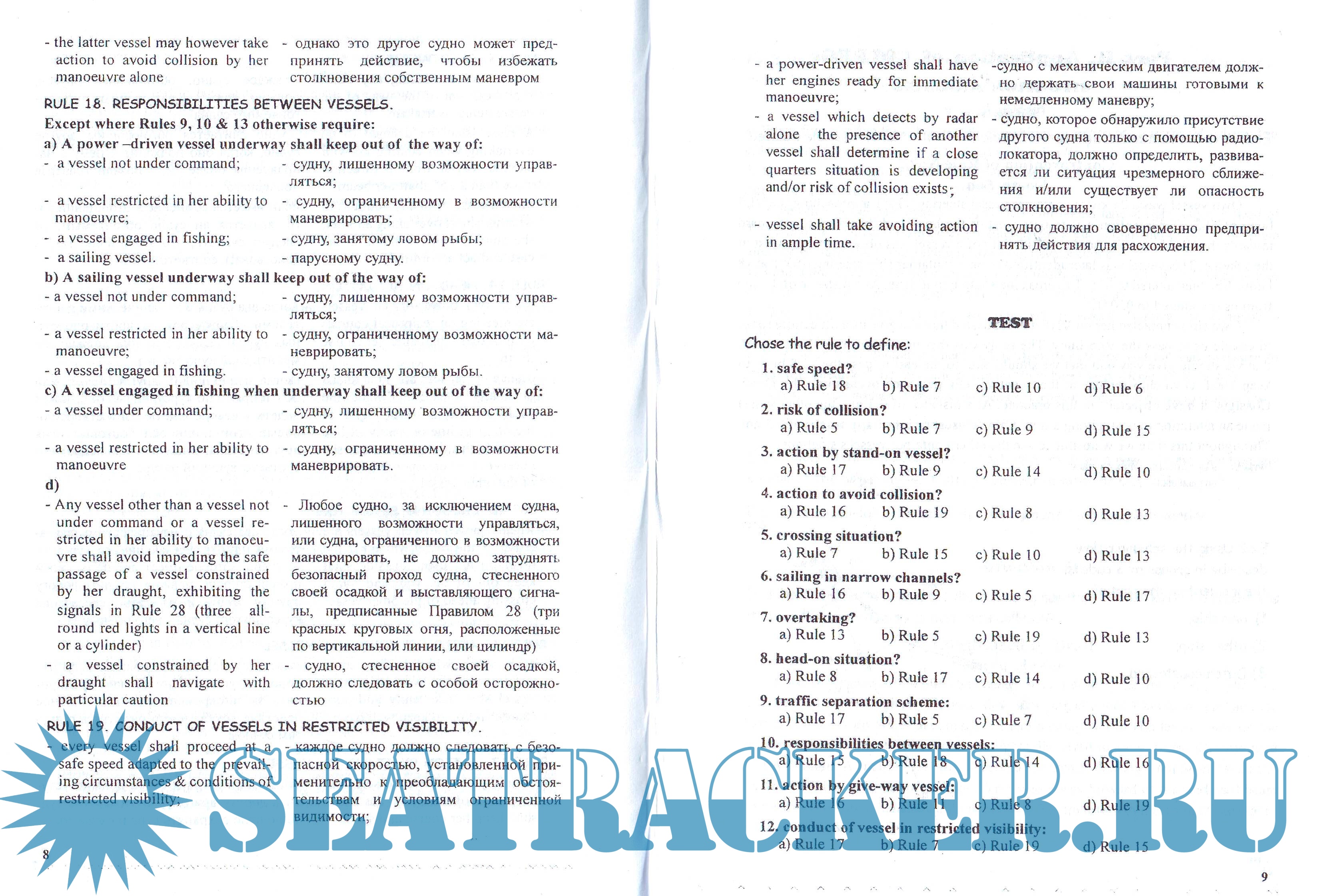Описание: Учебное пособие предназначено для курсантов судоводительского факультета морских академий, а также судоводителей, желающих приобрести практические разговорные навыки по вопросам предупреждения столкновений судов (МППСС-72) на английском языке.