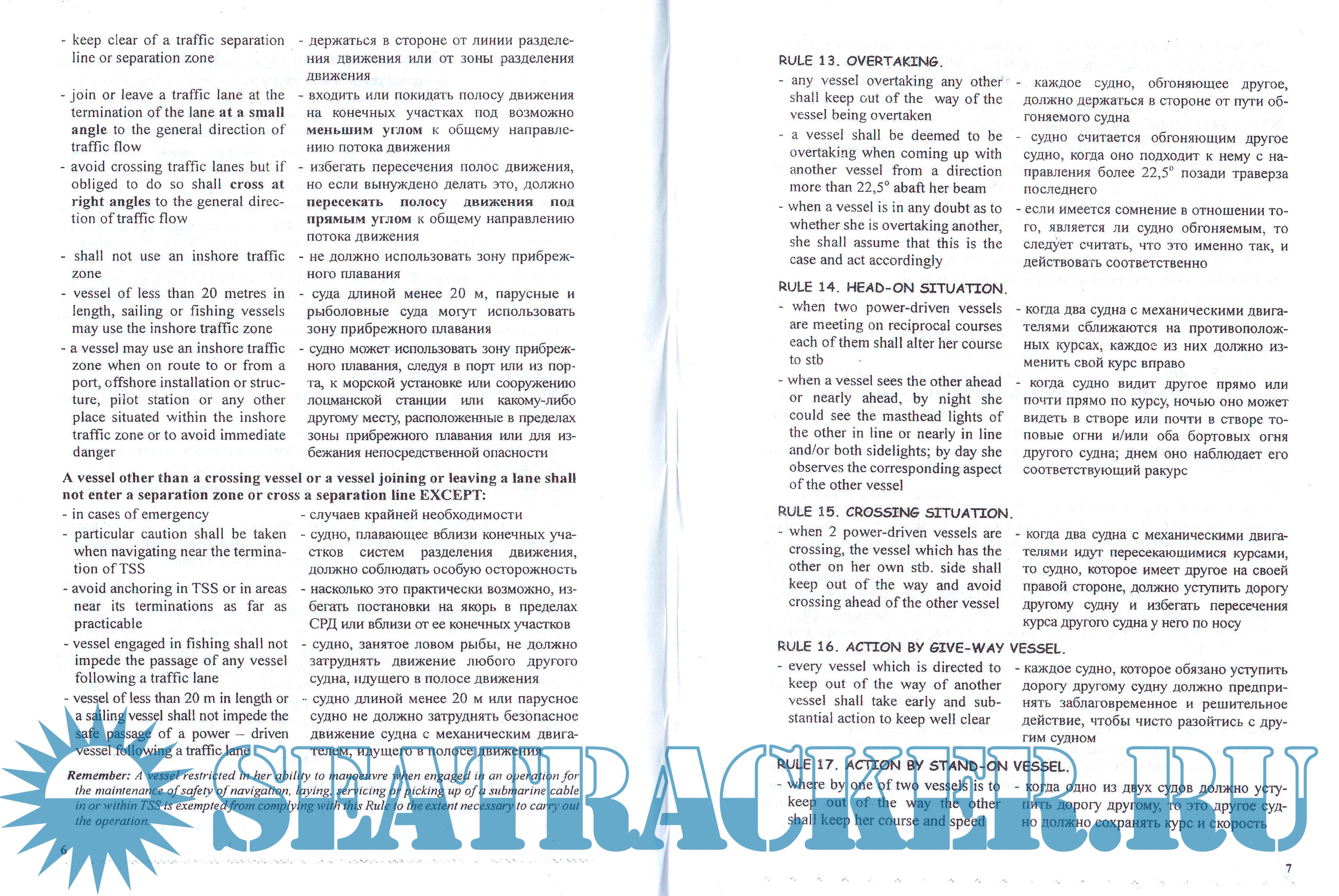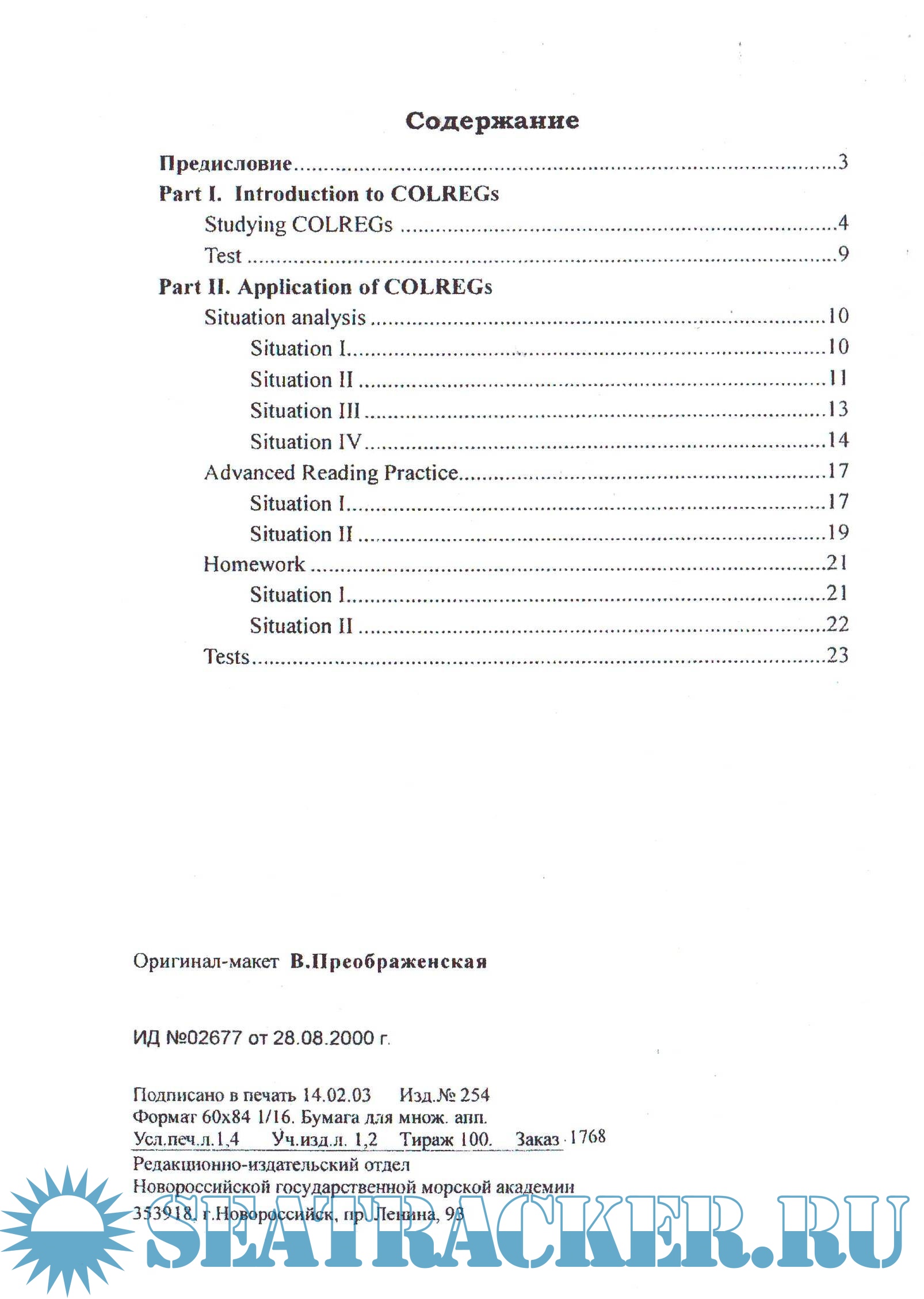 Год выпуска: 2003 Язык: Русский, Английский Автор: В.Ф.Тенищева, Л.Г.Ходус Жанр: Учебное пособие Издательство: Редакционно-издательский отдел Нороссийской государственной морской академии Формат: PDF Качество: Отсканированные страницы Количество страниц: 25 Описание: Учебное пособие предназначено для курсантов судоводительского факультета морских академий, а также судоводителей, желающих приобрести практические разговорные навыки по вопросам предупреждения столкновений судов (МППСС-72) на английском языке. Часть I пособия подготовлена доцентом кафедры иностранных языков НГМА Ходус Л.Г. Часть II - доцентом Тенищевой В.Ф.