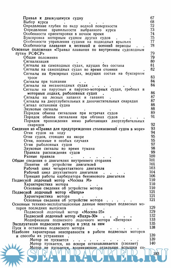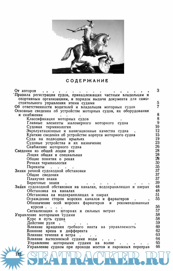 с необходимыми сведениями из общей лоции рек, со знаками судоходной обстановки на реках, каналах, водохранилищах и озерах. В пособии рассмотрены основные положения «Правил плавания по внутренним судоходным путям РСФСР» и «Правил для предупреждения столкновений судов в море», изложены советы по управлению маломерными моторными судами.