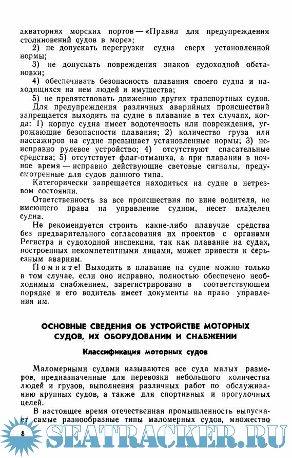 Год выпуска: 1971 Язык: русский Автор: Куряев Т.А., Черненок М.Я. Жанр: Практическое пособие Издательство: Транспорт Издание: 4-е изд., перераб. и доп. Формат: PDF Качество: Отсканированные страницы Количество страниц: 185 Описание: В книге, рассчитанной на широкий круг любителей водно-моторного спорта и туризма, приведены основные сведения об устройстве и снабжении маломерных моторных судов, рассмотрены вопросы приспособления автомобильных двигателей для работы в судовых условиях, даны советы по технике безопасности при эксплуатации любительских судов. Авторы знакомят читателя с устройством и обслуживанием наиболее распространенных подвесных моторов,с правилами регистрации судов и порядком получения документов на право управления ими, с необходимыми сведениями из общей лоции рек, со знаками судоходной обстановки на реках, каналах, водохранилищах и озерах. В пособии рассмотрены основные положения «Правил плавания по внутренним судоходным путям РСФСР» и «Правил для предупреждения столкновений судов в море», изложены советы по управлению маломерными моторными судами.