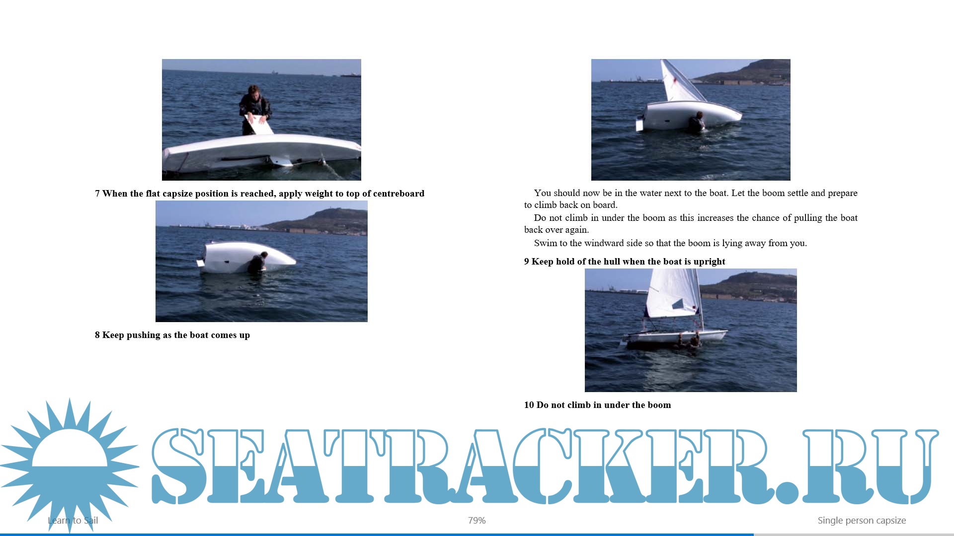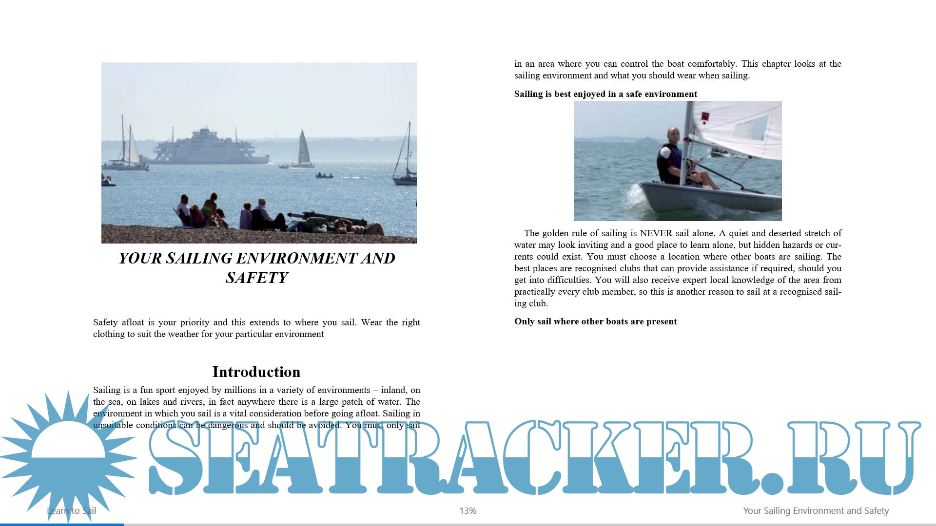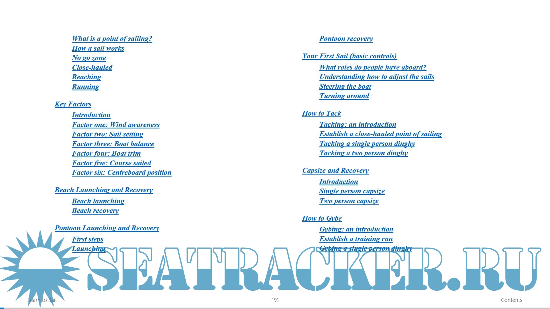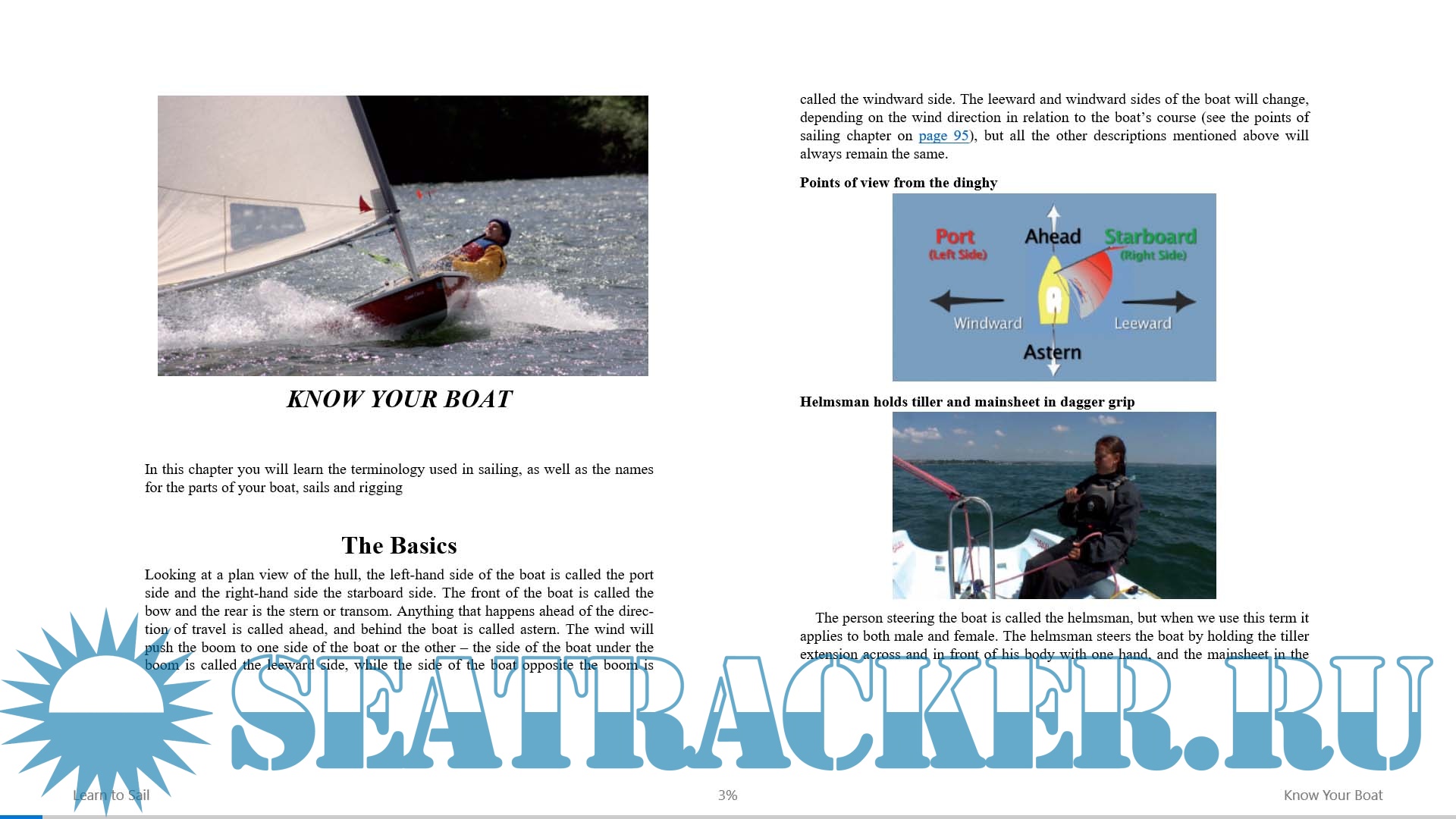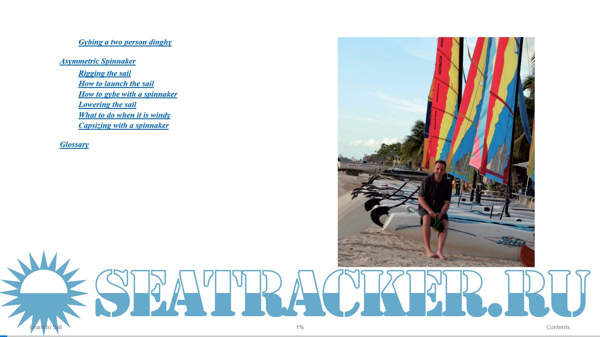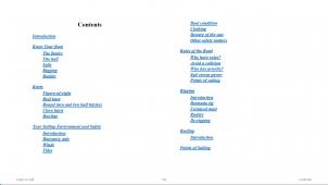 The book starts with the general information about the boats, followed by the description of the most commonly used knots. The next two chapters address the safety of the sailing and environment, and basic rules of the road. The rest of the chapters cover the rigging and reefing, sailing points, launching and recovery of beach and pontoon, and a real wealth of other important and useful knowledge.