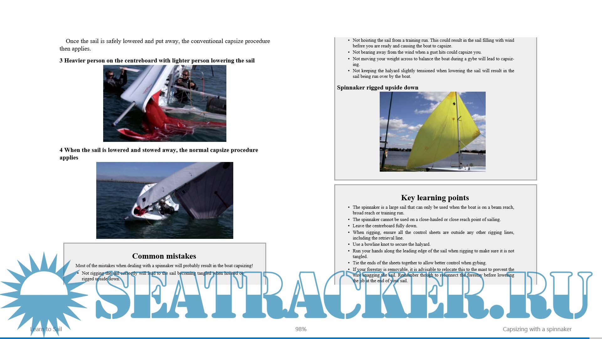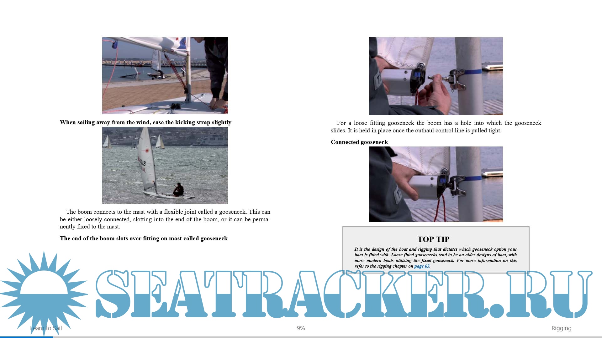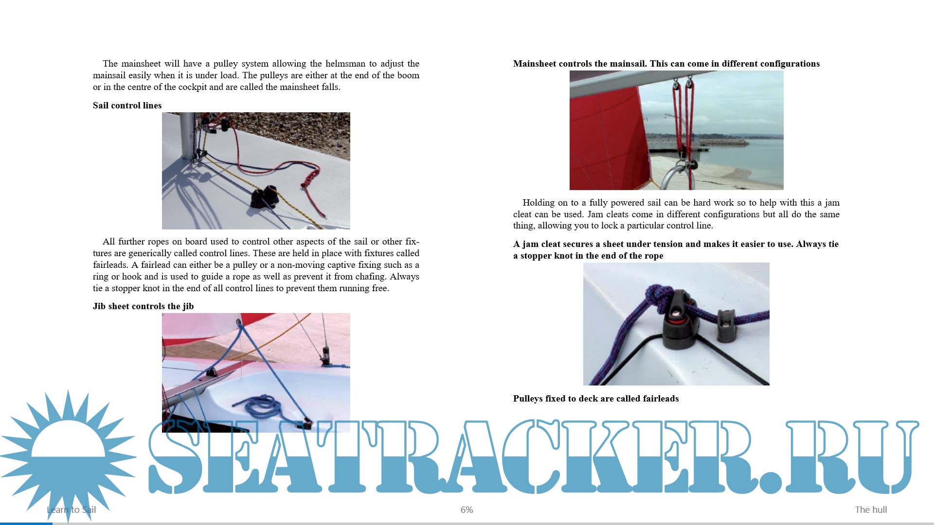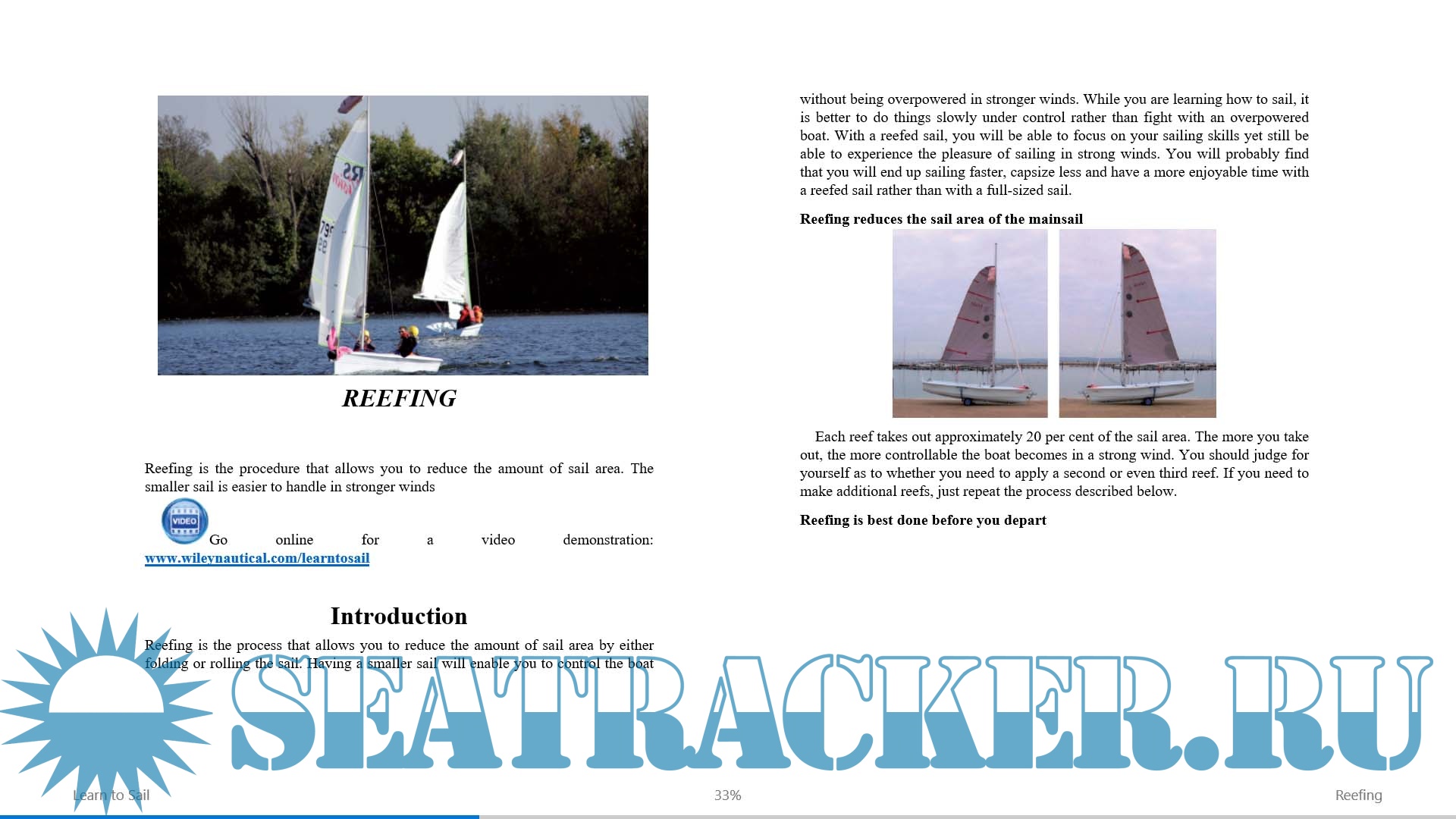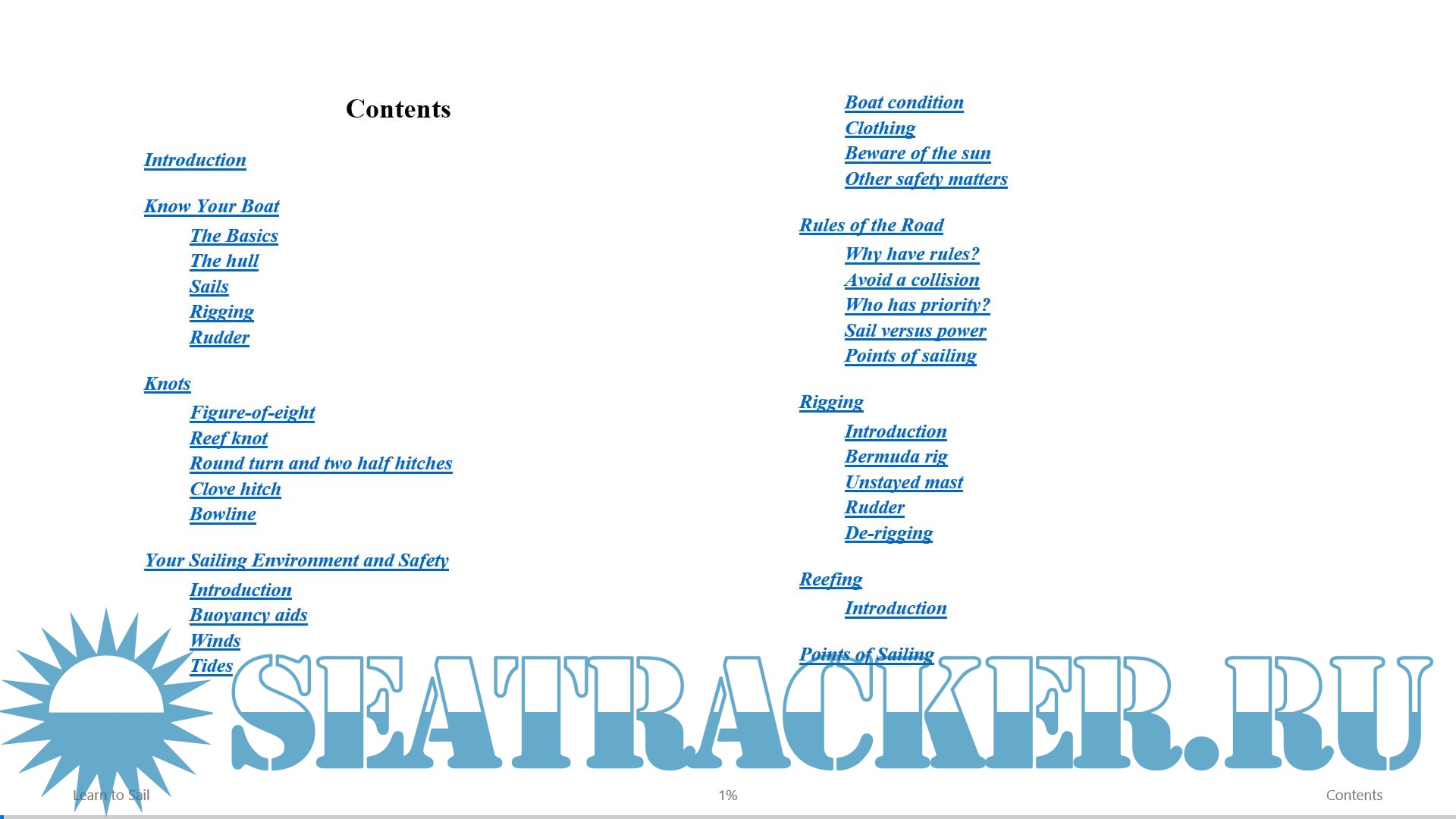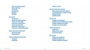 The book starts with the general information about the boats, followed by the description of the most commonly used knots. The next two chapters address the safety of the sailing and environment, and basic rules of the road. The rest of the chapters cover the rigging and reefing, sailing points, launching and recovery of beach and pontoon, and a real wealth of other important and useful knowledge.