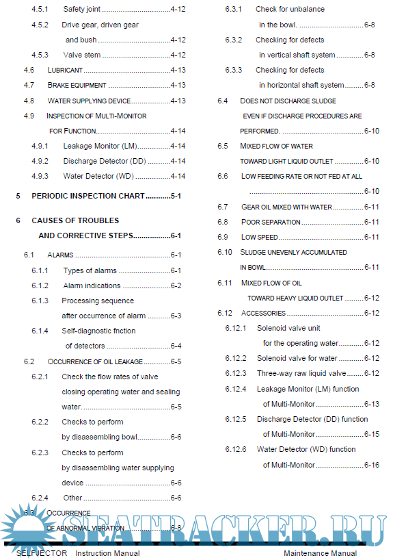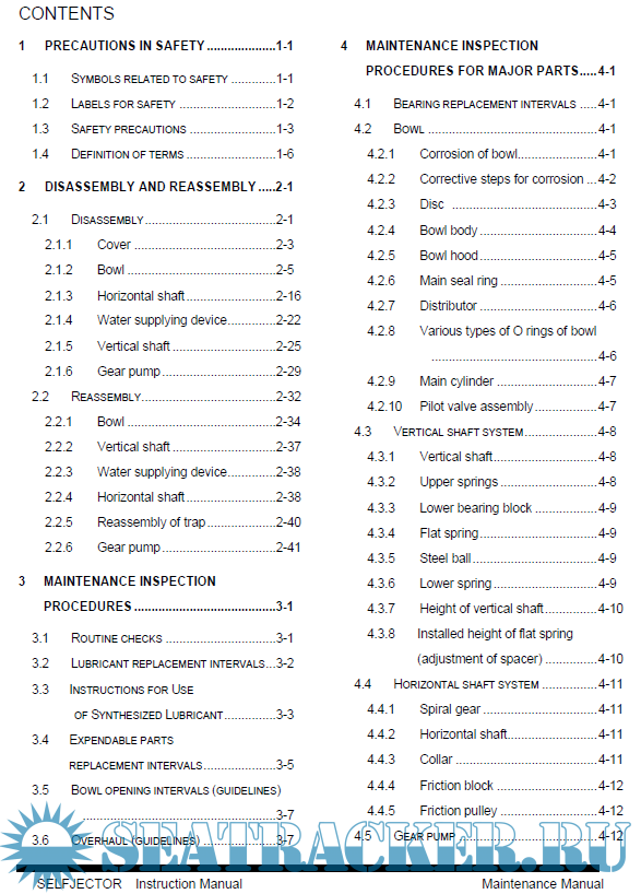 Year: 2011 Language: english Author: Samgong-mitsubishi Genre: Manual Format: PDF Quality: eBook Pages count: 101 Description: The instruction manual is a guidebook for using the automatic discharge type oil purifier, MITSUBISHI SELFJECTOR GENIUS SERIES (hereinafter referred to as SELFJECTOR). SELFJECTOR is a fast rotating centrifugal machine. Before using it, sufficiently be versed in details of the manual. Handle it safely and so as to fully exhibit the function of SELFJECTOR.