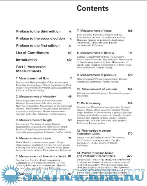 In t ro d LI c t io n xiv Part 1: Mechanical Measurements 1 Measurement off flow 3 Introduction. Basic principles of flow measurement. Fluid flow in closed pipes. Flow in open channels. Point velocity measurement. Flowmeter calibration methods. References. Further reading. 2 Measurement of viscosity 45 Introduction. Newtonian and non-Newtonian behavior. Measurement of the shear viscosity. Shop-floor viscometers. Measurement of the extensional viscosity. Measurement of viscosity under extremes of temperature and pressure. On-line measurements. Accuracy and range. References. Further reading. 3 Measurement of length 53 Introduction. The nature of length. Derived measurements. Standards and calibration of length. Practice of length measurement for industrial use. Automatic gauging systems. References. Further reading. 4 Measurement of strain 71 Strain. Bonded resistance strain gauges. Gauge characteristics. Installation. Circuits for strain gauges. Vibrating wire strain gauge. Capacitive strain gauges. Surveys of whole surfaces. Photo-elasticity. References. 5 Measurement of level and volume 81 Introduction. Practice of level measurement. Calibration of level-measuring systems. Methods providing full-range level measurement. Methods providing short-range detection. References. 6 Vibration 92 Introduction. Amplitude calibration. Sensor practice. Literature. References. Further reading. 7 Measurement of force 106 Basic concepts. Force measurement methods. Lever-balance methods. Force-balance methods. Hydraulic pressure measurement. Acceleration measurement. Elastic elements. Further developments. References. 8 Measurement of density 114 General. Measurement of density using weight. Measurement of density using buoyancy. Measurement of density using hydrostatic head. Measurement of density using radiation. Measurement of density using resonant elements. Further reading. 9 Measurement of pressure 123 What is pressure? Pressure measurement. Pressure transmitters. References. Further reading. 10 Measurement of vacuum 144 Introduction. Absolute gauges. Non-absolute gauges. References. 11 Particle sizing 154 Introduction. Characterization of particles. Terminal velocity. Optical effects caused by particles. Particle shape. Methods for characterizing a group of particles. Analysis methods that measure size directly. Analysis methods that measure terminal velocity. Analysis methods that infer size from some other property. References. Further reading. 12 Fiber optics in sensor instrumentation 17 Introduction. Principles of optical fiber sensing. Interferometric sensing approach. Doppler anemometry. In-fiber sensing structures. References. 13 Microprocessor-based and intelligent transmitters 208 Introduction. Terminology. Background information. Attributes and features of microprocessor-based and intelligent transmitters. Microprocessor-based and intelligent temperature transmitters. Microprocessorbased and intelligent pressure and differential transmitters. Microprocessor-based and intelligent flowmeters. Other microprocessor-based and intelligent transmitters. Other microprocessor-based and intelligent measurement systems. Fieldbus. Uservi Contents experience with microprocessor-based and intelligent transmitters. Fieldbus function and benefits. References. Part 2: Measurement of Temperature and Chemical Composition 14 Temperature measurement 239 Temperature and heat. Temperature scales. Measurement techniques: direct effects. Measurement techniques: electrical. Measurement techniques: thermocouples. Measurement techniques: radiation thermometers. Temperature measurement considerations. References. Further reading. 15 Chemical analysis: introduction 303 Introduction to chemical analysis. Chromatography, Polarography and anodic stripping voltammetry. Thermal analysis. Further reading. 16 Chemical analysis: spectroscopy 31 8 Absorption and reflection techniques. Atomic techniques: emission, absorption, and fluorescence. X-ray spectroscopy. Photo-acoustic spectroscopy. Microwave spectroscopy. Neutron activation. Mass spectrometers. References. Further reading. 17 Chemical analysis: electrochemical techniques 343 Acids and alkalis. Ionization of water. Electrical conductivity. The concept of pH. Electrode potentials. Ion-selective electrodes. Potentiometry and specific ion measurement. Common electrochemical analyzers. Further reading. 18 Chemical analysis: gas analysis 382 Introduction. Separation of gaseous mixtures. Detectors. Process chromatography. Special gas analyzers. Calibration of gas analyzers. Further reading. 19 Chemical analysis: moisture measurement 41 4 Introduction. Definitions. Measurement techniques Calibration. References. Part 3: Electrical and Radiation Measurements 20 Electrical measurements 425 Units and standards of electrical measurement. Measurement of d.c. and a.c. current and voltage using indicating instruments. Digital voltmeters and digital multimeters. Power measurement. Measurement of electrical energy. Power-factor measurement. The measurement of resistance, capacitance, and inductance. Digital frequency and periodhie-interval measurement. Frequency and phase measurement using an oscilloscope. References. Further reading. 21 Optical measurements 492 Introduction. Light sources. Detectors. Detector techniques. Intensity measurement. Wavelength and color. Measurement of optical properties. Thermal imaging techniques. References. 22 Nuclear instrumentation technology 517 Introduction. Detectors. Electronics. References. Further reading. 23 Measurements employing nuclear techniques 547 Introduction. Materials analysis. Mechanical measurements. Miscellaneous measurements. References. 24 Non-destructive testing 566 Introduction. Visual examination. Surface-inspection methods. Ultrasonics. Radiography. Underwater non-destructive testing. Developments. Certification of personnel. References. Further reading. 25 Noise measurement 596 Sound and sound fields. Instrumentation for 