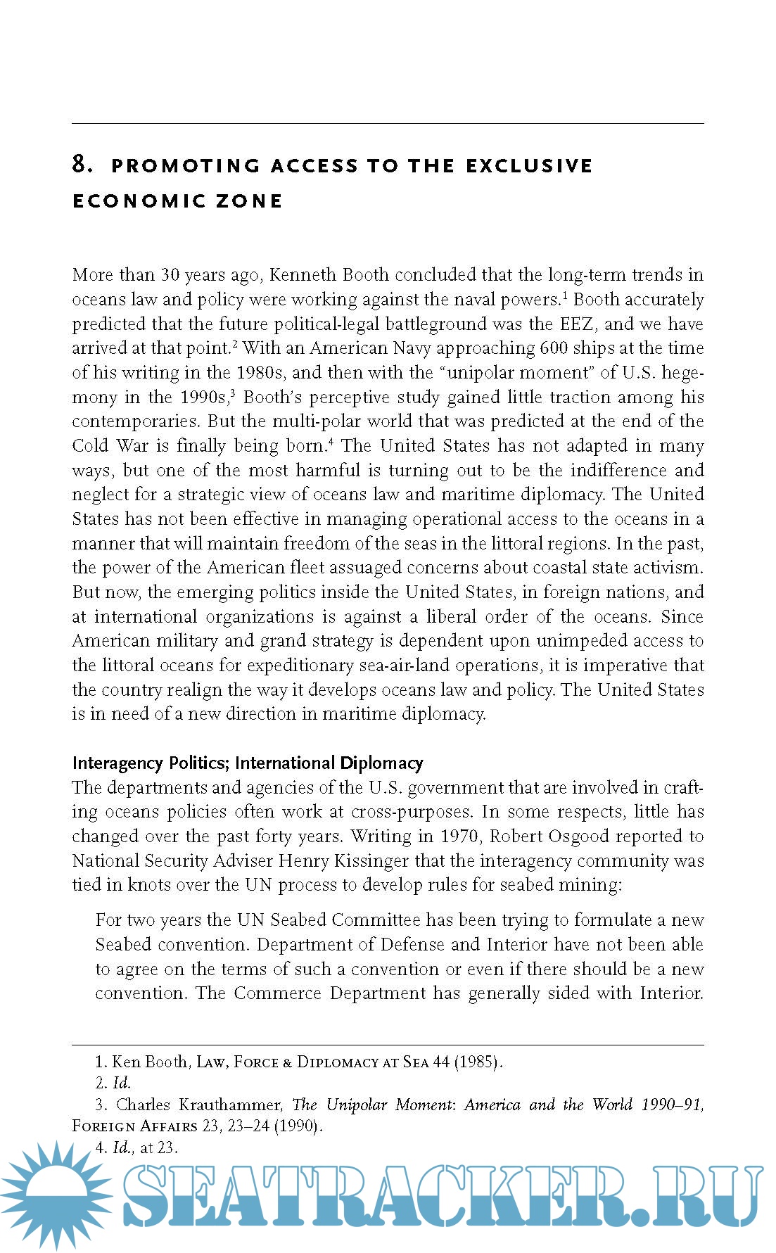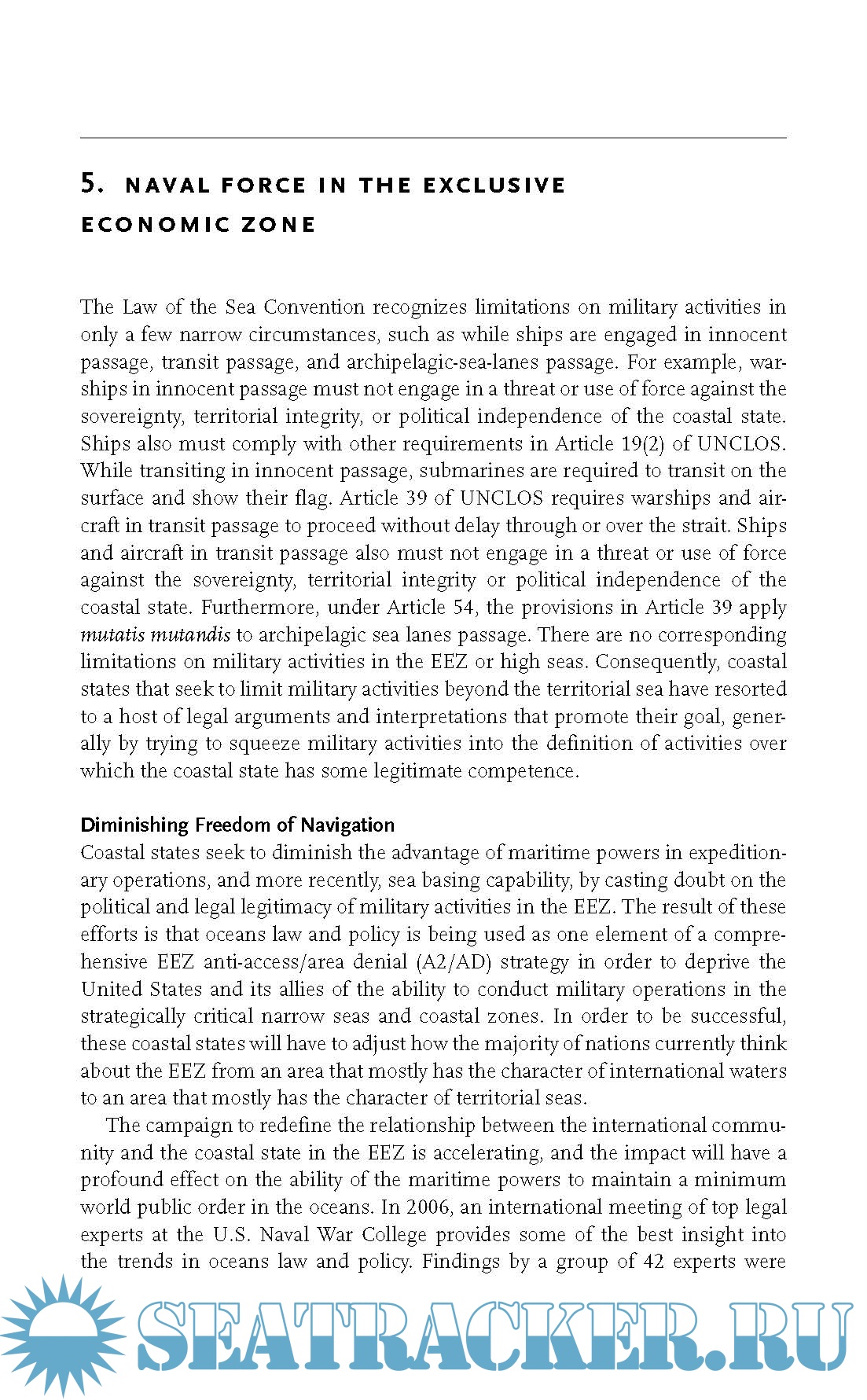 Commander Kraska describes how control of the global commons, coupled with new approaches to sea power and expeditionary force projection, has given the United States and its allies the ability to assert overwhelming sea power to nearly any area of the globe. But as the law of the sea gravitates away from a classic liberal order of the oceans, naval forces are finding it more challenging to accomplish the spectrum of maritime missions in the coastal littorals, including forward presence, power projection, deterrence, humanitarian assistance and sea control. The developing legal order of the oceans fuses diplomacy, strategy and international law to directly challenge unimpeded access to coastal areas, with profound implications for American grand strategy and world politics.