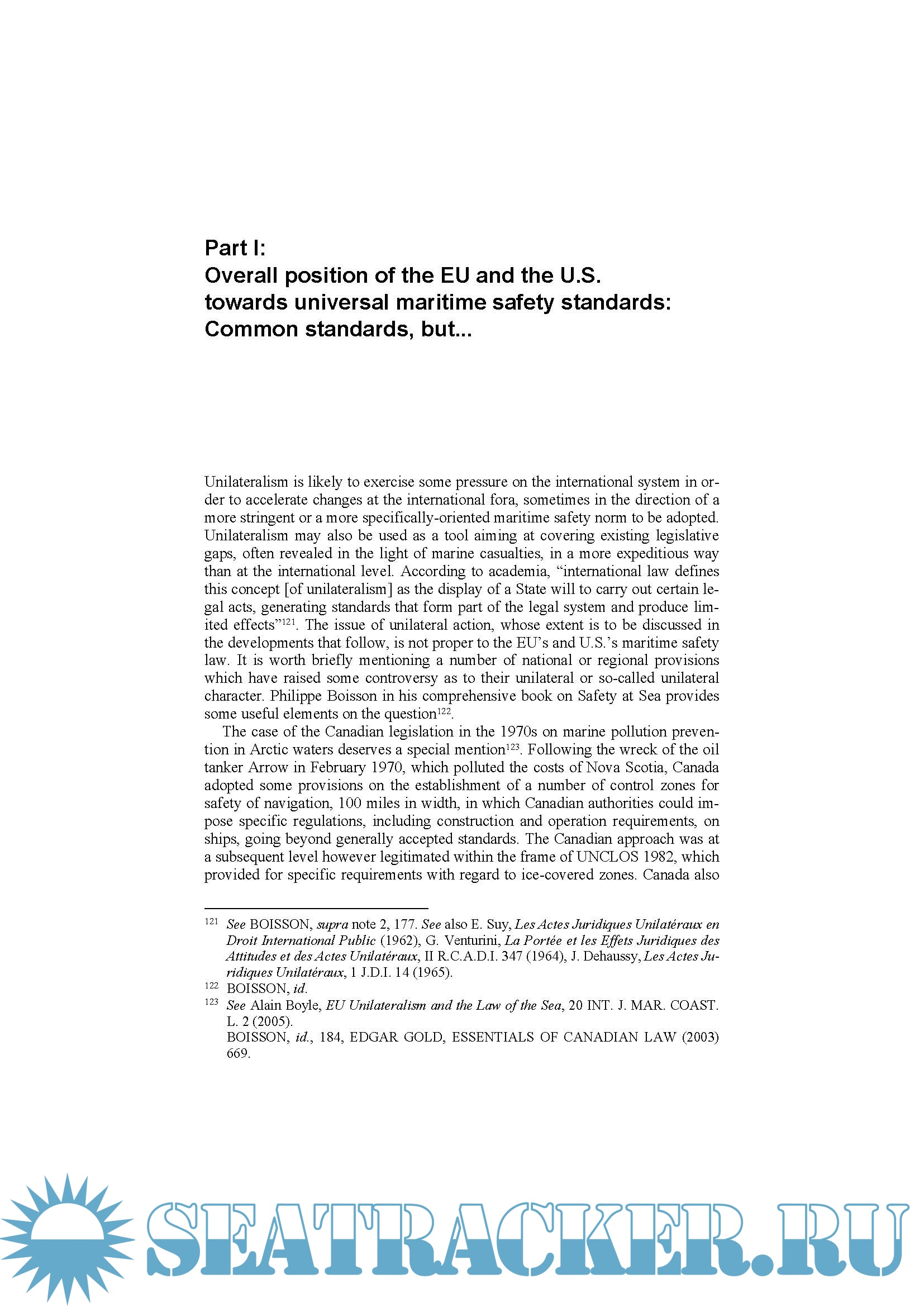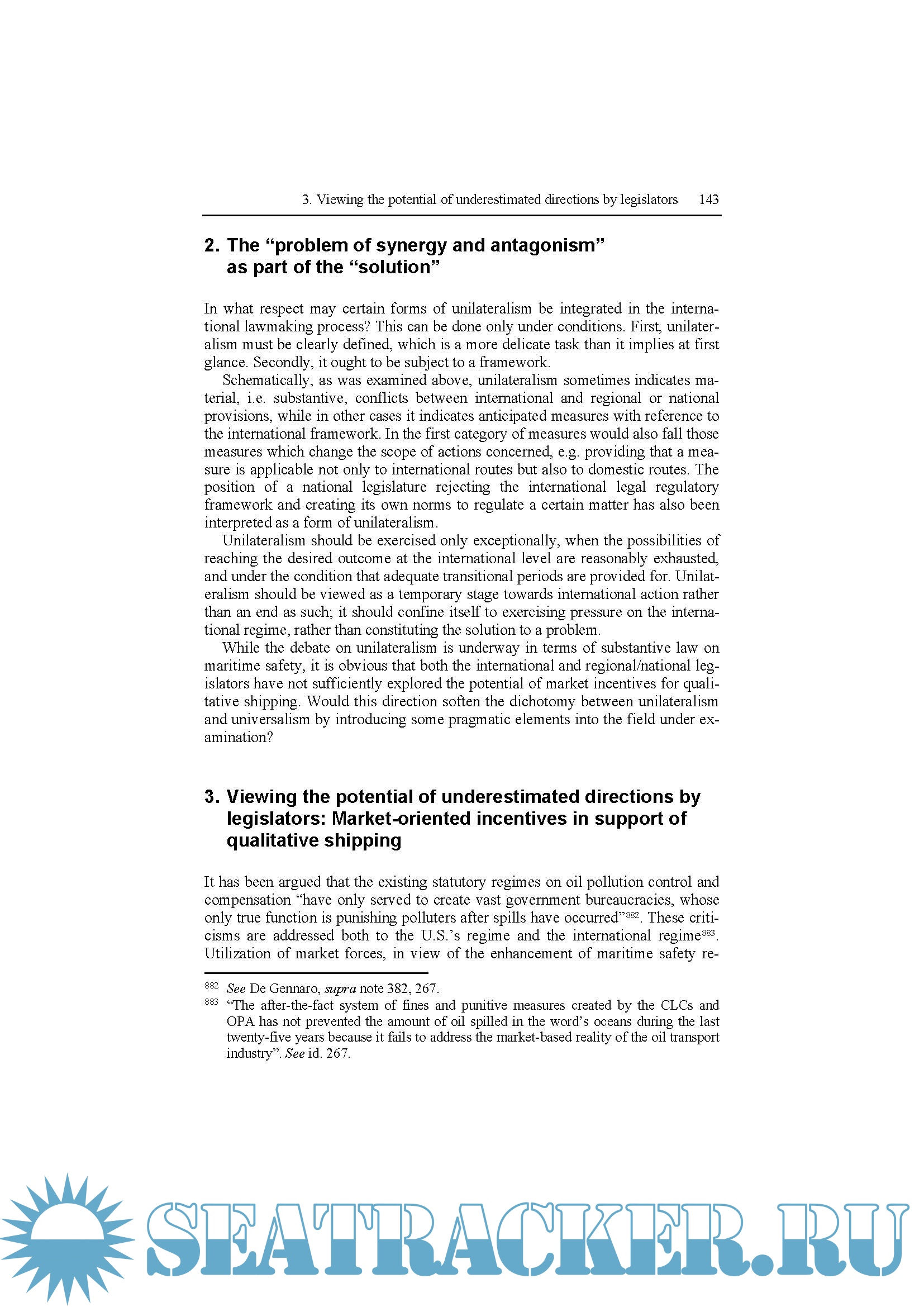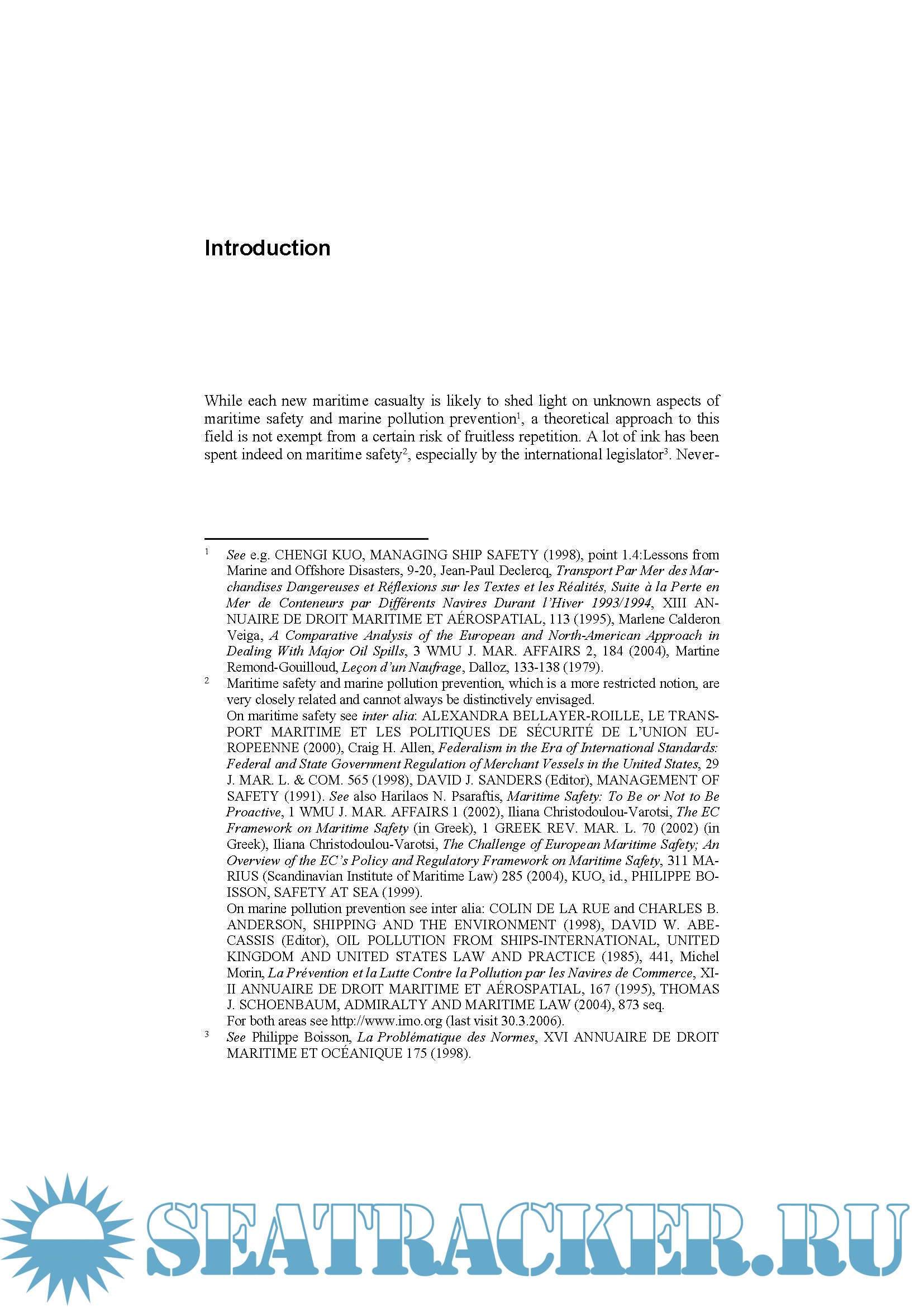 In so doing, she raises the question of whether certain manifestations of unilateralism, illustrated by instruments proposed or adopted by the European Union and the United States, should or should not be integrated into the international law-making process to improve maritime safety and environmental protection. She concludes that unilateralism should be seen as a potential stage towards international action, rather than as constituting the solution to a problem, and should be exercised only exceptionally, when the possibility of reaching the desired outcome at the international level has been exhausted.
