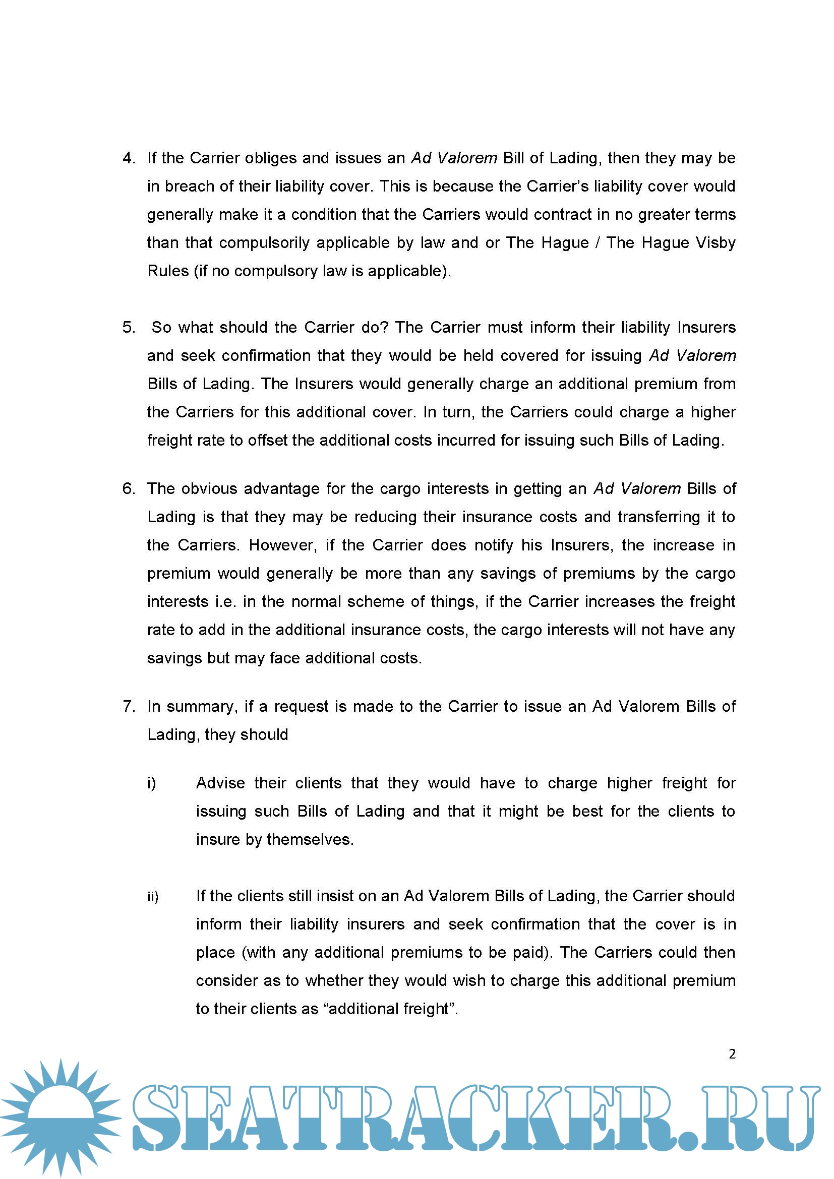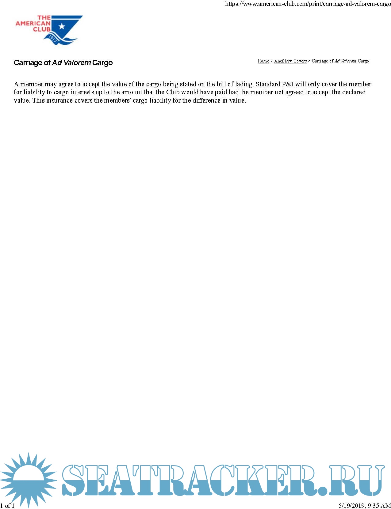 Description: Ad Valorem - (“at value”) – an ad valorem freight rate is one where the freight is based on the value of the goods. An ad valorem bill of lading is one where the value of the goods is shown on the face of the document, which value then becomes the carrier’s limit of liability, in return for this increased liability the carrier will charge an addition to the sea freight.