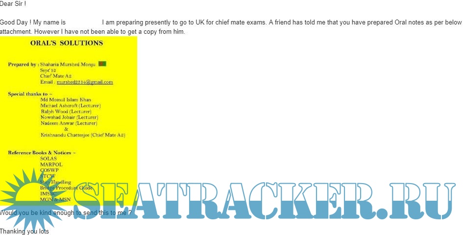 Year: 2018 Language: english Author: Shahariar Murshed Genre: Documentation Format: PDF Quality: eBook Pages count: 247 Description: Mates & Masters Orals for Maritime & Coastguard Agency Examination Purpose . Updated Copy for 2018. The author has indicated that this is a work in progress and hence a newly updated version would be released soon. The use of this is to help in those preparing for UK MCA master exams Additional info: Kindly note that this is a copy of a torrent earlier posted by a user name anthony george. However he was not seeding despite many requests. I had even PM'd him asking to seed. There was an email written in the poster. So I send an email to the author requesting for a copy. The Good gentleman replied back with the copy and also promised to send a new one upon completion of updating it. I have attached screenshots of the email also.