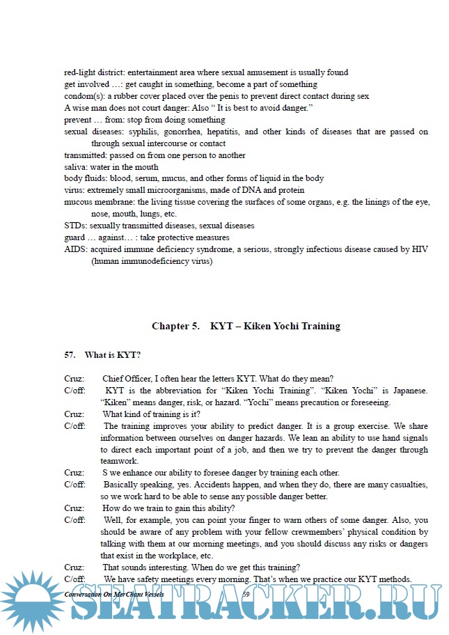 Year: 201? Language: english Author: Unknown Genre: Textbook Publisher: ? Format: PDF Quality: eBook Pages count: 115 Description: Welcome on Board! Conversations on Merchant Vessels recreates various situations that seamen often encounter on board merchant ships, plus some scenes that take place on shore. Each situation is selected for the purpose of familiarizing seamen with the realities of their life, while learning English, which is the universal language of navigation. By practicing the conversations, notes and keywords, you can experience, first hand, realistic developments that occur on board merchant vessels. The conversations also include some practical advise on seamen’s life, actual navigational operations, realistic descriptions of ship-bound equipment and navigation techniques. The level of English increases gradually as the story unfolds. In the first few chapters, conversations are general with simple vocabulary and grammatical structure. These language elements become slightly more difficult as you progress. However, you needn’t worry. Most of the difficult words and technical terms are explained in simple English in the <Notes> that appear below each conversation. These terms, or keywords, are clearly marked with red ink in the text. Now you need not consult a dictionary each time you encounter an unknown word! In order to help you learn the accurate pronunciation, intonation and rhythm, which are all important aspects of language learning, four compact disks (CDs) are provided for you. Close-to-real depiction and enactment of each scene has been created through the voice talents of Bianca Allen, Dennis Falt, Michael Naishtut, Greg Irwin and other professional voice actors and narrators. So just sit back and enjoy the 115 dramatized scenes that you are likely to encounter on board a merchant ship. Now, listen to the CDs first and read the textbook later. Of, if you prefer, listen as your eyes trail on the text. However you study, remember that the best way of mastering a language is by hearing and repeating. Just like a baby picking up its mother tongue, listen to the sounds of English over and over and repeat them. Then study with the textbook and review the Notes. Lastly, all the members of the editorial staff wish each one of you the best of luck in sailing across the world while learning English. Have a safe and enjoyable journey! Bon voyage!