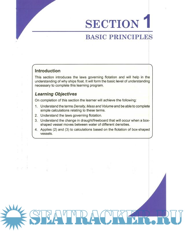 Based on the syllabus for Ship Stability for the STCW 95 Chief Mate/Master this study manual for deck officers includes the following chapters: Basic Principles, Form Coefficients, Tonnes Per Centimetre Immersion, Introduction to Load Lines, Centre of Gravity (G) and Centre of Buoyancy (B), and Introduction to Transverse Statical Stability, Conditions of Stability, Initial Transverse Metacentre, Free Surface Effect, Curves of Statical Stability, List, Introduction to Trim, Suspeneded Weights, Assession Compliance of a Ship’s Loaded Condition with IMO Criteria, Curves of Statical Stability, The Wall Sided Formula, Factors Affecting G2 Curve Shape, The International Grain Code, Inclining Experiment, Trim Using Hydrostatic Data, Dry Docking, Bilging, Angle of Heel dur to Turning, Wind Ice and Rolling Effects, Stability Problems Associated with Specific Ship Types, Calculation and Assignment of Freeboard, Shear Forces and Bending Moments in Ships, and Practical Ship Loading Problems.