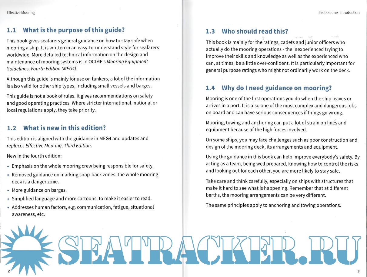 Year: 2019 Language: english Author: OCIMF Genre: Guide Publisher: Witherby Publishing Group Ltd. Edition: 4th ISBN: 978-1-85609-807-6 Format: PDF Quality: Scanned pages Pages count: 41 Description: Mooring is one of the most complex and dangerous operations for ship and terminal crew. If something goes wrong, the consequences can be severe. Effective Mooring gives crew a general introduction to mooring and guidance on how to stay safe during mooring operations. It is written in an easy-to-understand style for seafarers worldwide and can be used as a training guide for both new and experienced crew. Produced by the Oil Companies International Marine Forum (OCIMF), the book is written for crew on board oil tankers, barges and terminals, but the principles can be applied to any vessel. This fourth edition of Effective Mooring is aligned with the guidance in OCIMF’s Mooring Equipment Guidelines, Fourth Edition (MEG4), which contains more detailed technical information on the design and maintenance of mooring systems. Additional info: New in Effective Mooring, Fourth Edition: Emphasis on the whole mooring crew being responsible for safety. Removed guidance on marking snap-back zones: the whole mooring deck is a danger zone. More guidance on barges. Simplified language and more cartoons, to make it easier to read. Addresses human factors, e.g. communication, fatigue, situational awareness, etc.