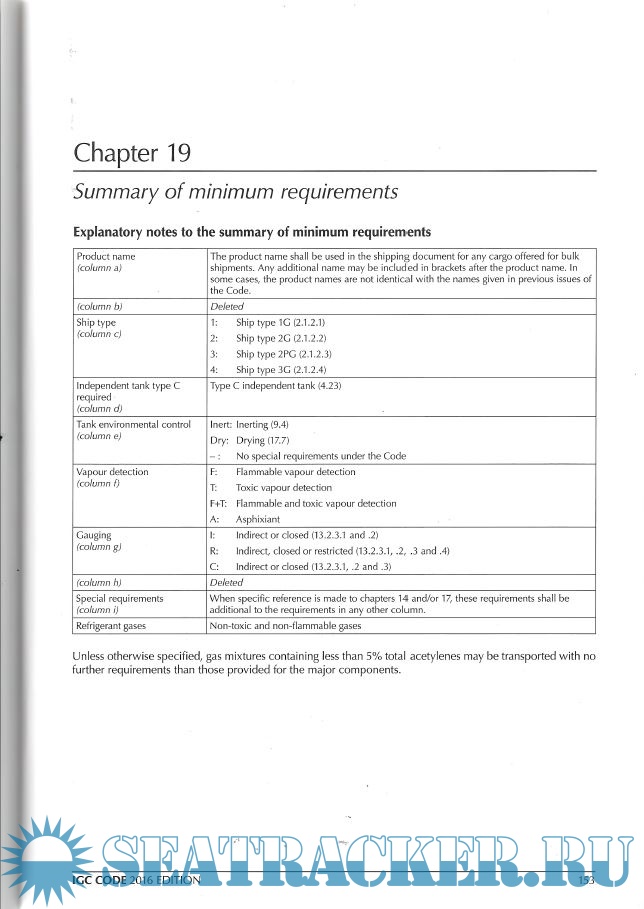 Additional info: The purpose of this Code is to provide an international standard for the safe carriage, by sea in bulk, of liquefied gases and certain other substances that are listed in chapter 19. Through consideration of the products carried, it prescribes the design and construction standards of the ships involved and the equipment they should carry to minimize the risk to the ship, its crew and the environment.