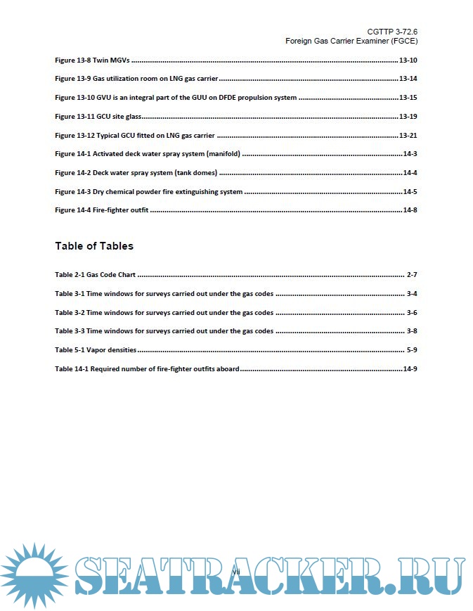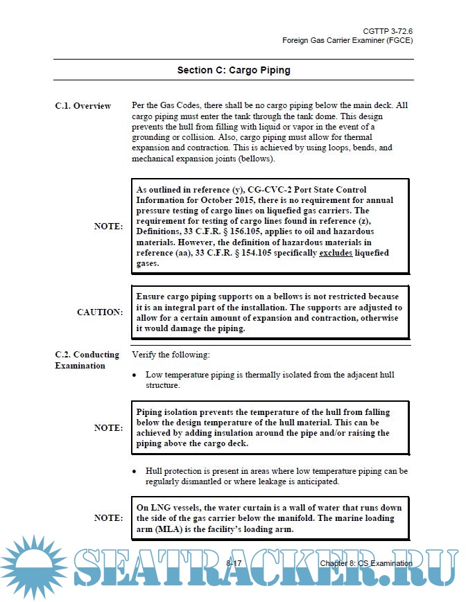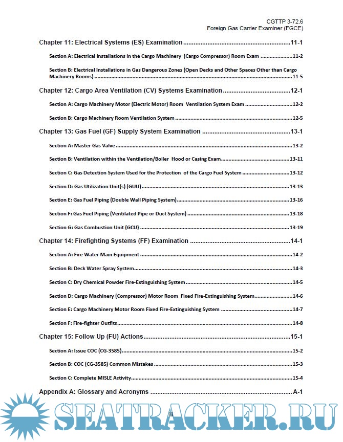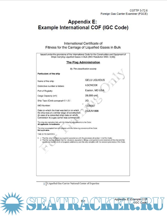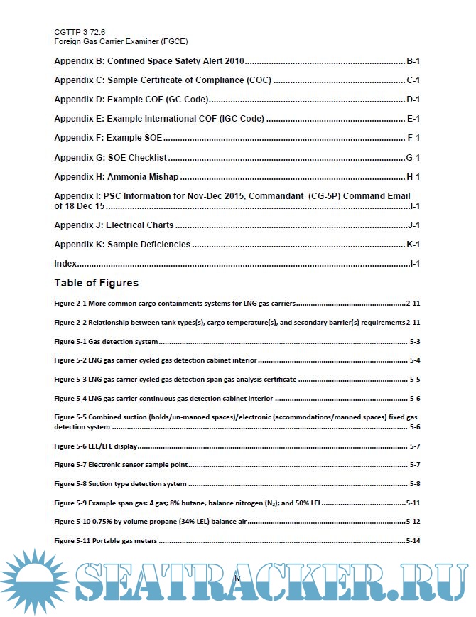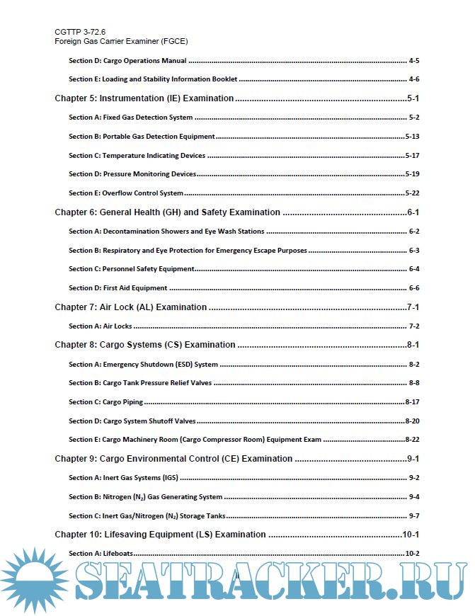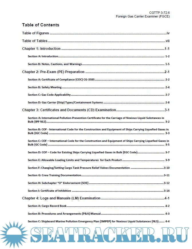 Description: Purpose of this publication: To provide port state control officers (PSCOs) and apprentice marineinspectors (AMIs) with Coast Guard tactics, techniques, and procedures (CGTTP) onCertificate of Compliance (COC) examinations of foreign-flagged liquefied gas carriers.
