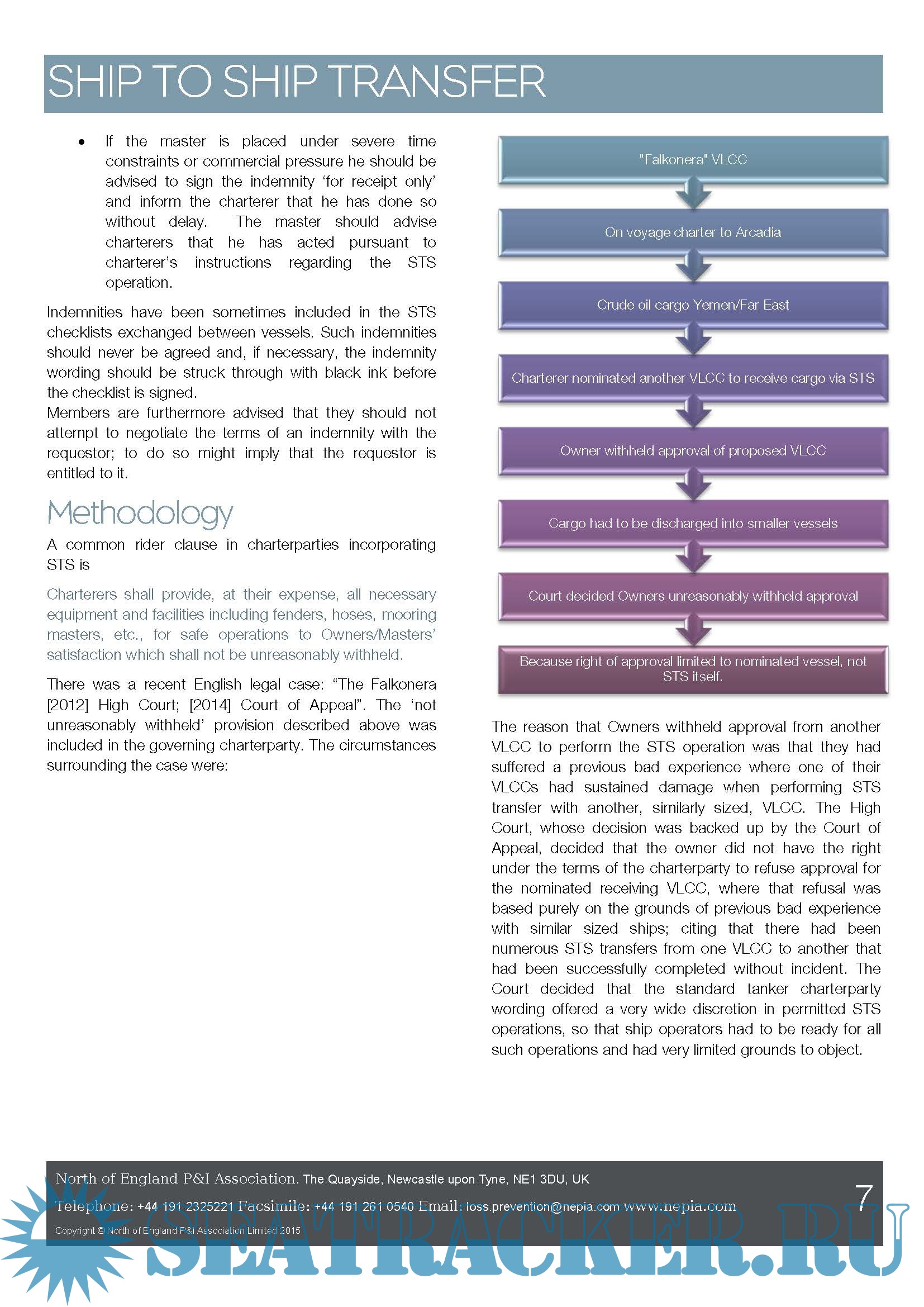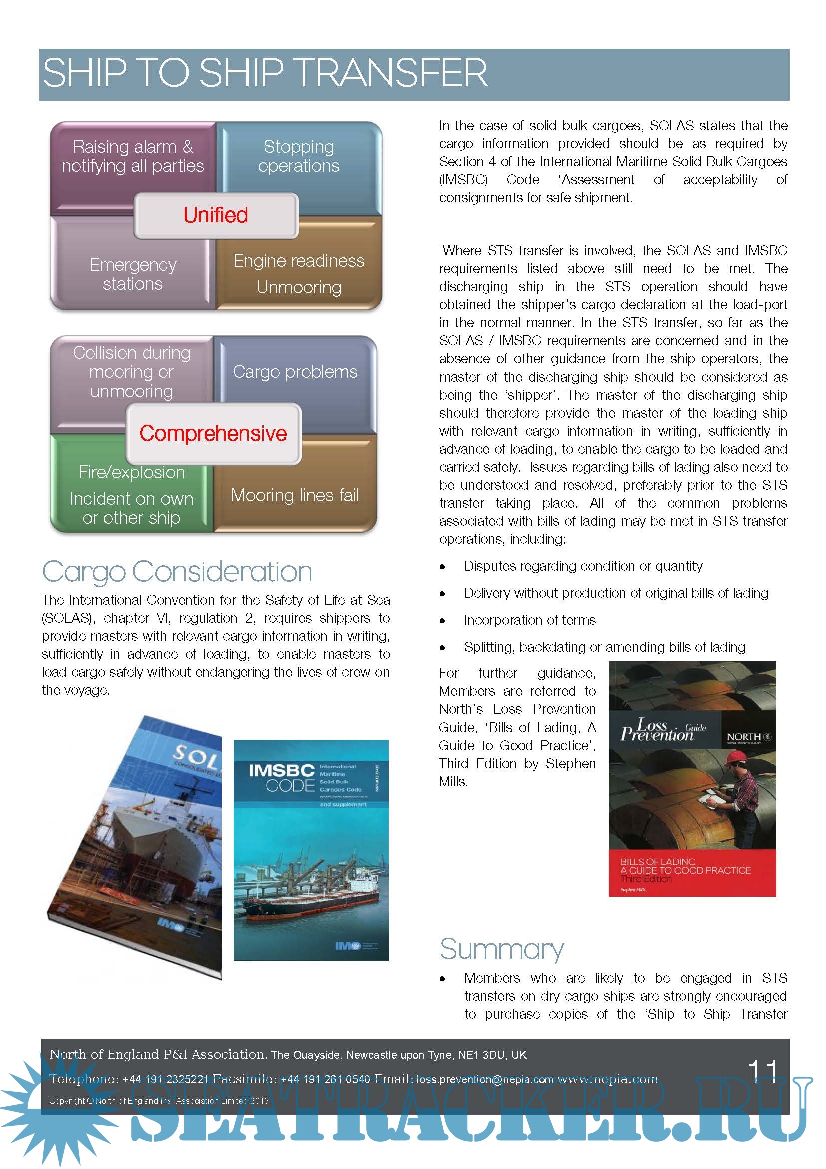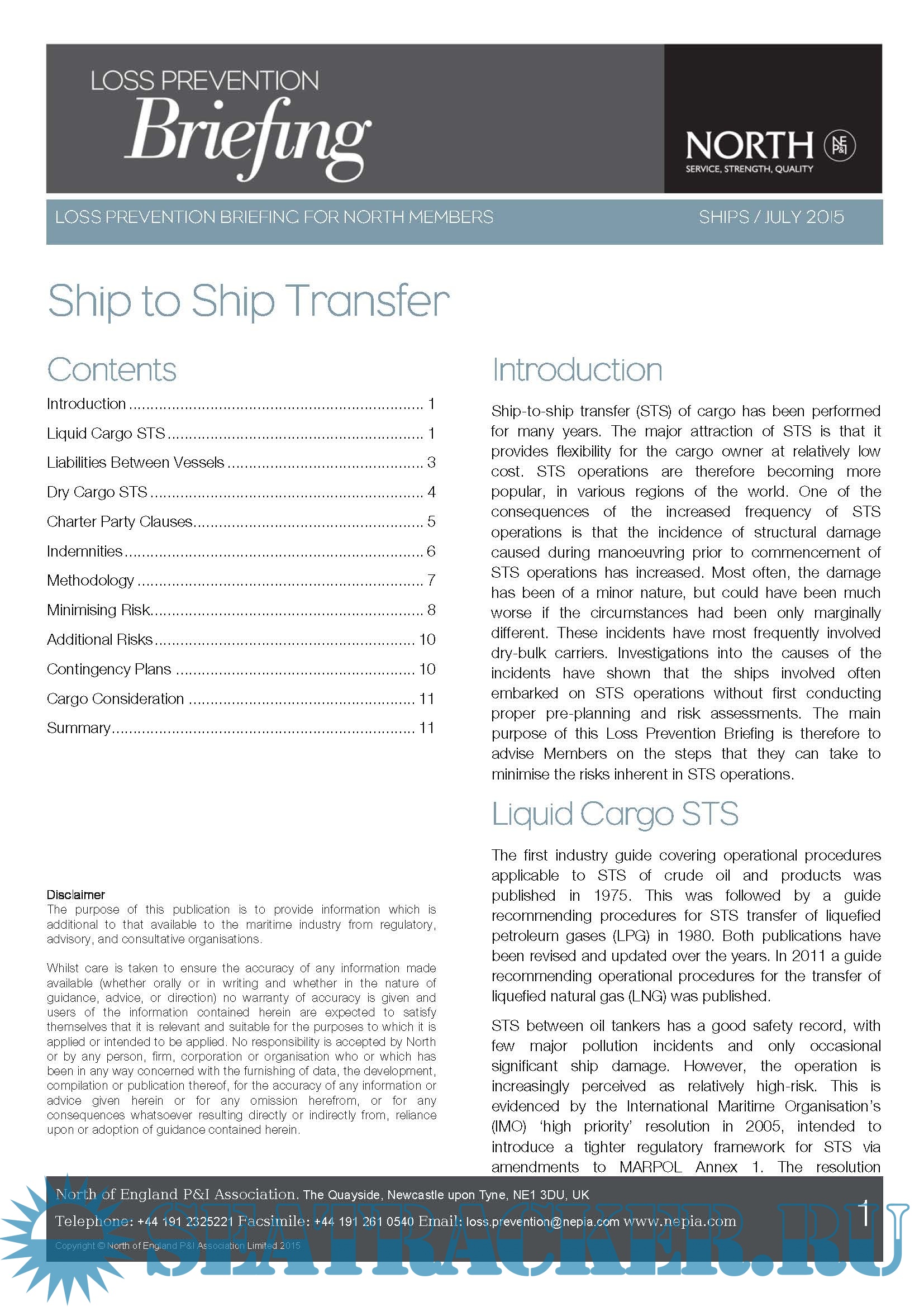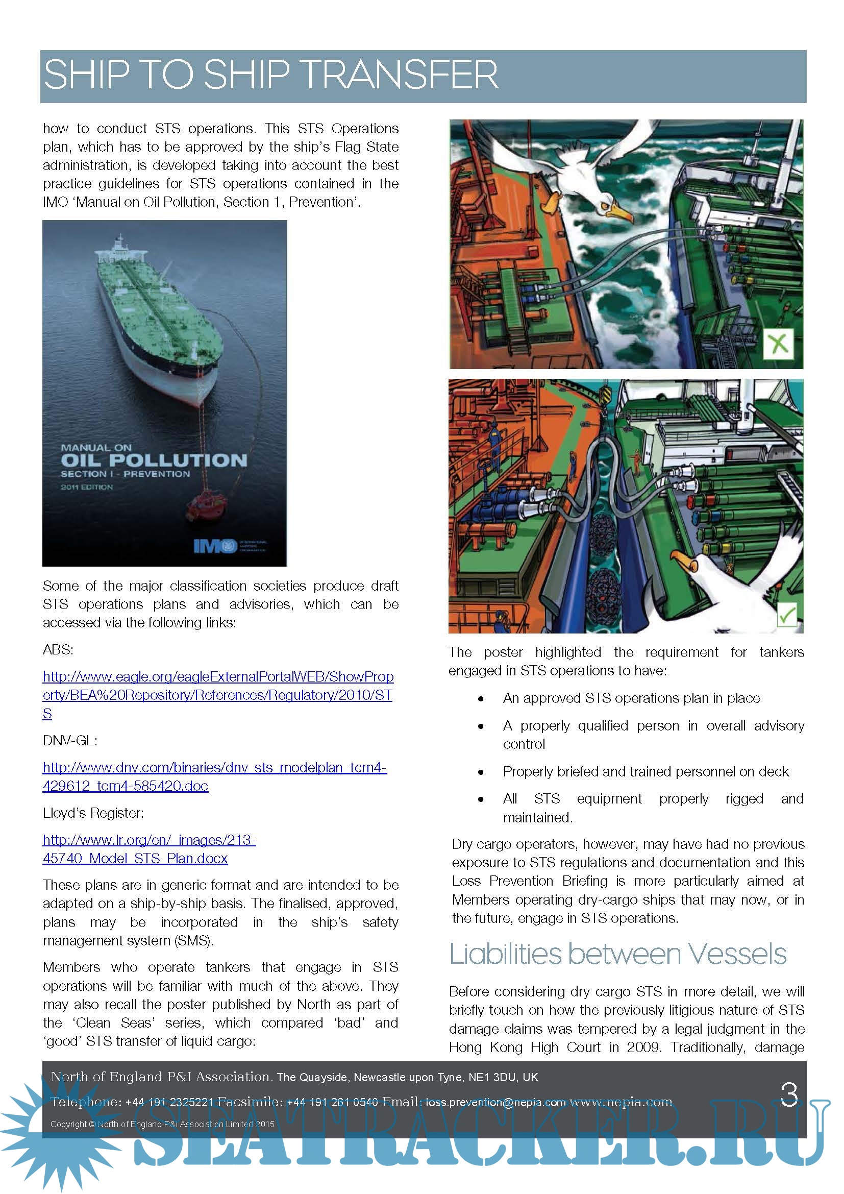 Description: Ship-to-ship transfer (STS) of cargo has been performed for many years. The major attraction of STS is that it provides flexibility for the cargo owner at relatively low cost. STS operations are therefore becoming more popular, in various regions of the world. One of the consequences of the increased frequency of STS operations is that the incidence of structural damage caused during manoeuvring prior to commencement of STS operations has increased. Most often, the damage has been of a minor nature, but could have been much worse if the circumstances had been only marginally different. These incidents have most frequently involved dry-bulk carriers. Investigations into the causes of the incidents have shown that the ships involved often embarked on STS operations without first conducting proper pre-planning and risk assessments. The main purpose of this Loss Prevention Briefing is therefore to advise Members on the steps that they can take to minimise the risks inherent in STS operations.