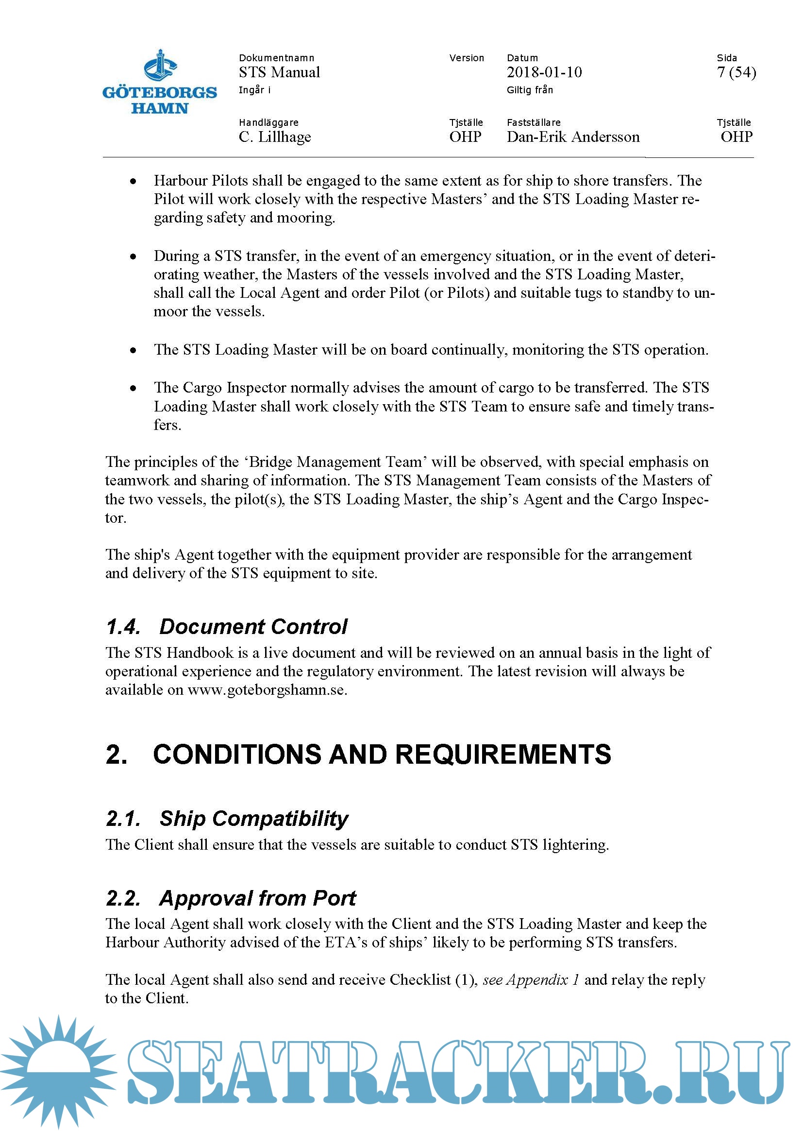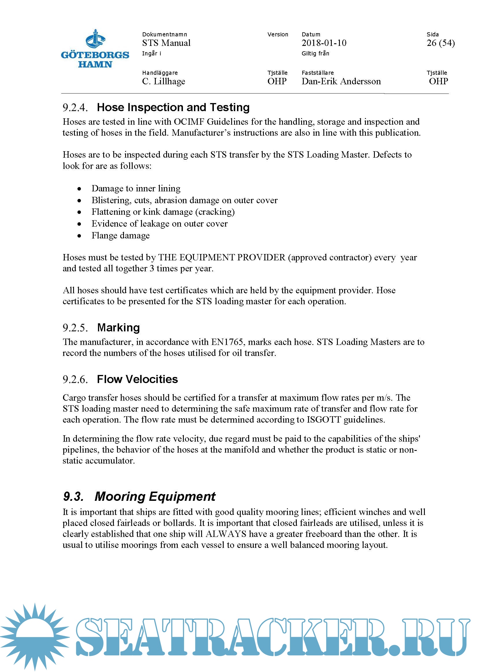 Year: 2018 Language: english Author: Goteborgs Hamn Genre: Handbook Format: PDF Quality: eBook Pages count: 54 Description: This handbook does not overrule any General Directions, Notice to Mariners or other instruc-tions that may be issued by The Harbour Authority. The Harbour Authority can order the STS operation to stop at any time if it is believed that there is a risk of pollution or if the weather is forecast to deteriorate to unsafe operational levels. The latest version of the document “Ship to Ship Transfers Port of Gothenburg” is always available on Port of Gothenburg’s homepage. If this is a printed version of the document always check that there are no later revisions available. Masters of vessels are to be guided by the latest ICS/OCIMF STS Transfer Guide, ISGOTT, Company Procedures and Harbour Byelaws and General Directions for Navigation. The STS Loading Master will advise the Master both verbally and via checklists of any local require-ments. The objective of this document is to ensure that all STS transfers are conducted in accordance with OCIMF STS GUIDE, ISGOTT and the port Oil Spill Contingency Plan (OSCP) in a consistently safe and efficient manner.
