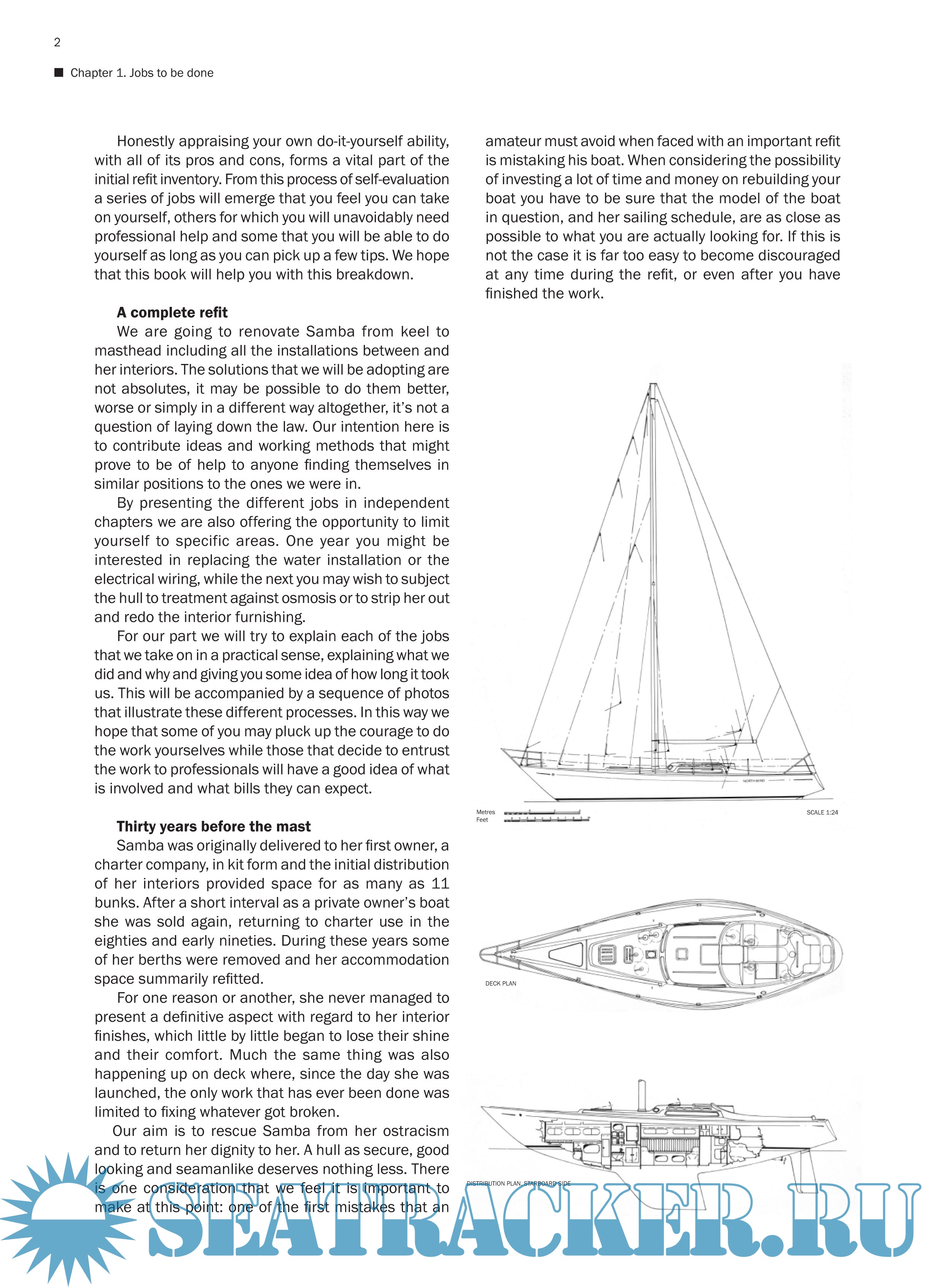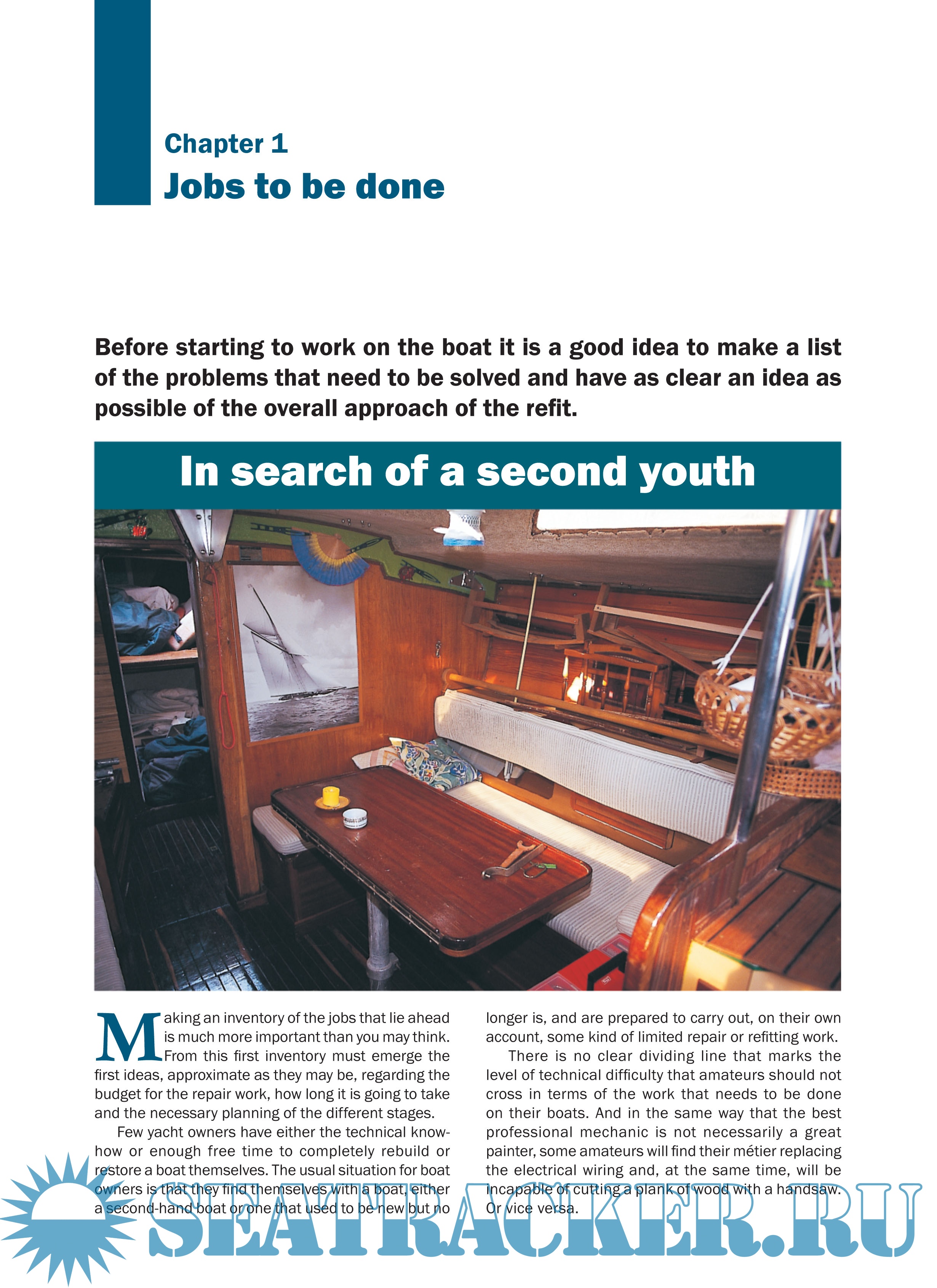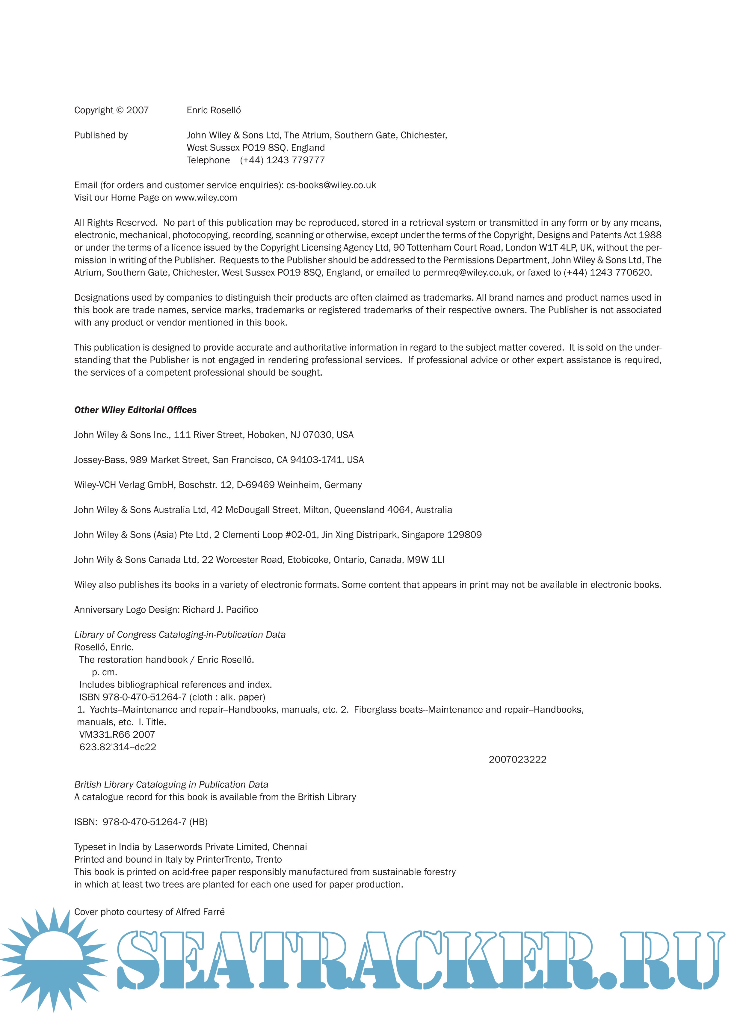 Year: 2007 Language: english Author: Enric Roselló Genre: Handbook Publisher: John Wiley & Sons Ltd ISBN: 978-0-470-51264-7 Format: PDF Quality: eBook Pages count: 278 Description: Restoring a fibreglass yacht is not something for the faint-hearted, even if you don’t intend to do all the work yourself (you still need to understand the processes to be gone through). But the satisfaction of the job well done, not to mention the possible cost savings on buying a new yacht, are immense. Nevertheless, it is not something that should be undertaken lightly and without careful consideration. That is where this book comes in, as Enric Roselló takes you through his restoration of a 30-year-old 40-foot yacht. Broken down into 46 chapters, Enric details the stages of his restoration in chronological order. For each he starts with an overview of the task and the thinking behind the approach he took. Just these introductory pieces alone are ideal for someone contemplating a restoration (of all or part of a boat) to read before making the final decision as to whether to go ahead. For those who decide to take on the challenge, each overview is followed by an in-depth step-by-step account of what they did, accompanied by numerous informative photo sequences (with over 800 colour photos in total). The material in this book would be invaluable both to boat owners who are considering a complete overhaul and to those who have one or two smaller jobs to do. All possible subjects are covered, including dealing with osmosis, the interiors, deck, rigging, electrics and electronics, plumbing, engine, galley, heads and much more. The author is very honest about the amount of work and commitment required and also offers advice about when to call in the professionals and when to consider doing the work yourself. Anyone contemplating a complete or partial restoration is advised to read this book beforehand, so you know what is ahead, and to follow its guidance if you to decide to proceed.