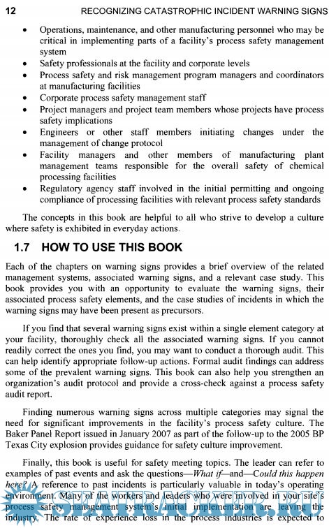 Description: Recognizing Catastrophic Incident Warning Signs in the Process Industries Warning signs are indicators that something is wrong or about to go wrong. When we recognize and act on these indicators, a loss may be prevented. Of course, this will only happen when we know what to look for and are willing to take the