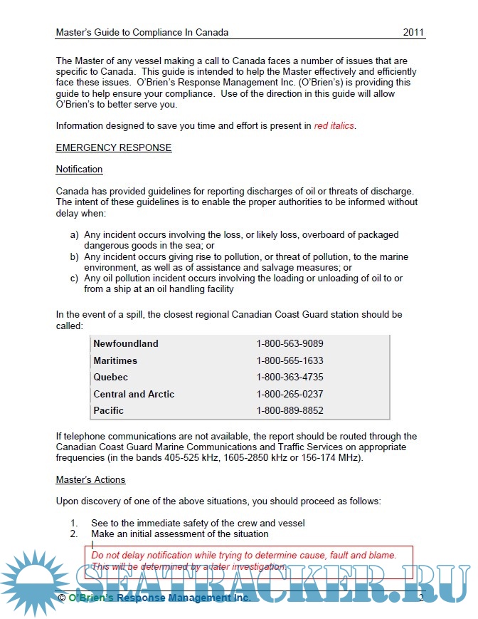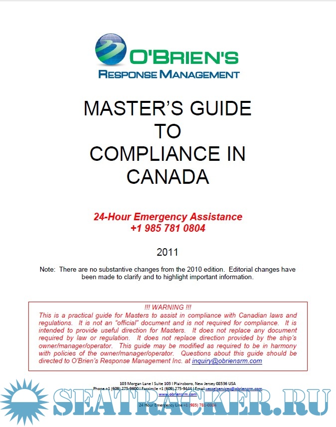 Description: The Master of any vessel making a call to Canada faces a number of issues that are specific to Canada. This guide is intended to help the Master effectively and efficiently face these issues. O’Brien’s Response Management Inc. (O’Brien’s) is providing this guide to help ensure your compliance. Use of the direction in this guide will allow O’Brien’s to better serve you.