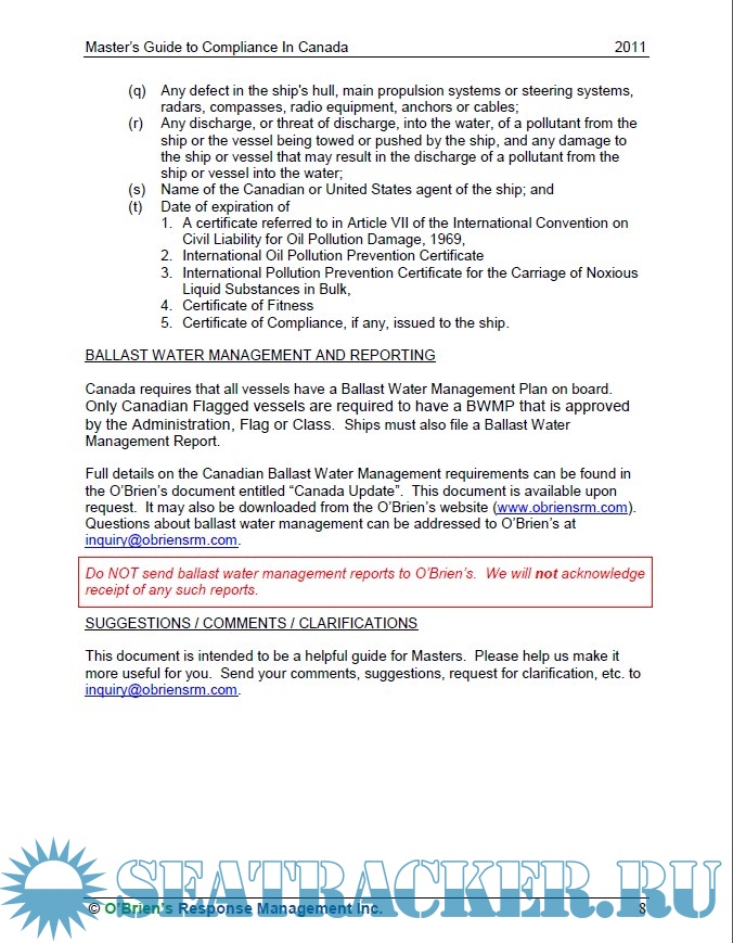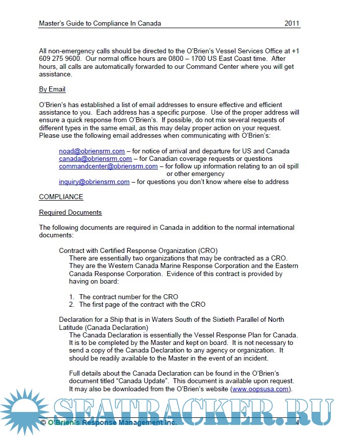 Year: 2011 Language: english Author: O'Brien's Genre: Practical guide Publisher: O’Brien’s Response Management Inc. Format: PDF Quality: eBook Pages count: 8 Description: The Master of any vessel making a call to Canada faces a number of issues that are specific to Canada. This guide is intended to help the Master effectively and efficiently face these issues. O’Brien’s Response Management Inc. (O’Brien’s) is providing this guide to help ensure your compliance. Use of the direction in this guide will allow O’Brien’s to better serve you. Information designed to save you time and effort is present in red italics.