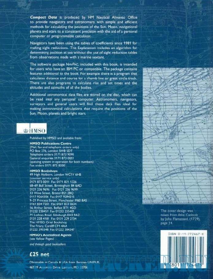 Description: This work is produced by HM Nautical Almanac Office to provide navigators and astronomers with simple and efficient methods for calculating the positions of the Sun, Moon, navigational planets and stars to a consistent precision with the aid of a personal computer or programmable calculator. Navigators have been using the tables of co-efficients since 1981 for making sight reductions. The explanation includes an algorithm for determining position at sea without the use of sight reductions tables from observations made with a marine sextant. The software package, NavPac, included with this book, is intended for users who have an IBM PC or compatible. The package contains features additional to the book. For example, there is a programme that calculates distance and course for a rhumb line or great circle track. There are also programs to calculate rise and set times and the altitudes and azimuths of all the bodies. Additional astronomical data files are stored on the disk, which can be read into any personal computer. Astronomers, navigators, surveyors and general users should find these data files useful for making astronomical calculations that require the positions of the Sun, Moon, planets and bright stars.