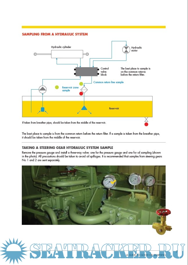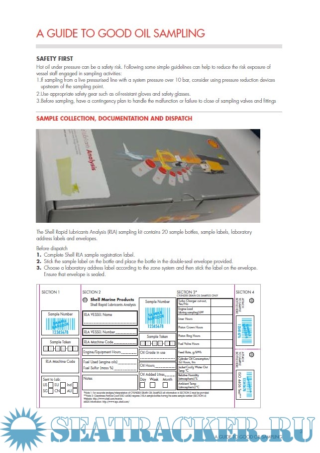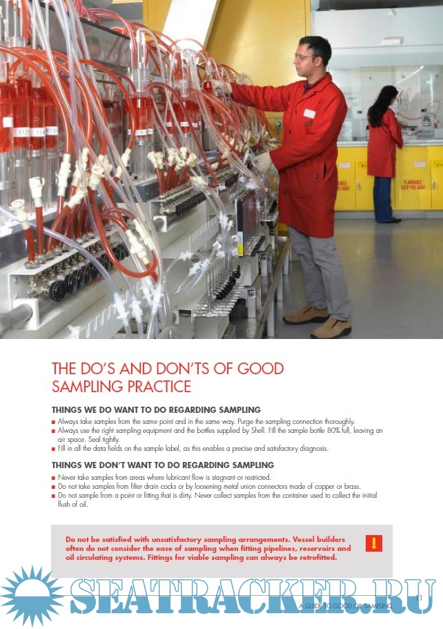 1. The importance of correct oil sampling 2. A guide to good oil sampling 2.1: Sample collection, documentation and dispatch 2.2: Sampling from a low-speed diesel engine 2.3: Sampling from a medium-speed diesel engine 2.4: Sampling from a stern tube 2.5: Sampling from a hydraulic system 2.6: Taking windlass and winch hydraulic system samples 2.7: Taking a bow thruster hydraulic system sample 2.8: Sampling from gearboxes 2.9: Sampling from refrigeration compressors 3. The do’s and don’ts of good Sampling practice