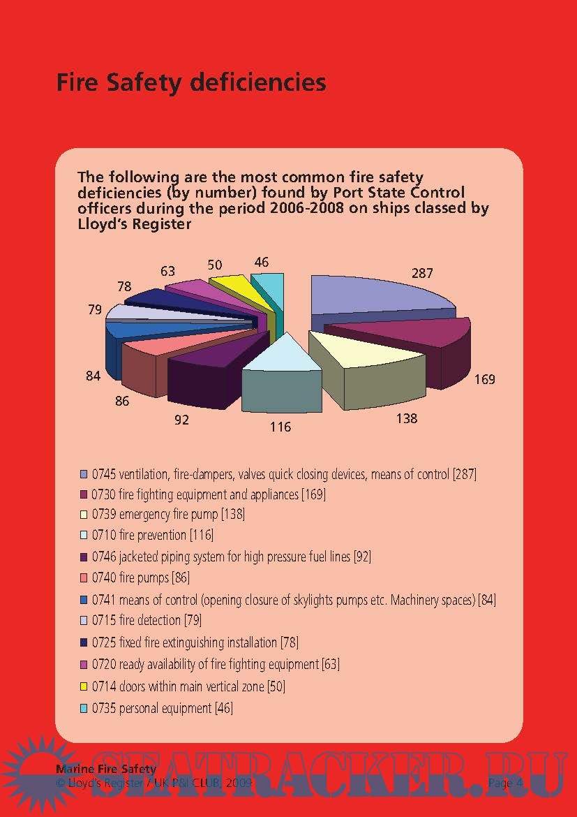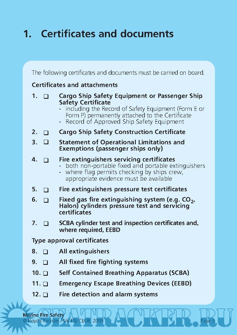 Year: 2009 Language: english Author: Lloyd's & UK P&I Club Genre: Methodological guide Format: PDF Quality: eBook Pages count: 18 Description: During the period 2006-2008, 1216 people were reported killed or missing as a result of 465 incidents of fire and explosions on board merchant seagoing ships of 100 gt and above. 988 of these deaths were from a single incident. It is essential that crew are appropriately trained to inspect, maintain and operate equipment and that the equipment is ready for use at all times. Being prepared can mean the difference between lives lost or lives saved. In conjunction with an industry partner, the UK P&I Club, we have analysed data relating to fire safety, including deficiencies found by Port State Control officers. The result is this re-usable checklist, which highlights the most common deficiencies and lists them by distinct areas of the ship. This means that each crew member can take responsibility for his or her own area.