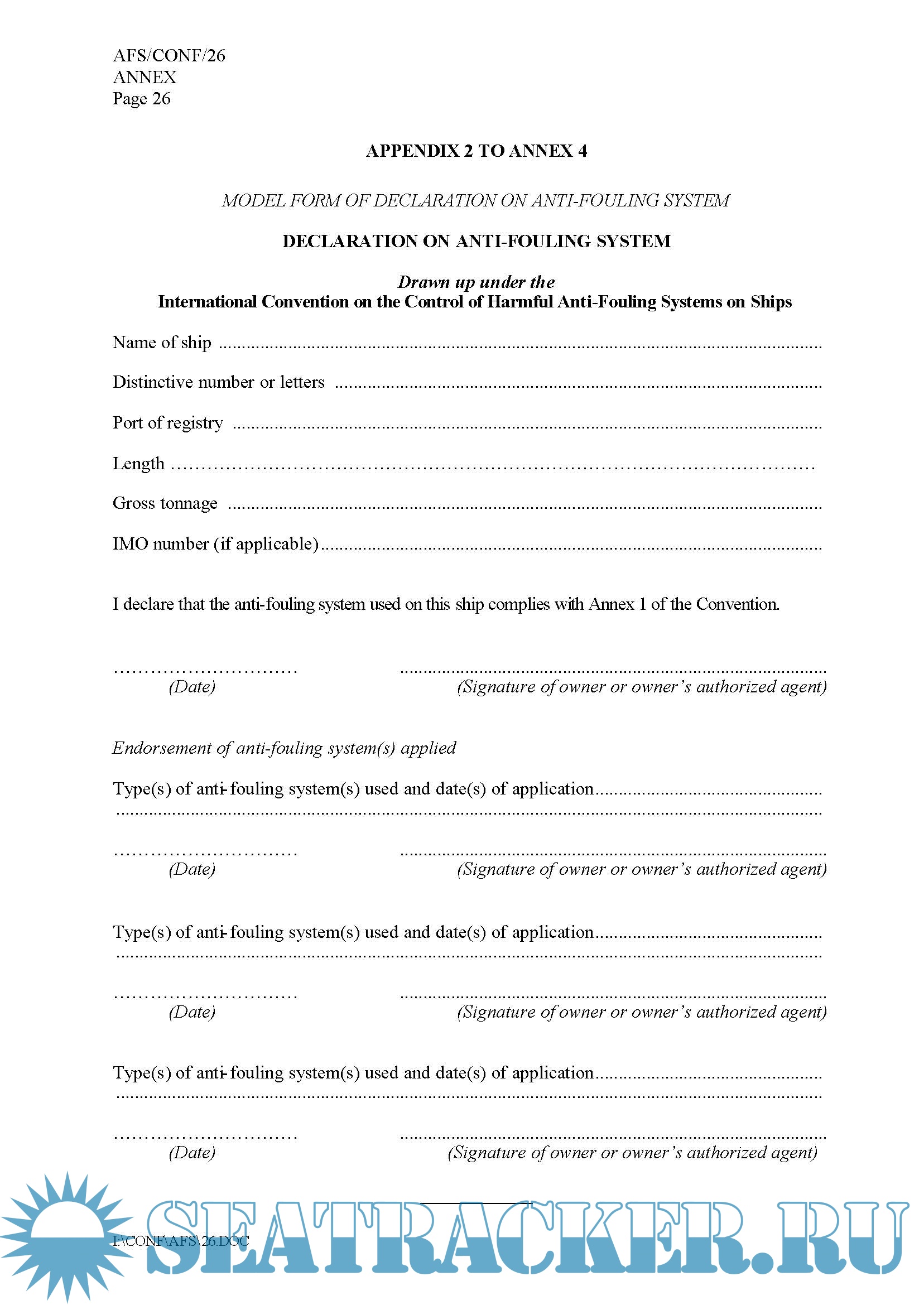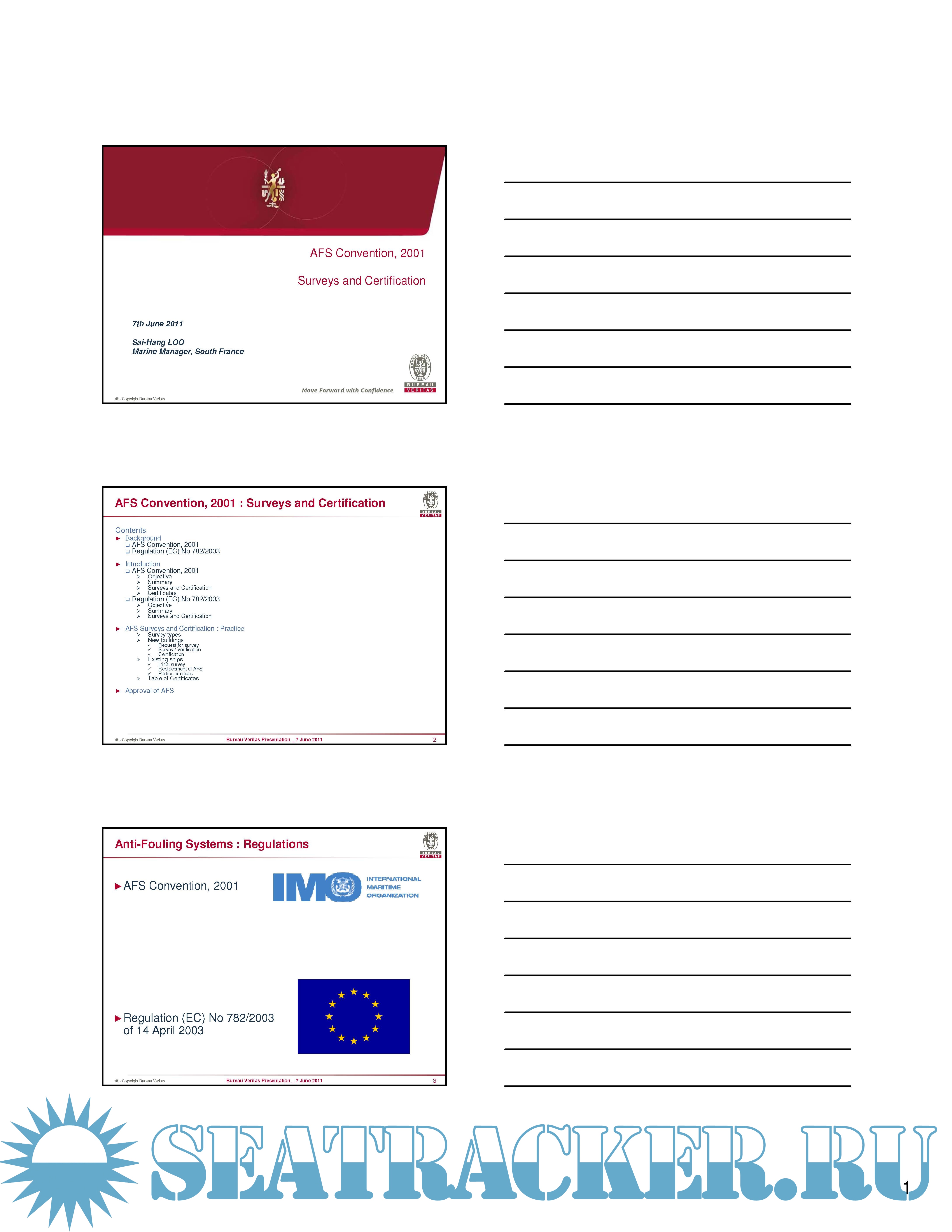 International Convention on the Control of Harmful Anti-Fouling Systems on Ships, AFS Convention, 2001 + IMO Anti-fouling systems 2002 + BV 2011 Presentation AFS Convention, 2001 Surveys and Certification
