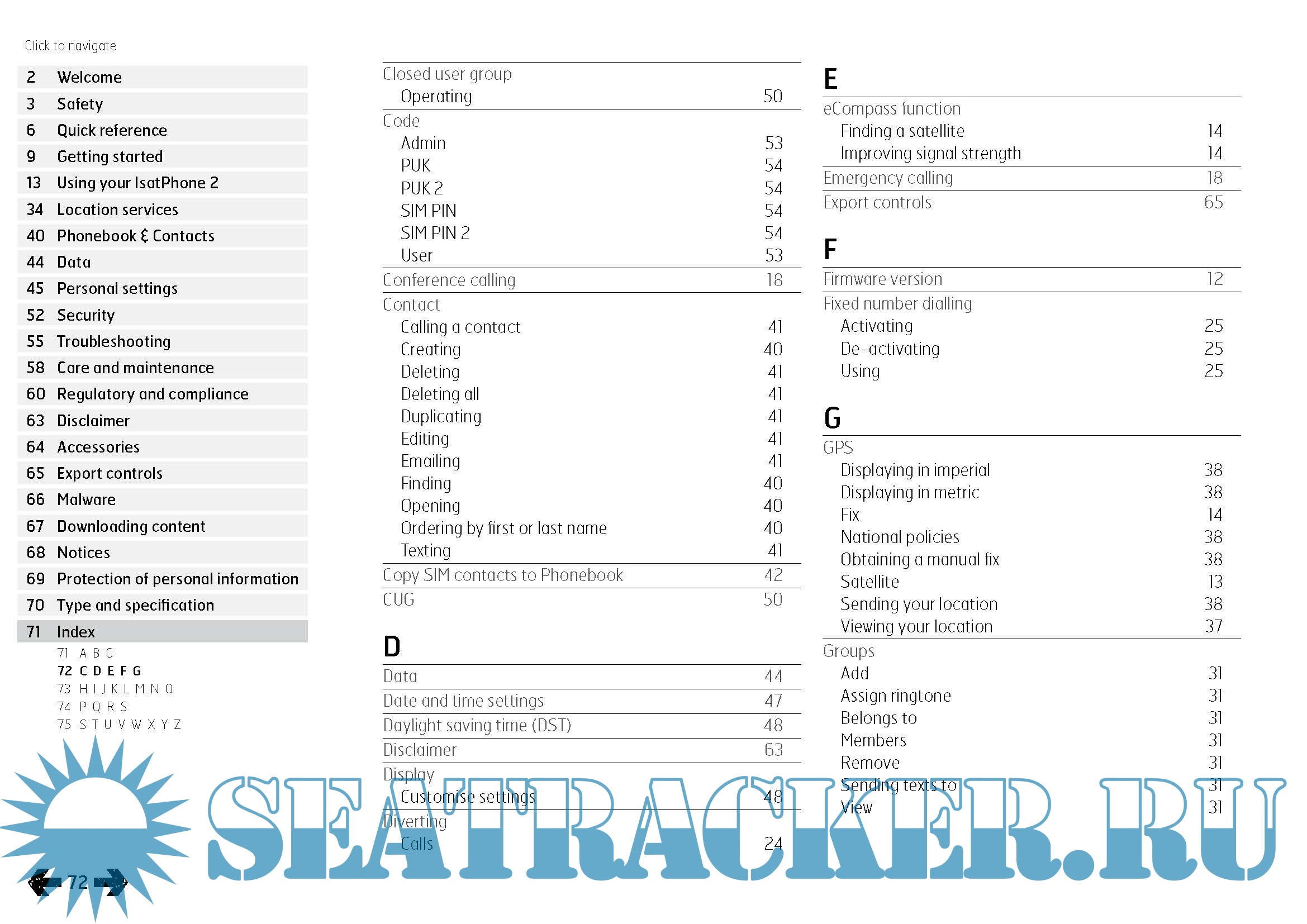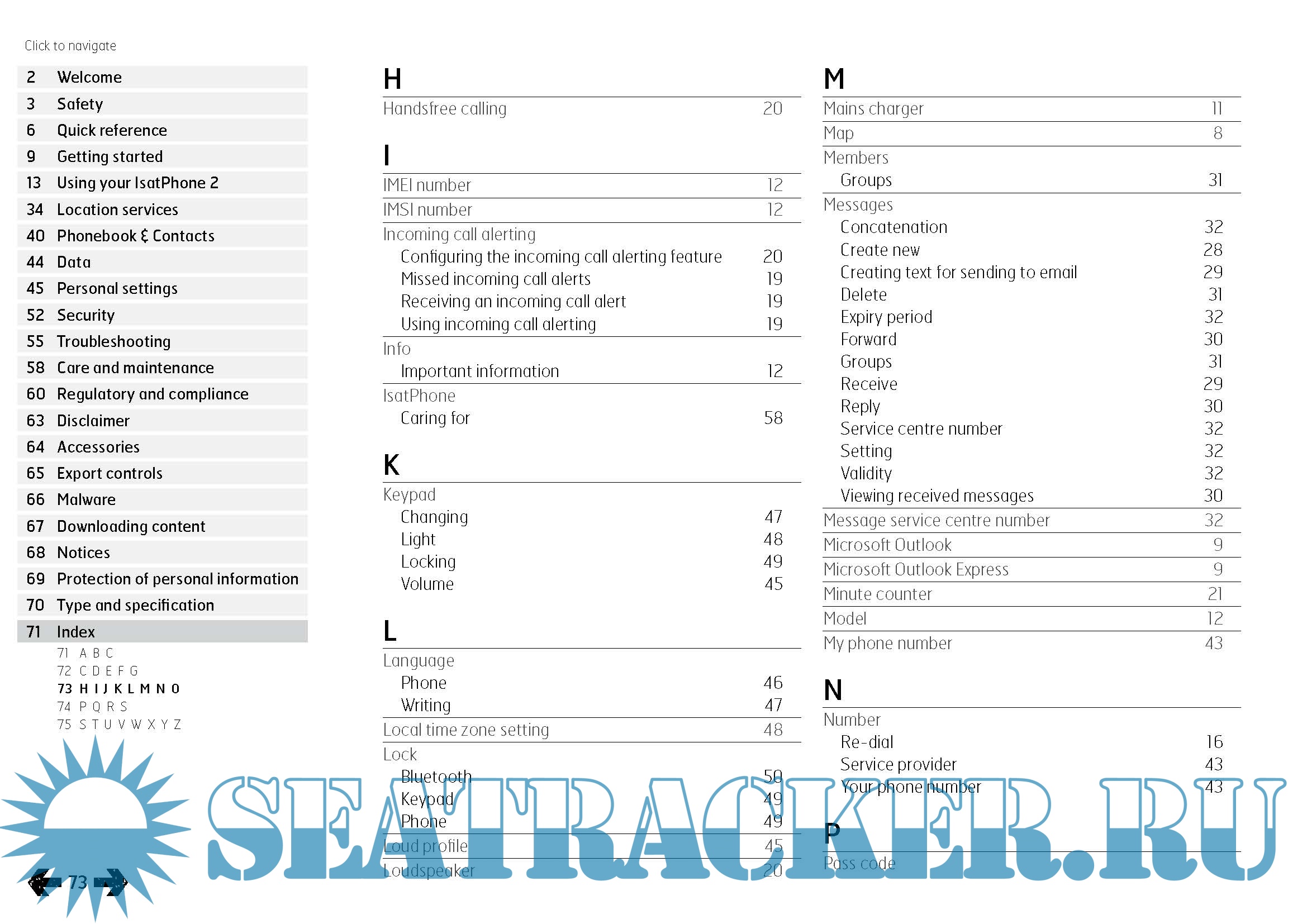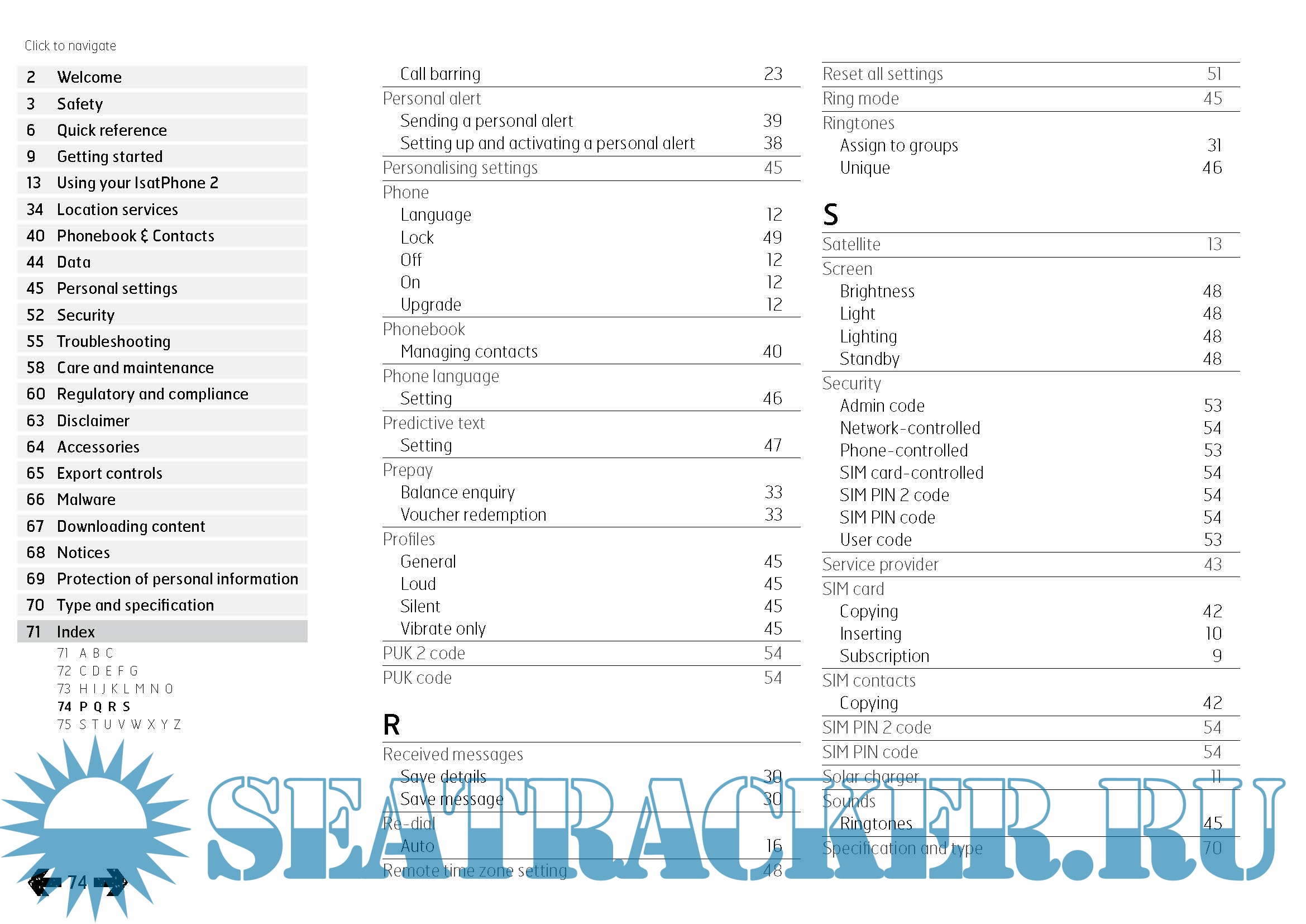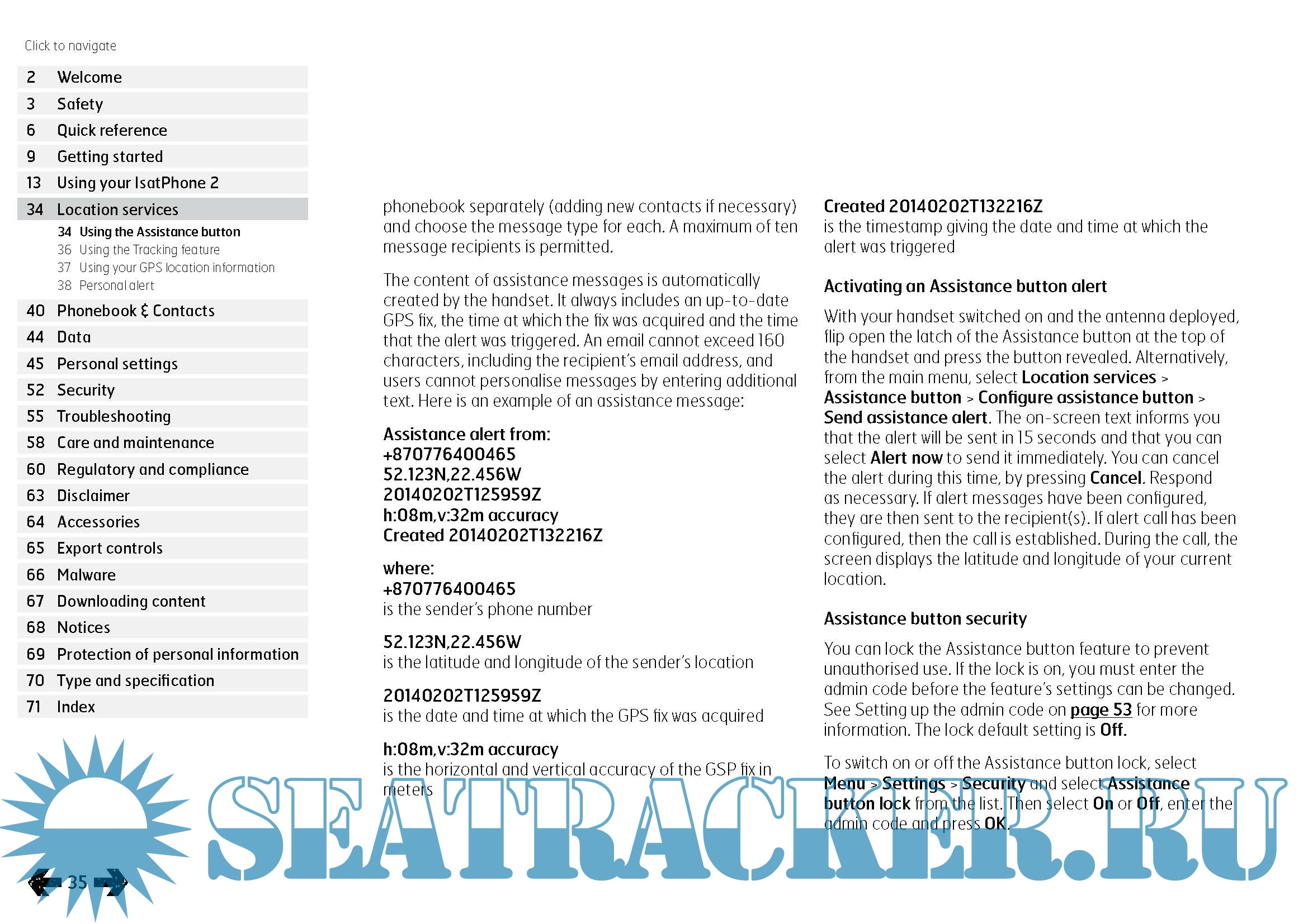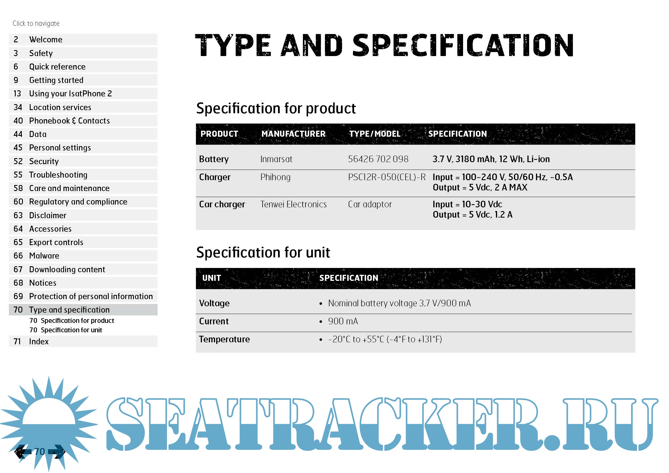 Year: 2014 Language: english Author: Inmarsat Global Limited Genre: Manual Format: PDF Quality: eBook Pages count: 76 Description: IsatPhone 2 operates globally over the Inmarsat-4 satellites and Alphasat. From November 2013, Alphasat coverage prioritises the region north of 44°S, and service may degrade south of this latitude. The coverage map applies to both IsatPhone Pro and IsatPhone 2.