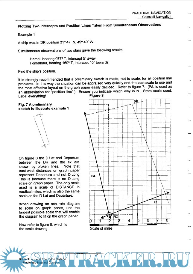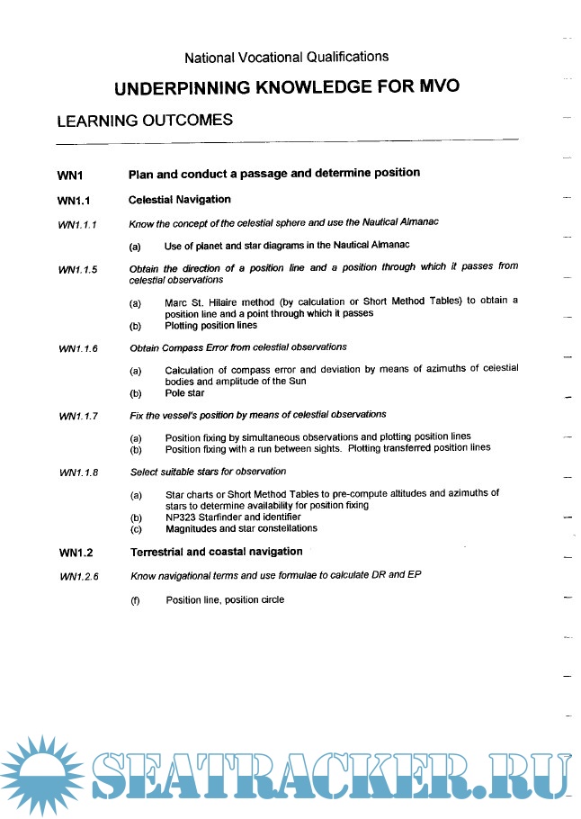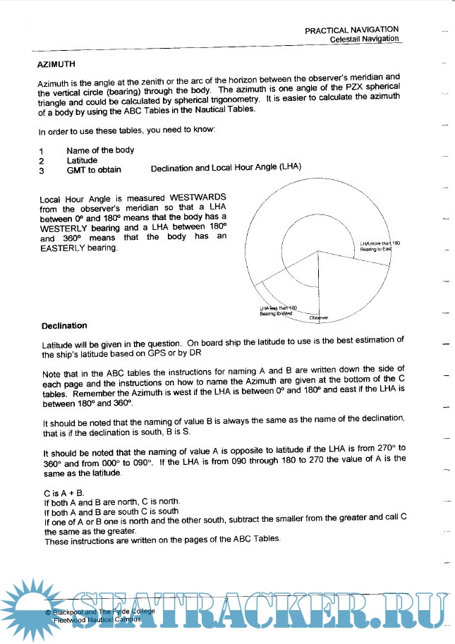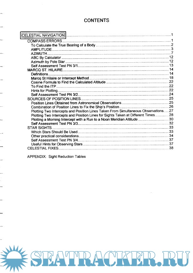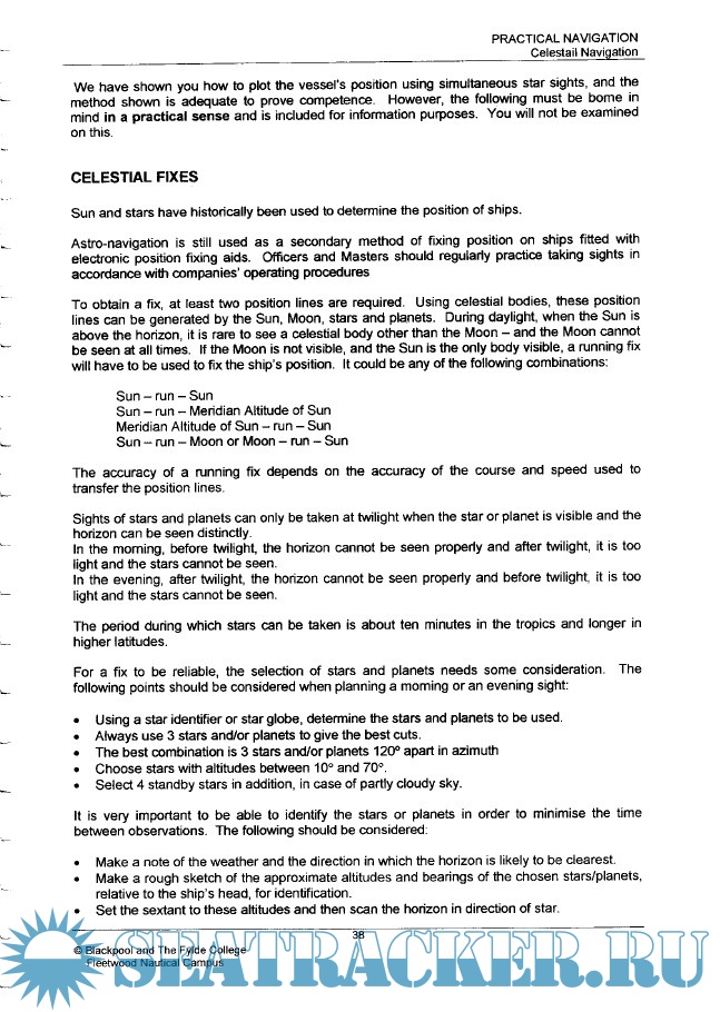 Year: 2006 Language: english Author: Blackpool and The Fylde College Fleetwood Nautical Campus Genre: Training courses Publisher: Blackpool and The Fylde College Fleetwood Nautical Campus Format: PDF Quality: OCR with errors Pages count: 44 Description: Learning Outcomes: Know the concept of the celestial sphere and use the Nautical Almanac. Obtain the direction of a position tine and a position through which it passes from ceIestiaI observations. Obtain Compass Error from celestial observations. Fix the vessel's position by means of celestial observations. Select suitable stars for observation. Know navigational terms and use of formulae to calculate DR and EP.