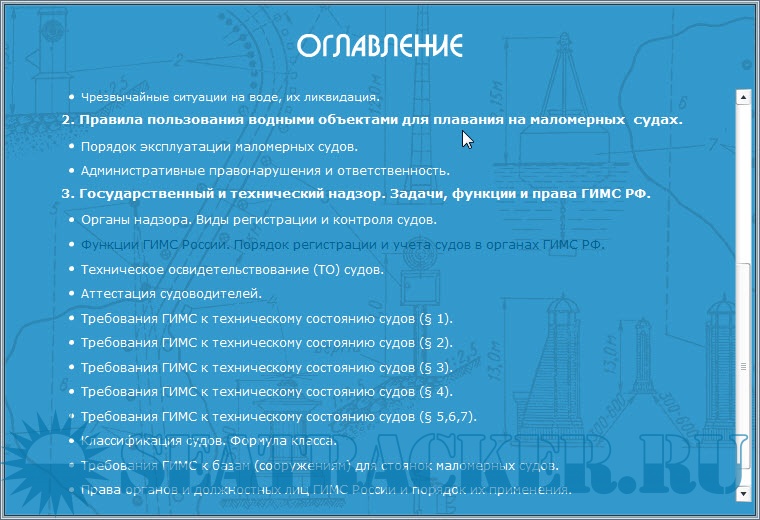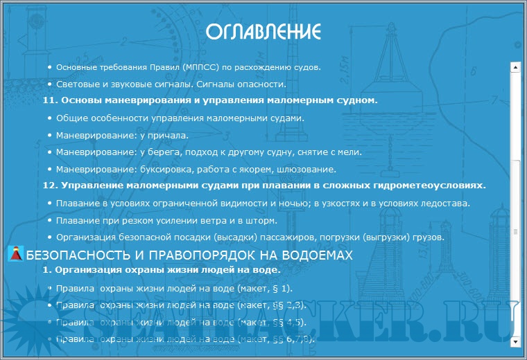 Описание: Обучающая программа для подготовки судоводителей маломерных судов - электронный учебник, предназначенный для подготовки к экзаменам на право управления маломерными судами, поднадзорными ГИМС МЧС России, в различных районах плавания.