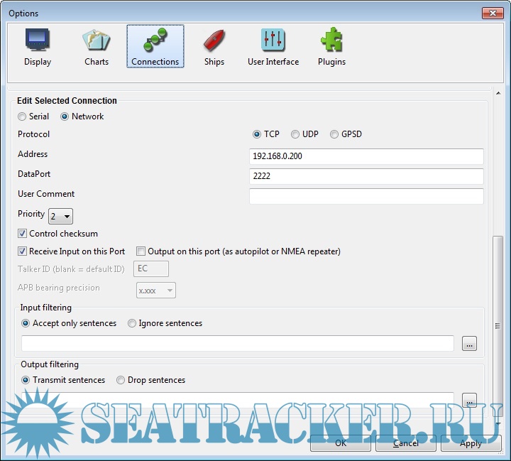 Can playback pre-recorded GPS files with NMEA output.-Очень простой эмулятор GPS - позволяет посмотреть как работает OpenCpn "вживую". Настройки очень проста - устанавливаем порт для TCP, и тот же порт прописываем в OpenCpn ( см скрин), адрес у вас почти наверняка будет 127.0.0.1 ( если вы ставили иное - то вы устанавливаете его). Для тех кто использует Google Chrome есть еще дополнение к нему https://chrome.google.com/webst...=chrome-ntp-icon - там еще передается по NMEA глубина, ветер и прочие ништяки ...